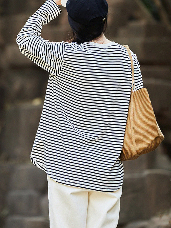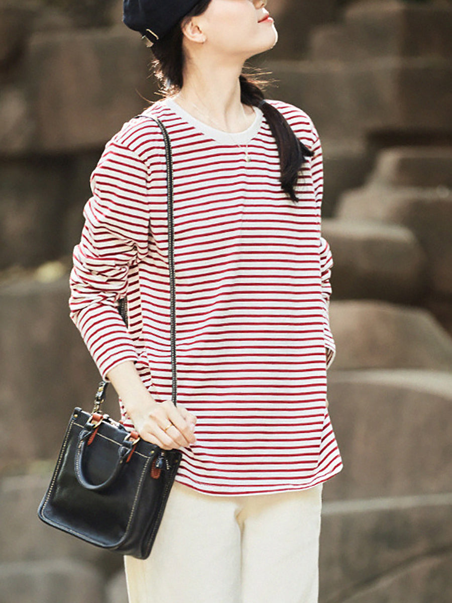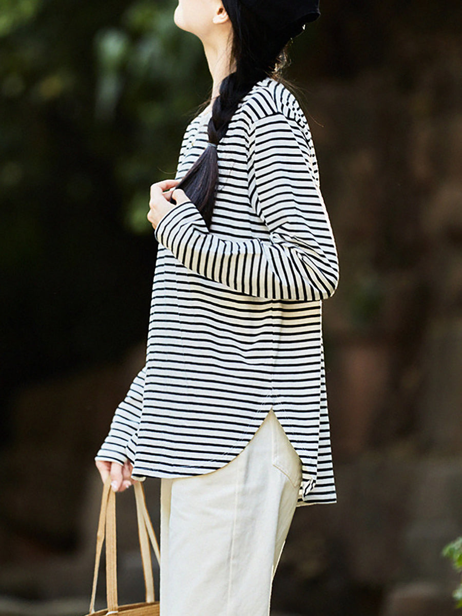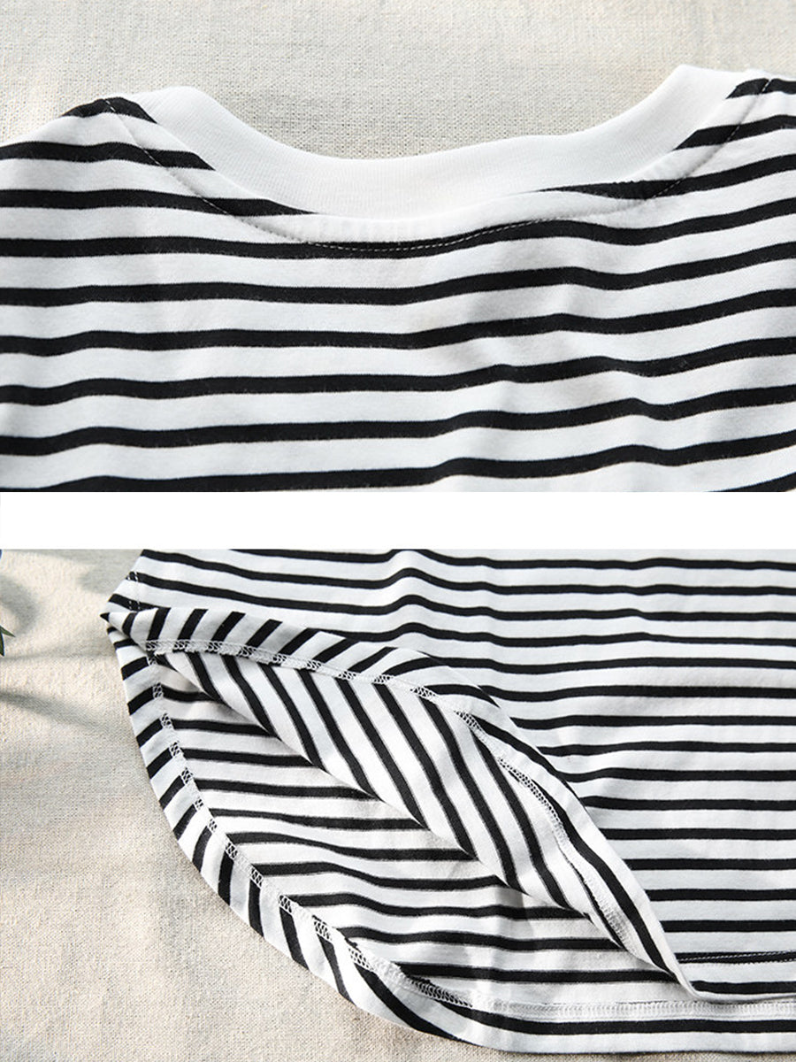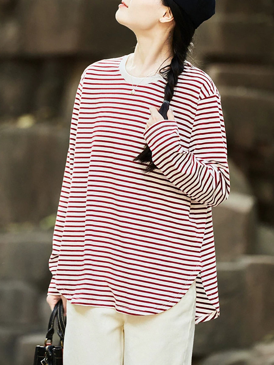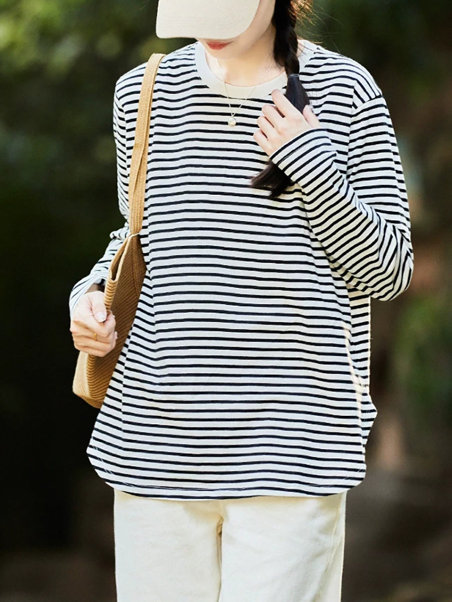 Blusa de verano a rayas con cuello redondo para mujer, 100 % algodón