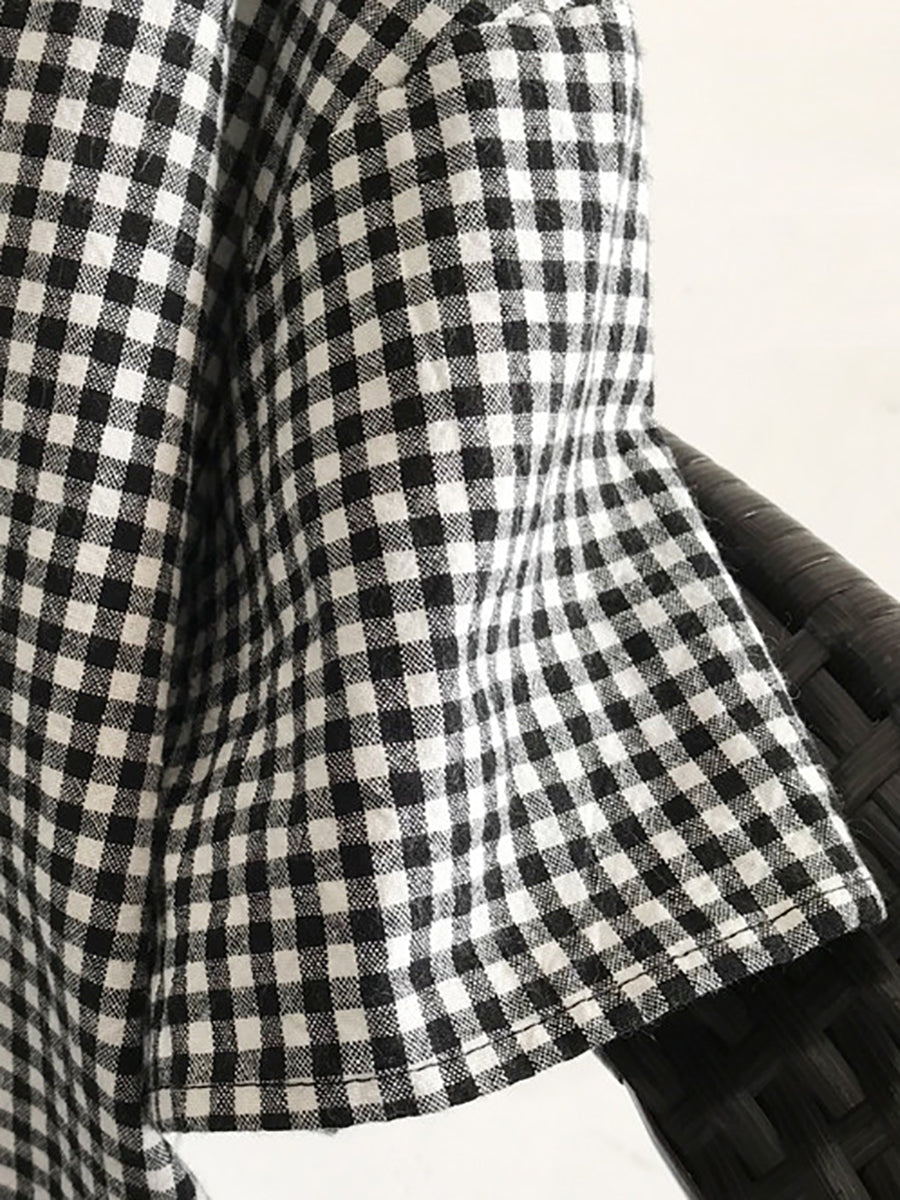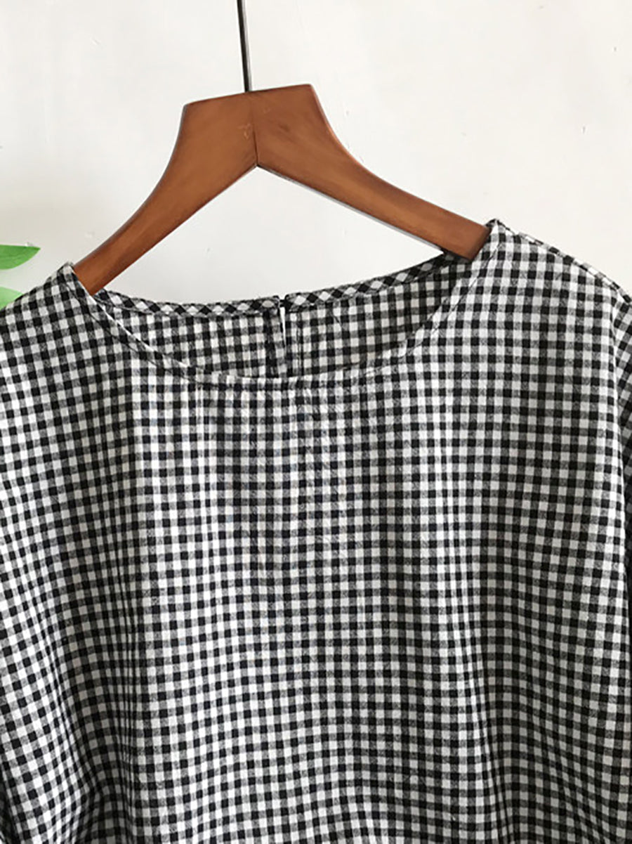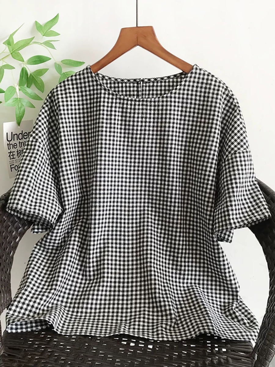 Blusa de verano versátil de cuello redondo con estampado de rejilla para mujer