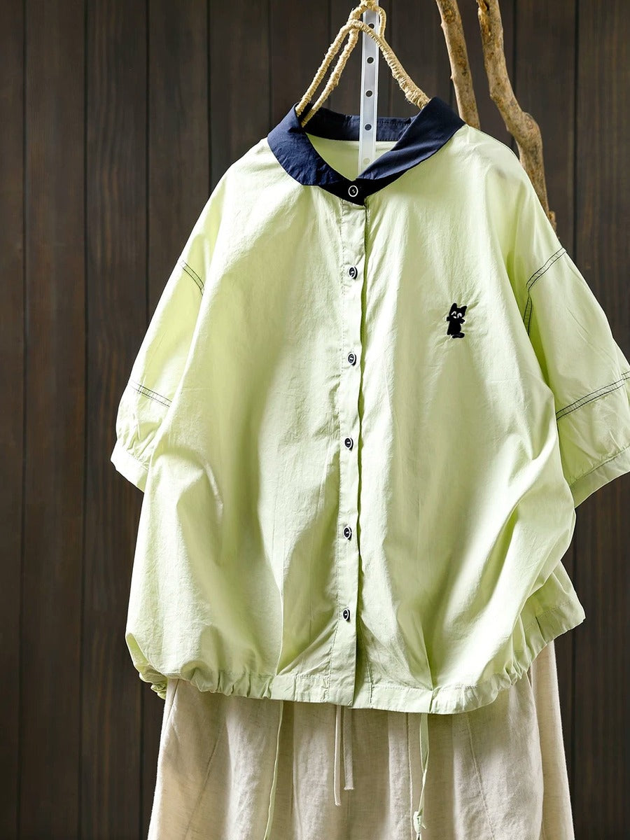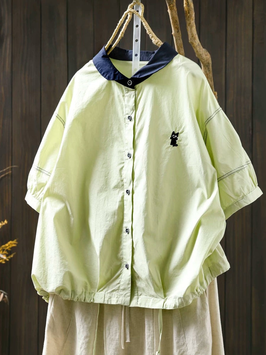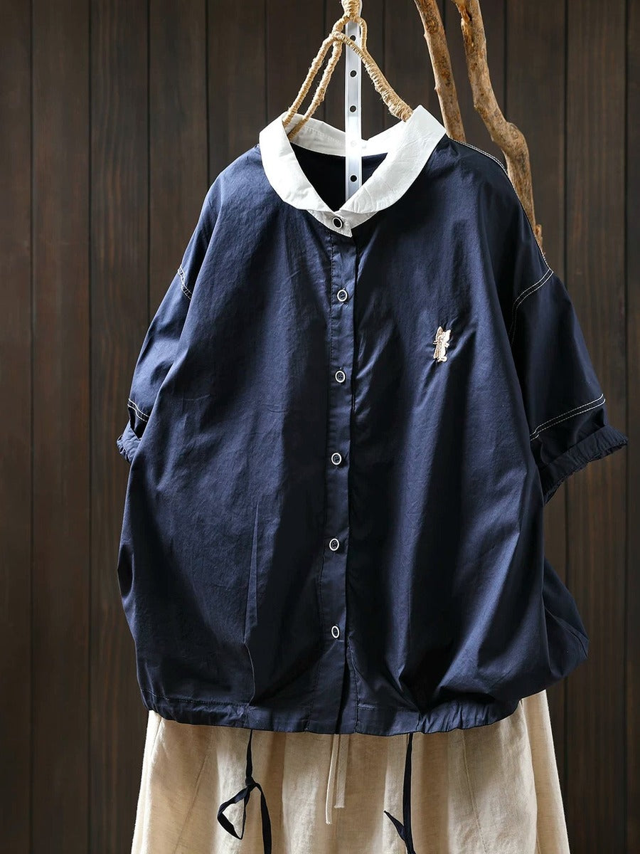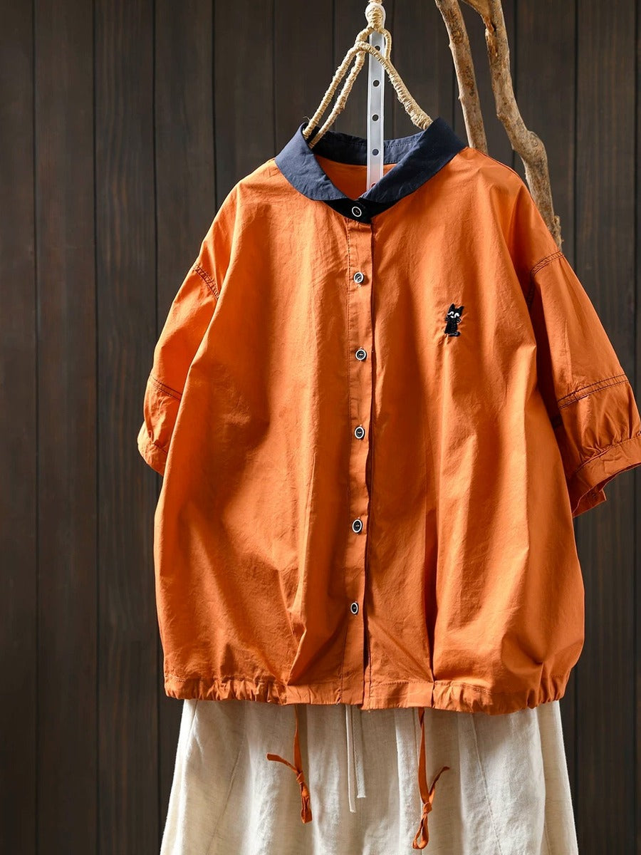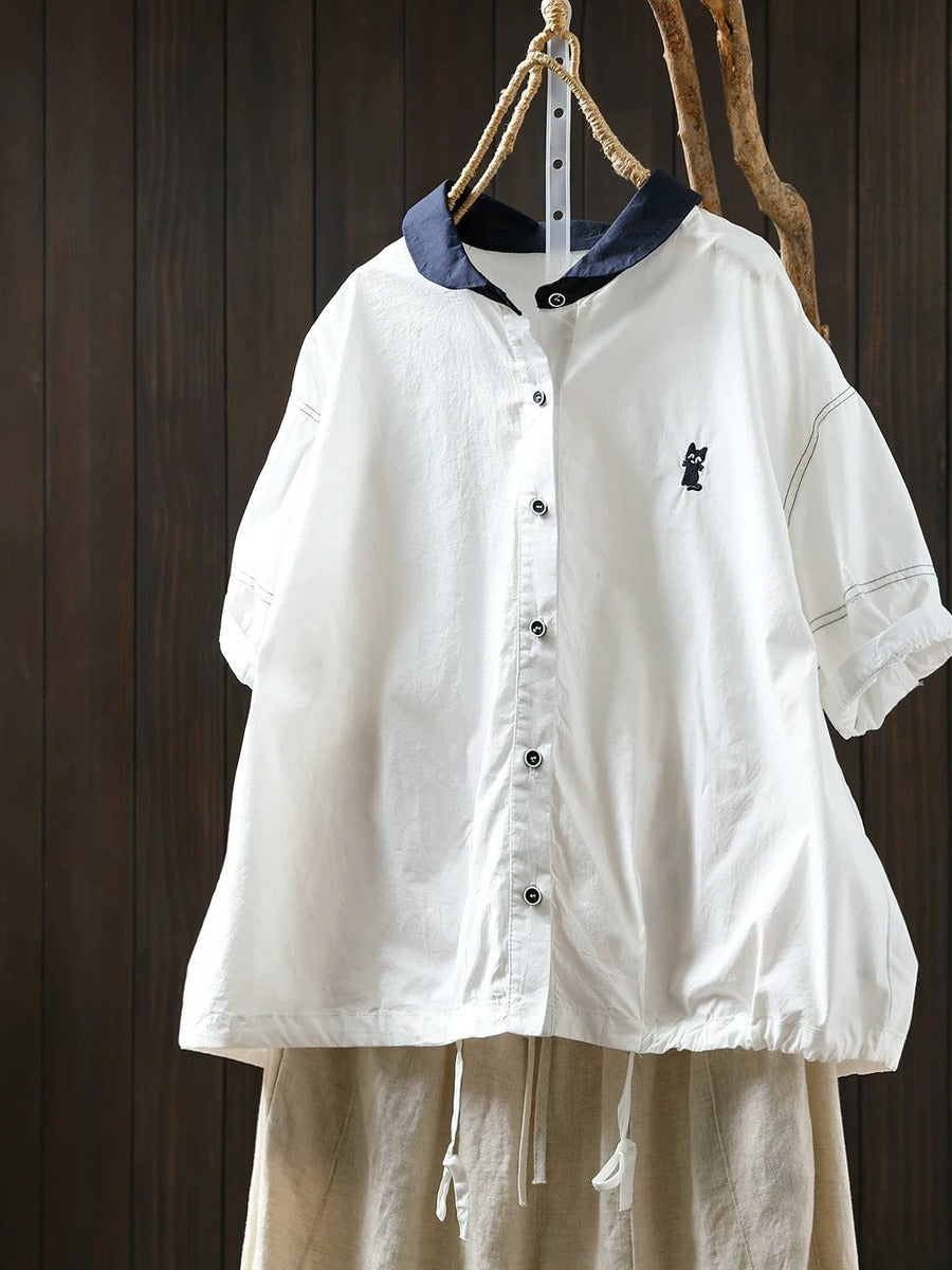 Camisa de mujer de algodón vintage bordada con cuello vuelto para verano