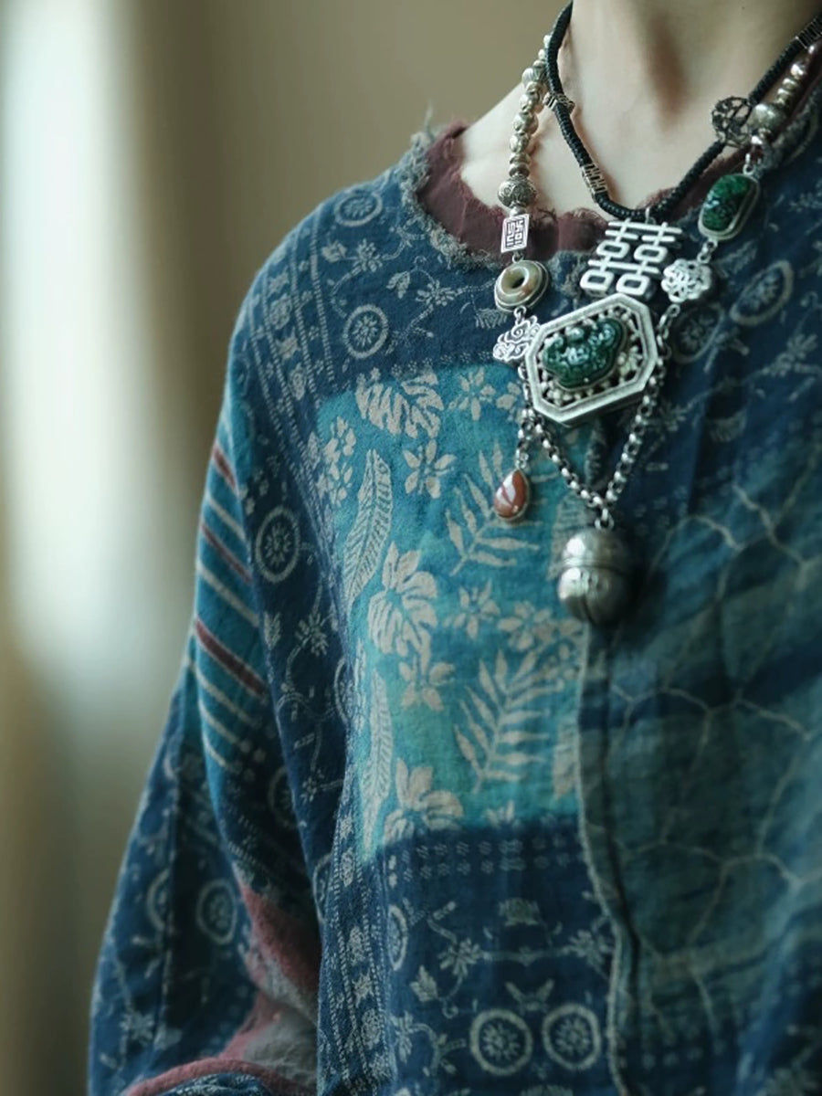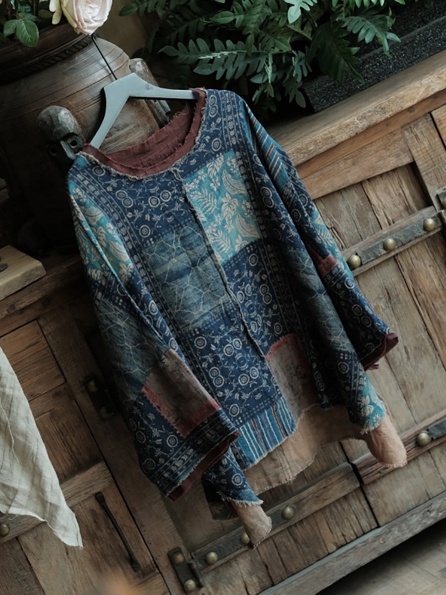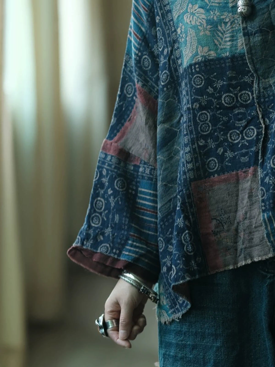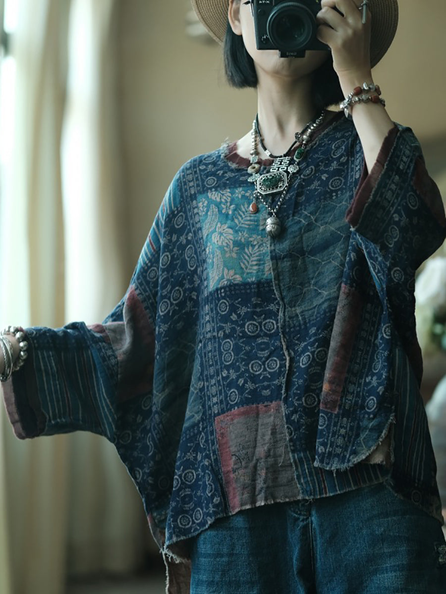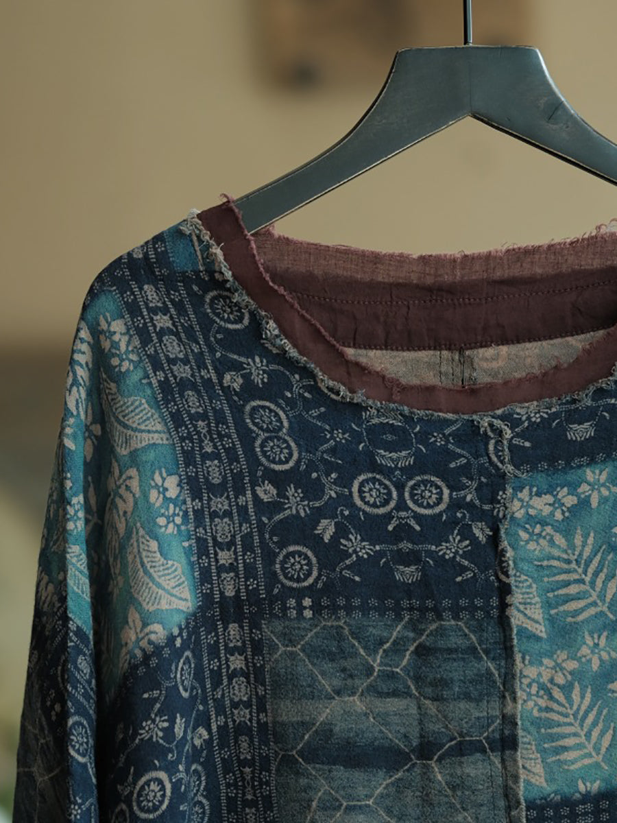 Camisa de algodón con cuello redondo y patchwork vintage de verano para mujer