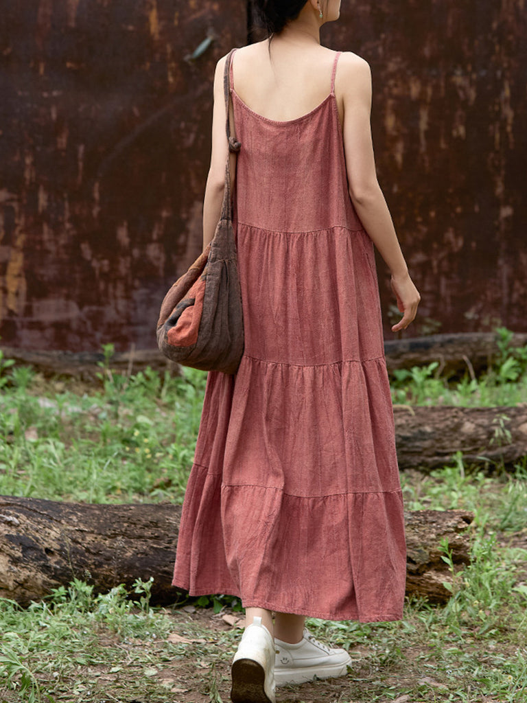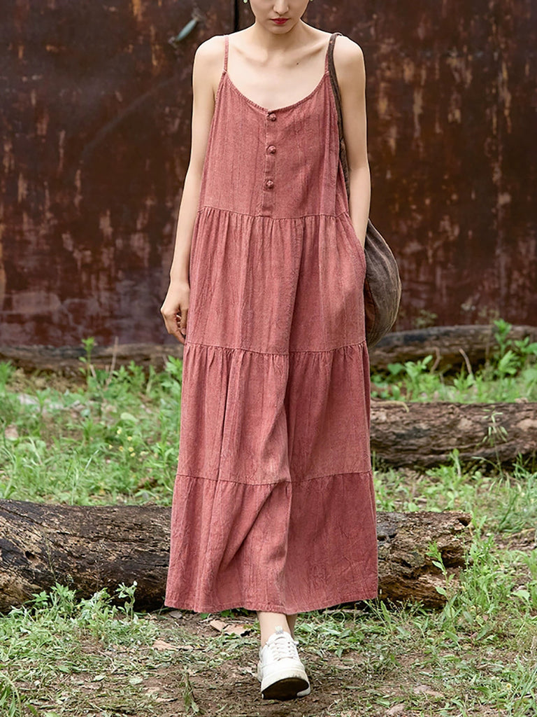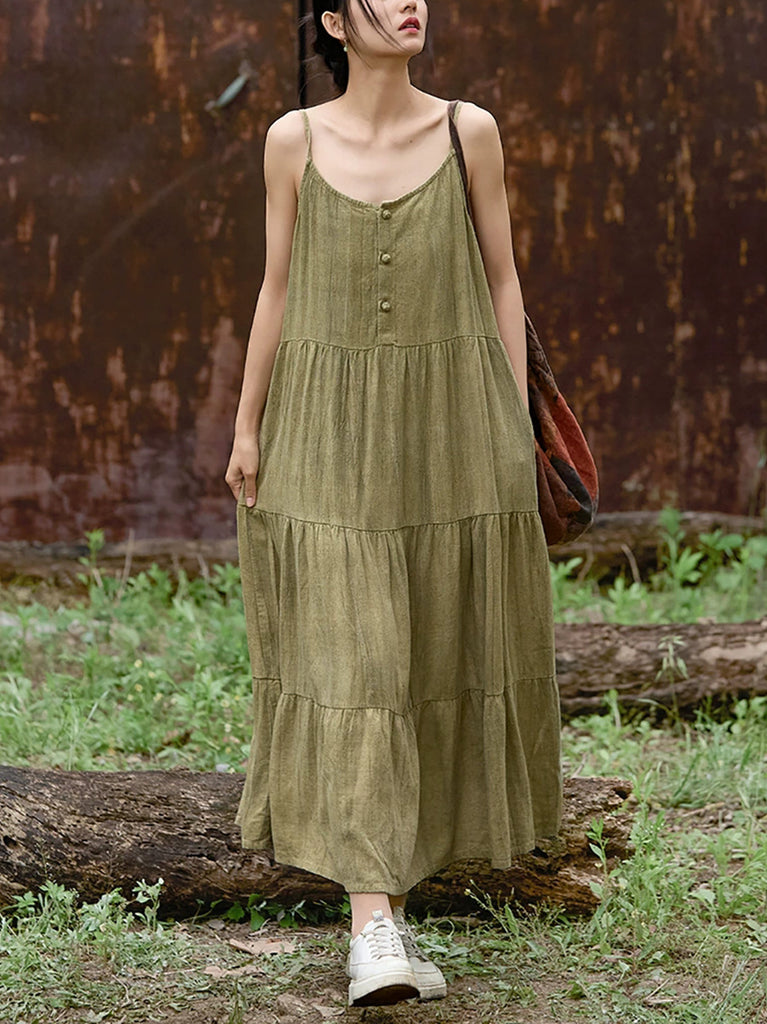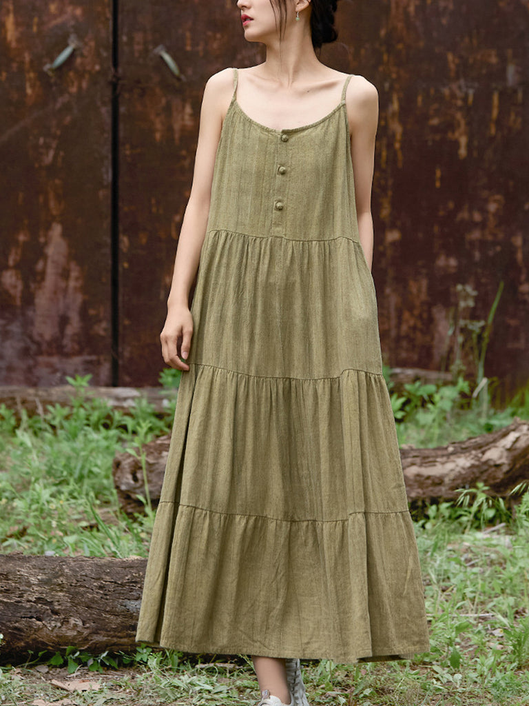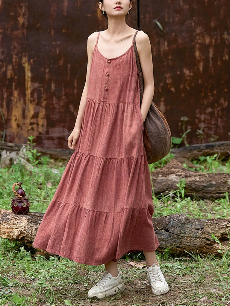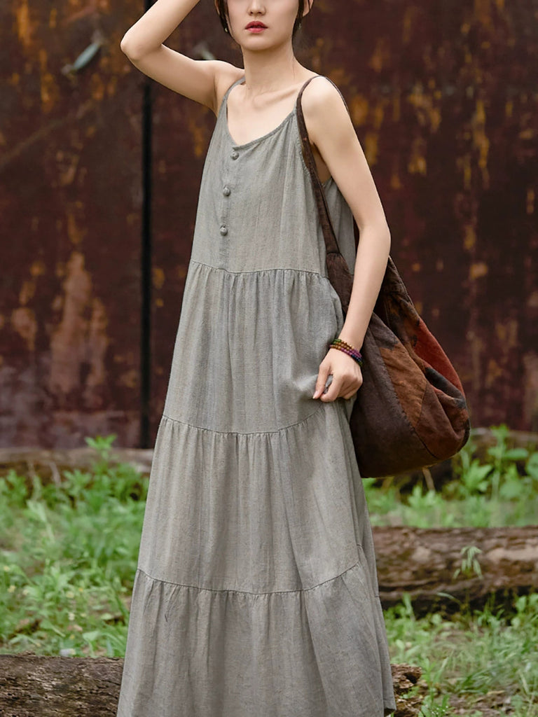 Vestido largo de lino con cuello redondo y color puro vintage de verano para mujer