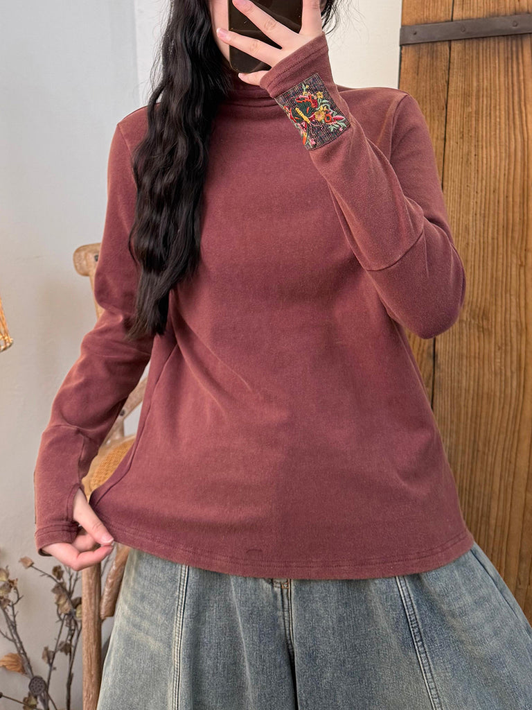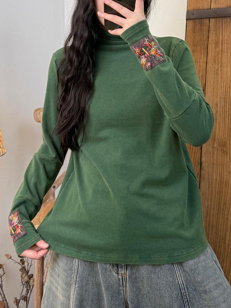 Blusa de algodón con cuello alto y parche bordado vintage de otoño para mujer