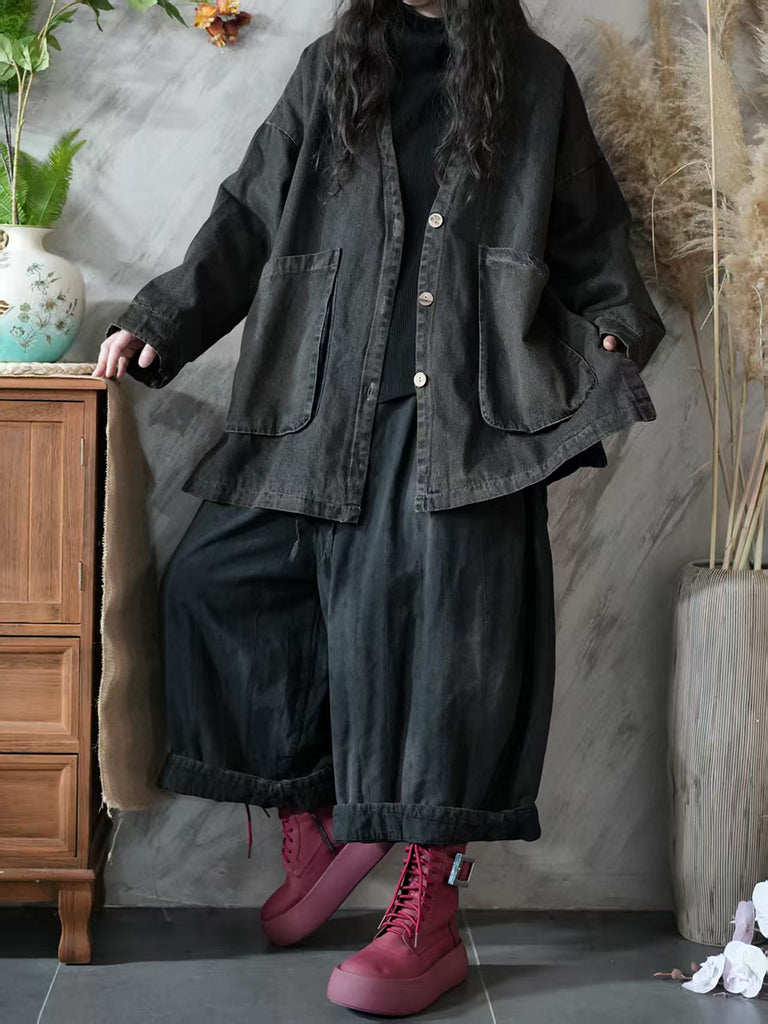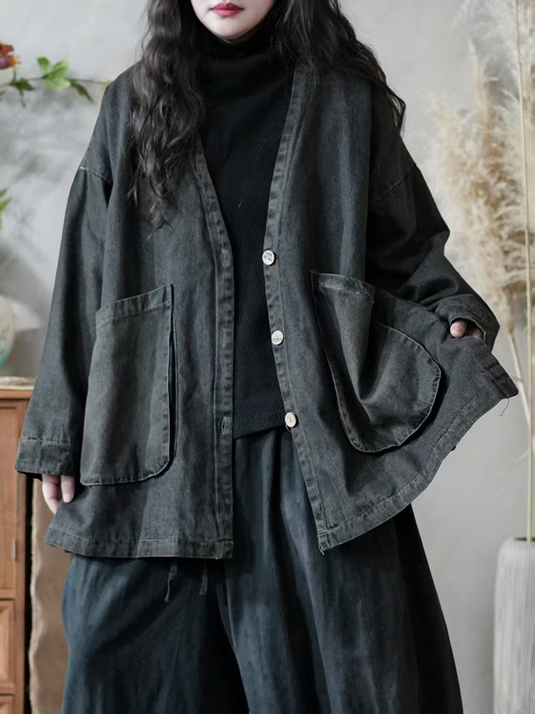 Abrigo vaquero vintage de otoño con cuello en V y color puro para mujer