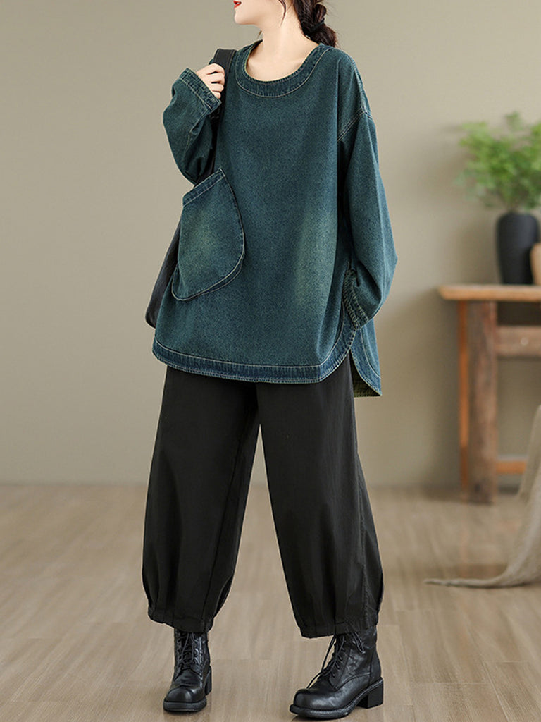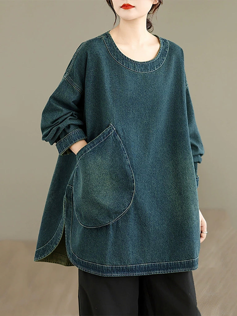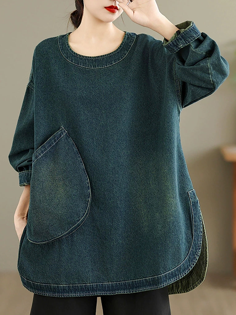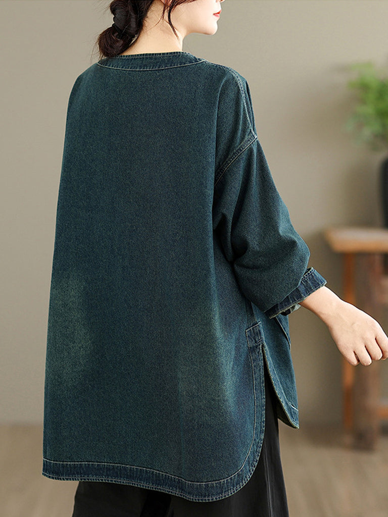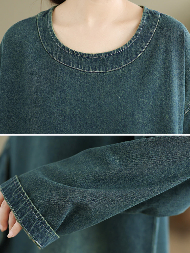 Camisa vaquera vintage de otoño con cuello redondo y color puro para mujer