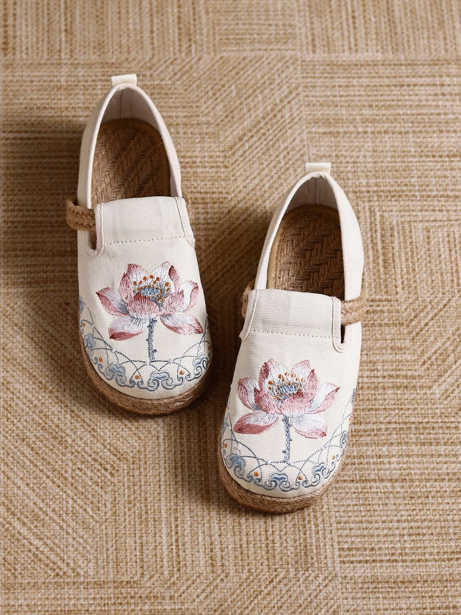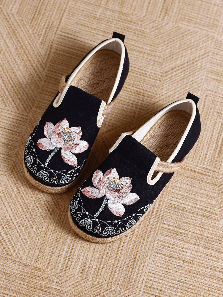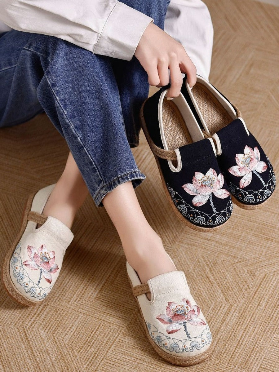 Calzado vintage de algodón y lino, elaborado a mano con detalles artesanales. Cómodo y transpirable para uso diario.