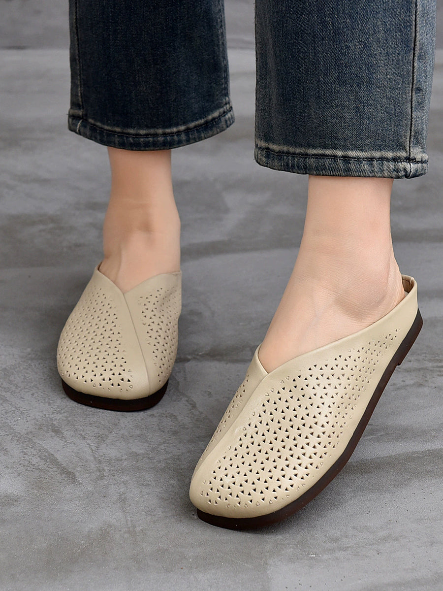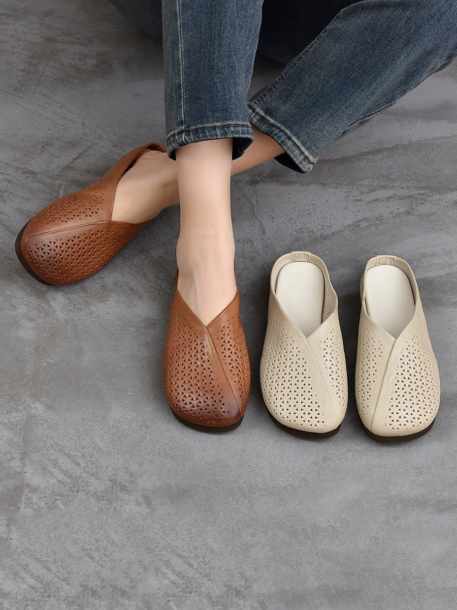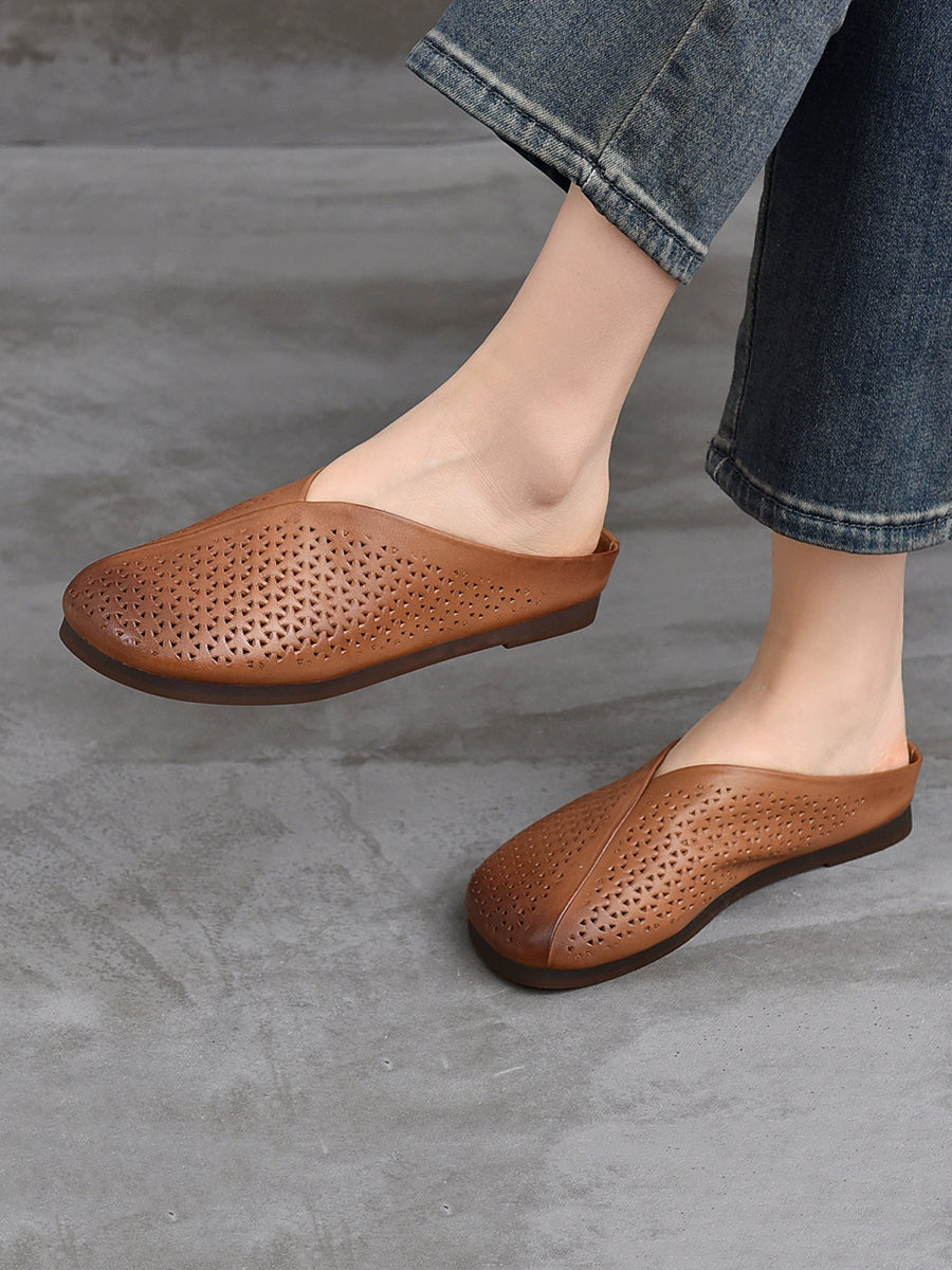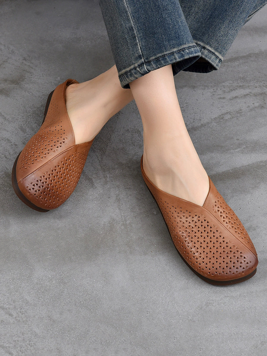 Pantuflas planas suaves de piel auténtica vintage para mujer