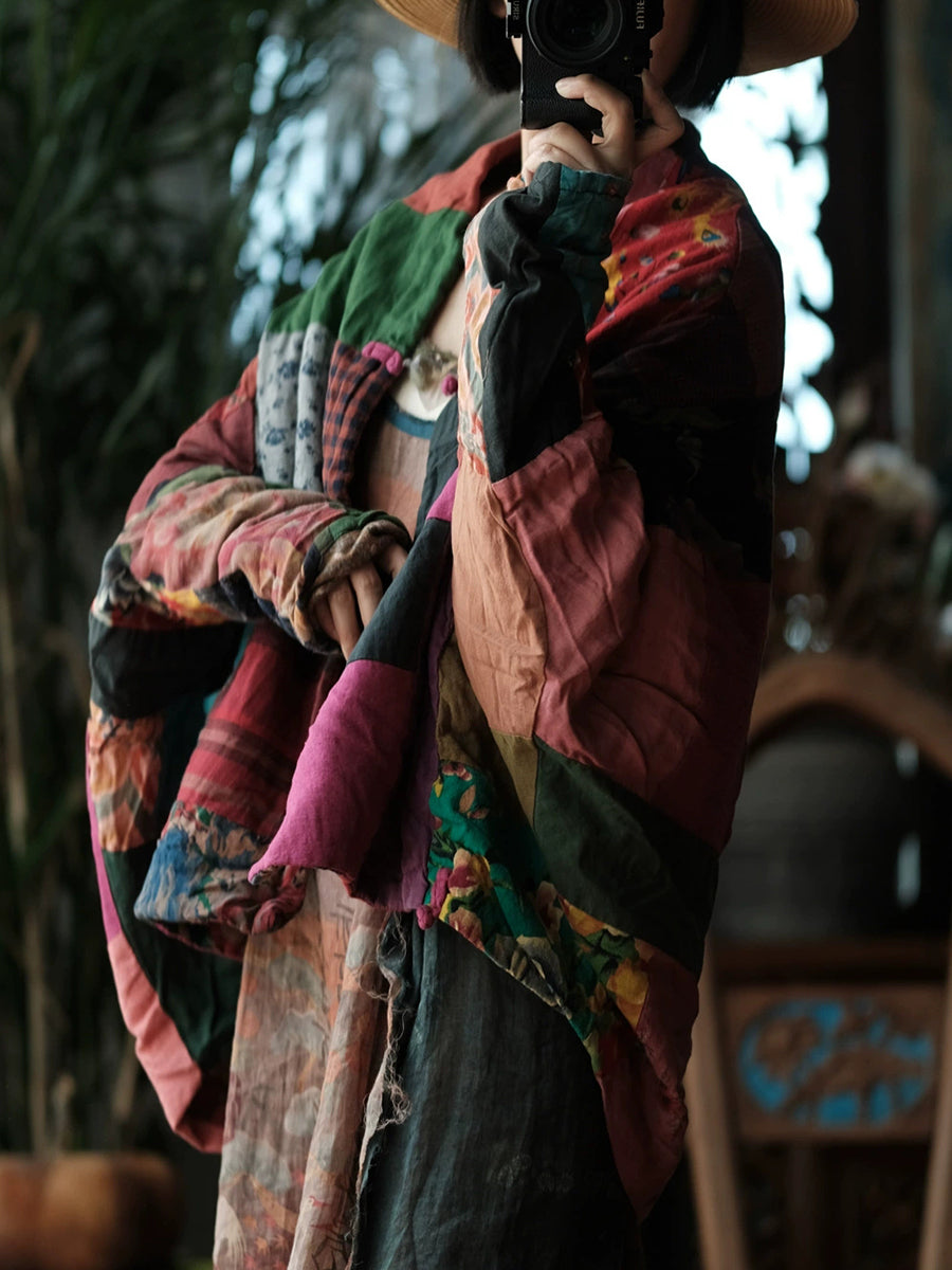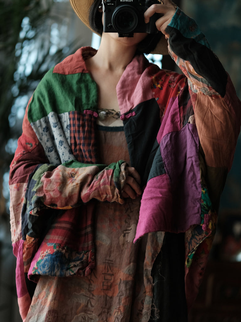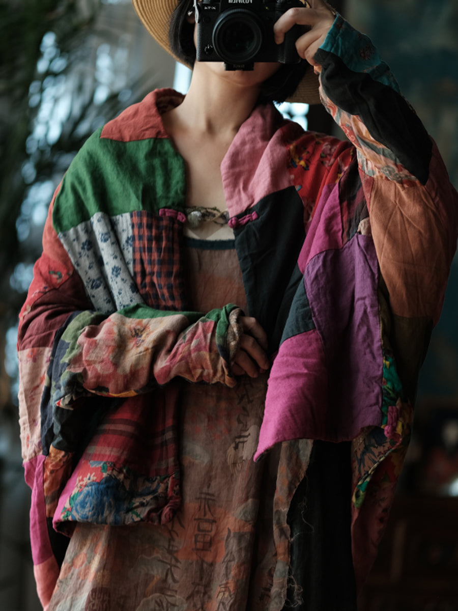 Abrigo acolchado de algodón con mangas murciélago y patchwork vintage para mujer