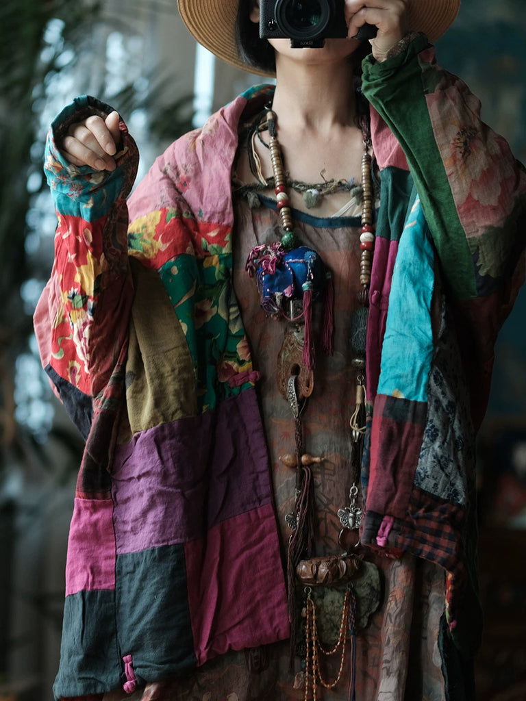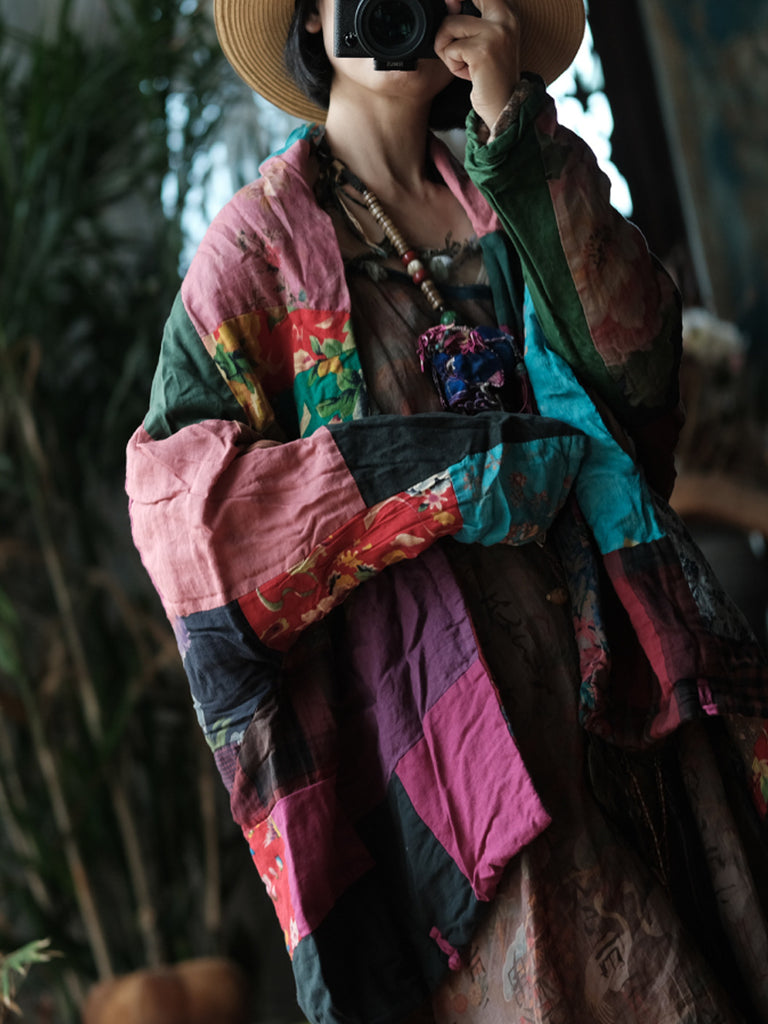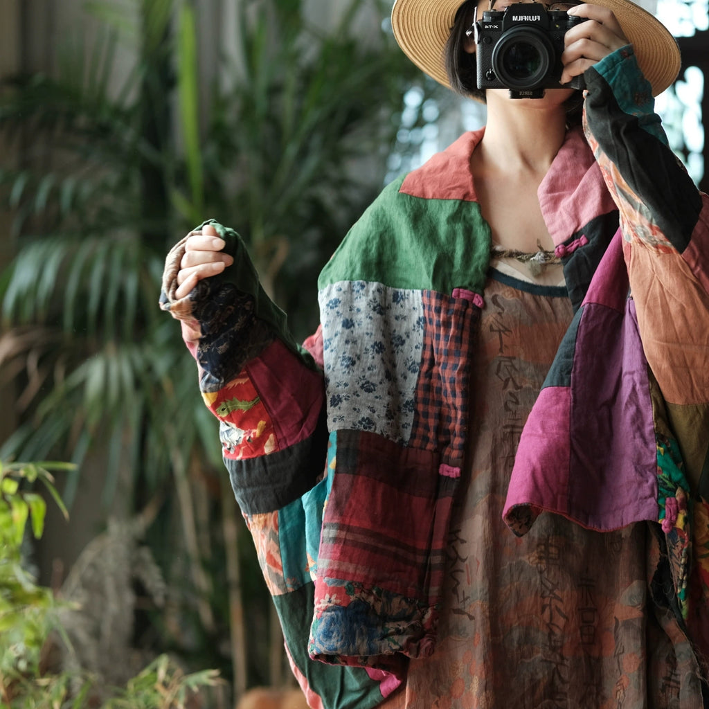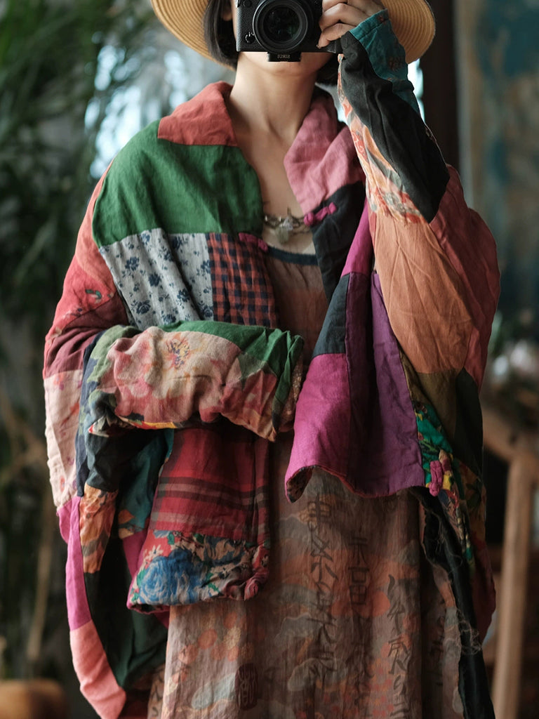 Abrigo acolchado de algodón con mangas murciélago y patchwork vintage para mujer