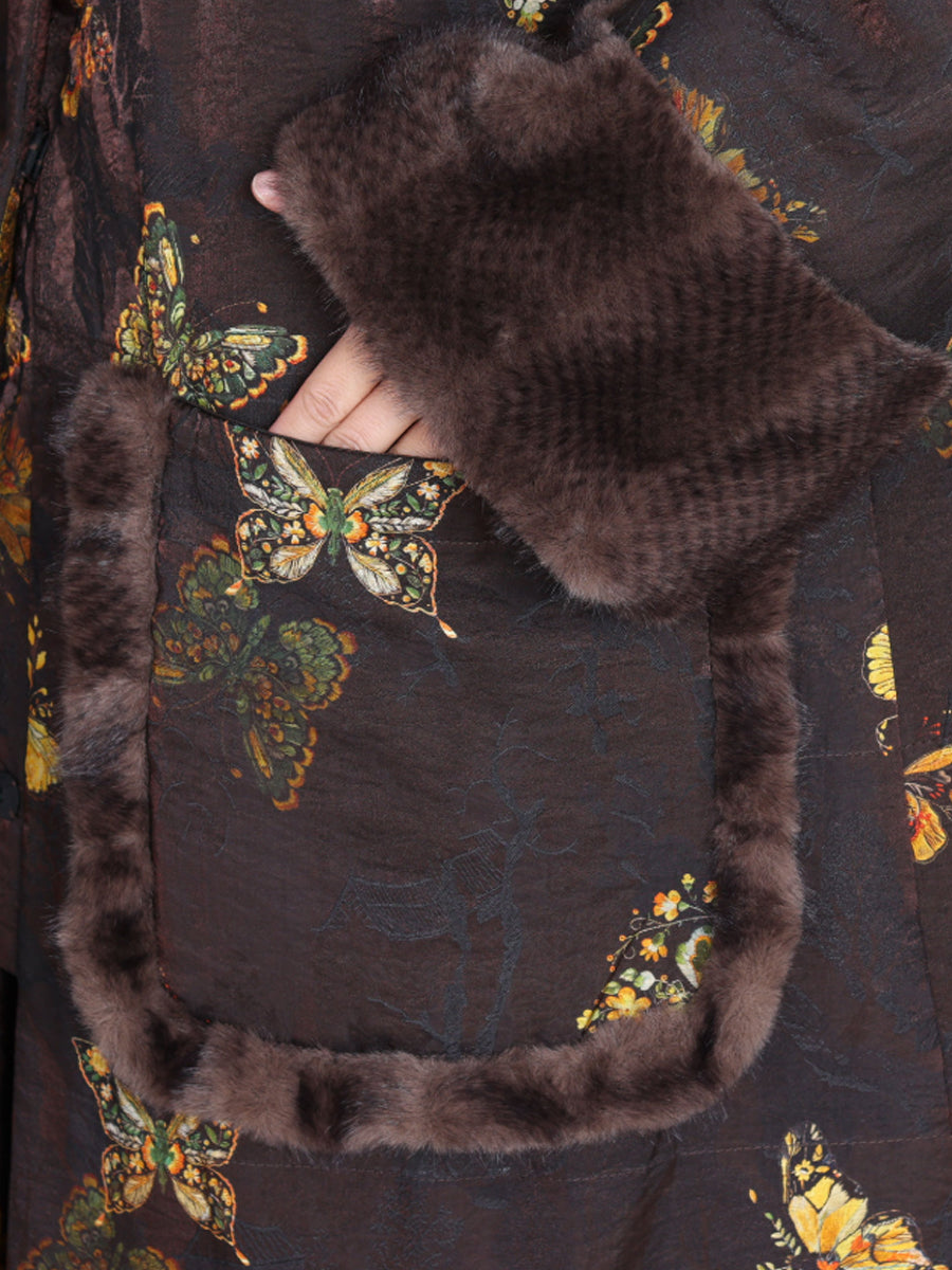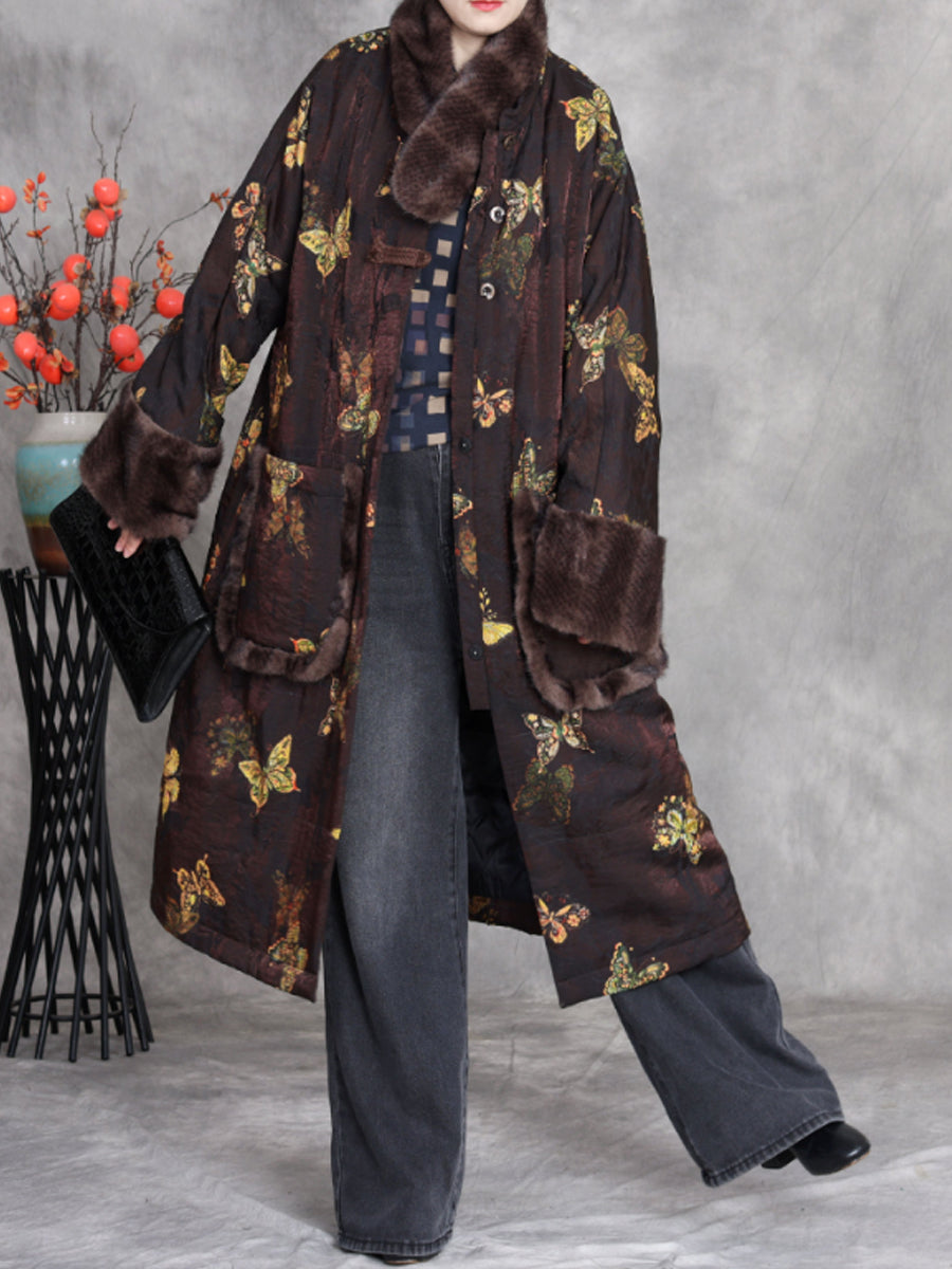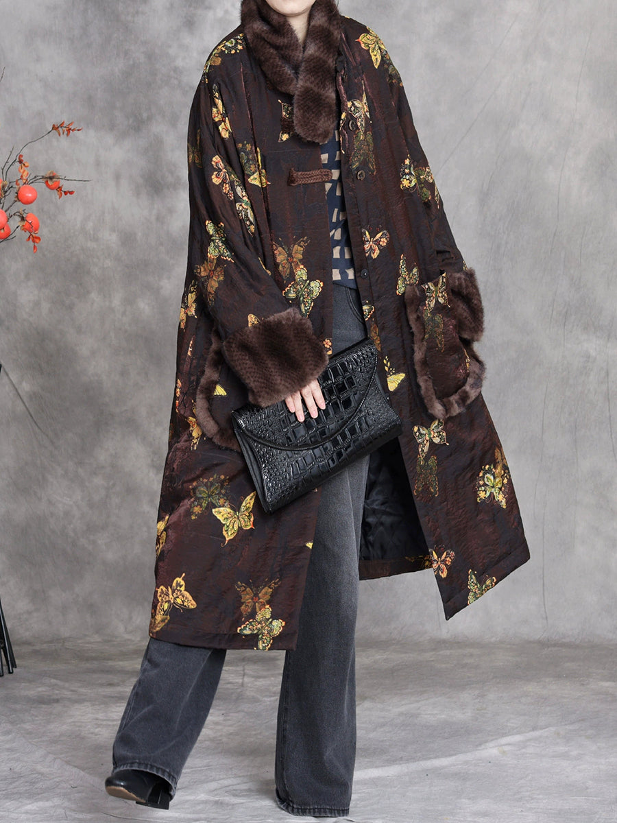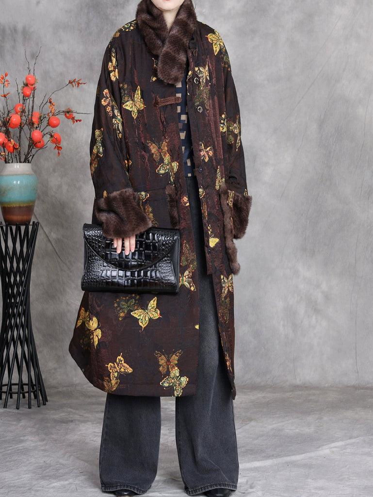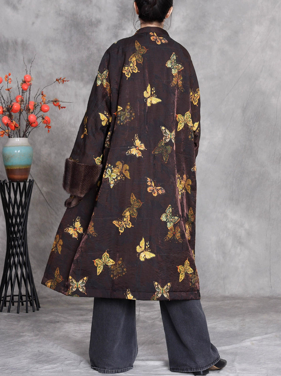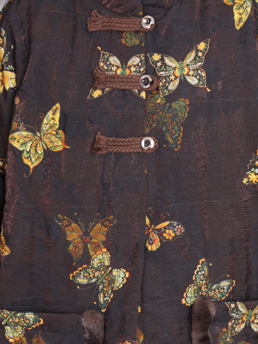 Abrigo acolchado vintage de algodón con cuello redondo y mariposas para mujer