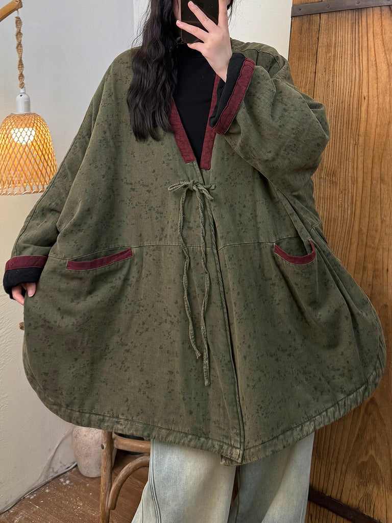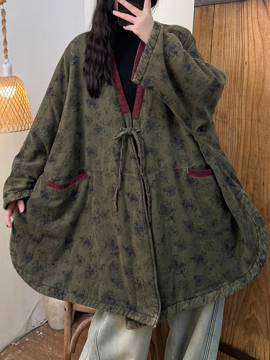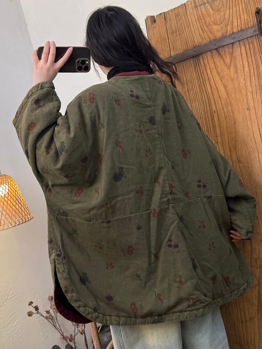 Abrigo de invierno vintage para mujer con cuello en V y estampado floral