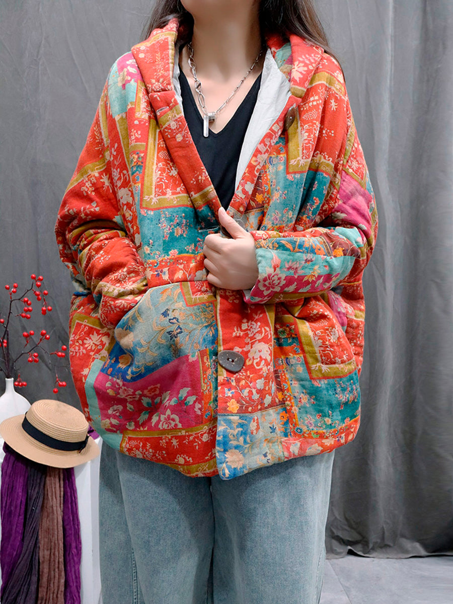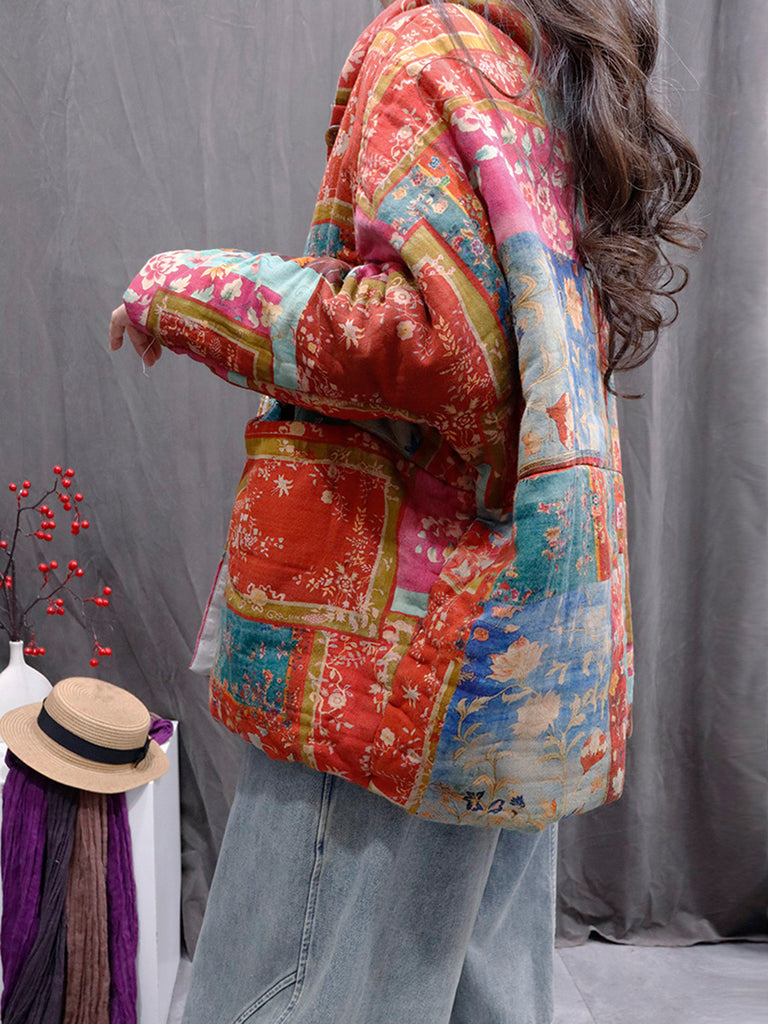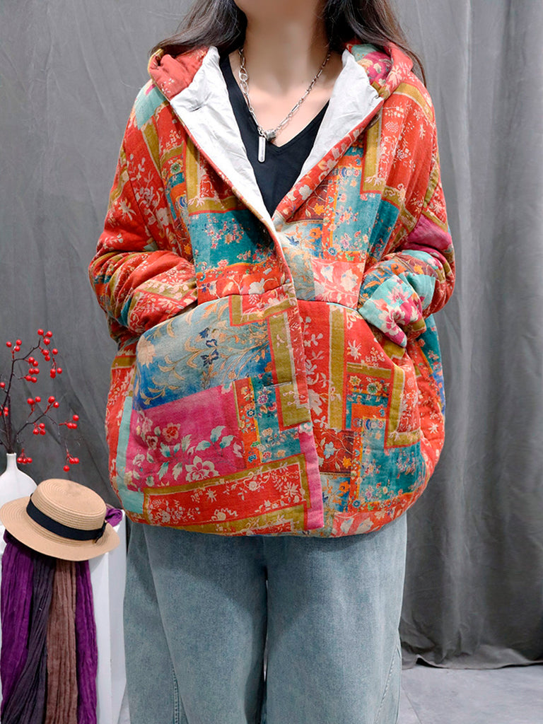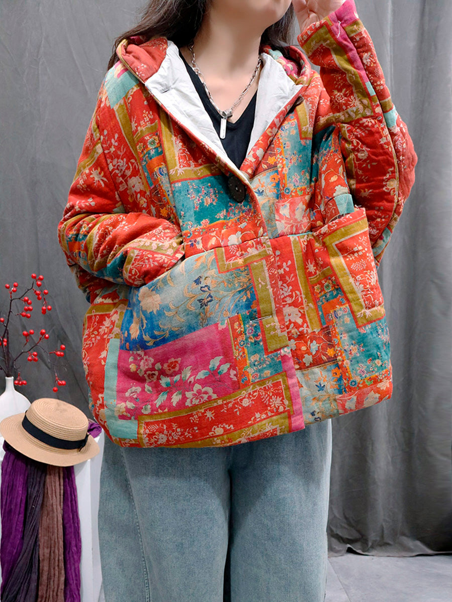 Abrigo de algodón con capucha y patchwork estilo vintage para mujer