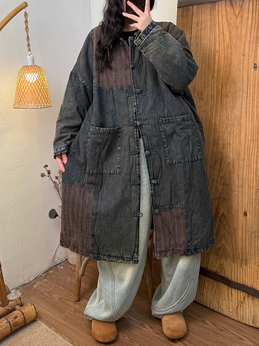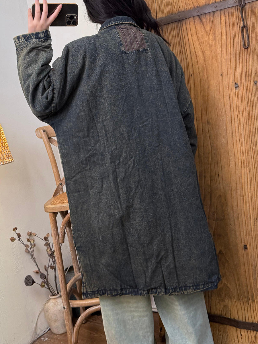 Abrigo vaquero vintage de invierno para mujer con cuello redondo y diseño patchwork.