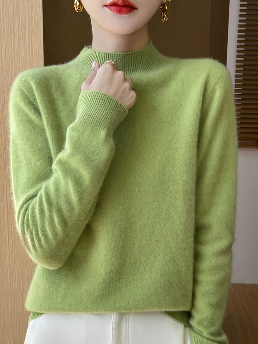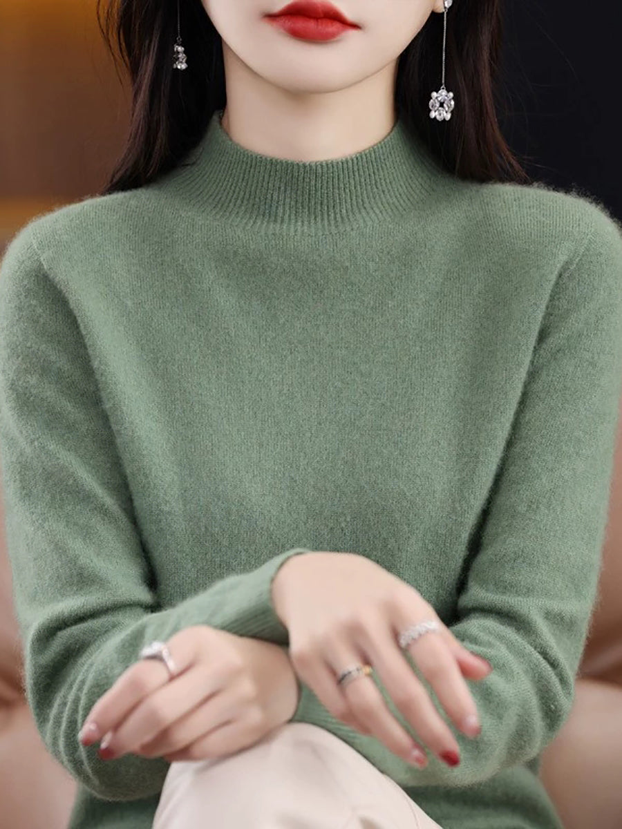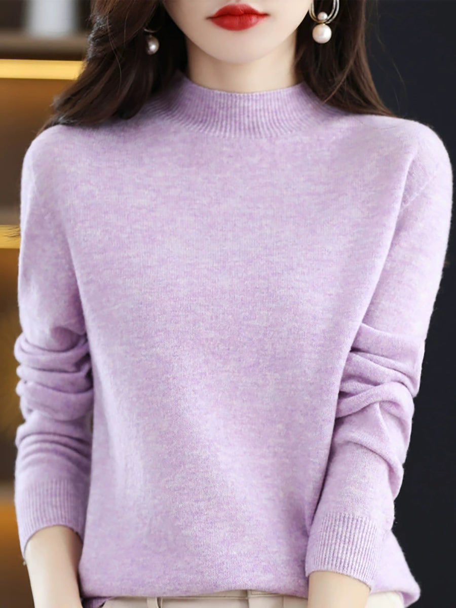 Suéter de cuello alto medio de lana de color puro y estilo artístico de invierno para mujer