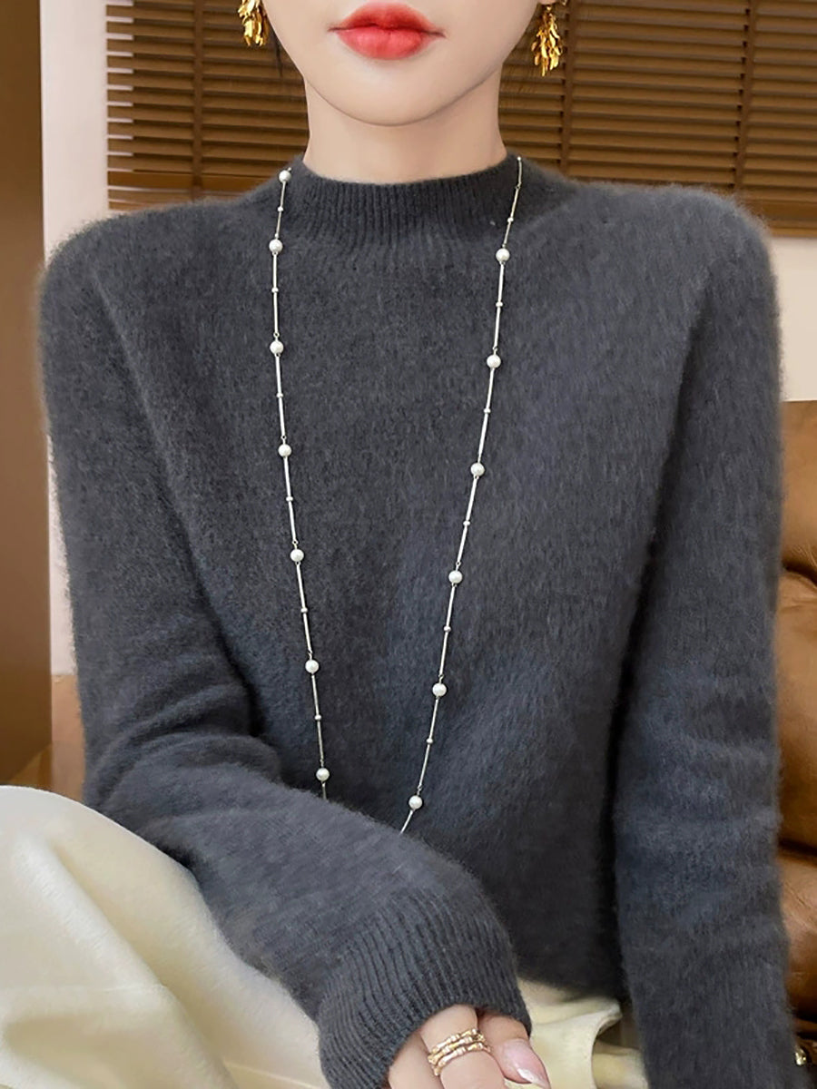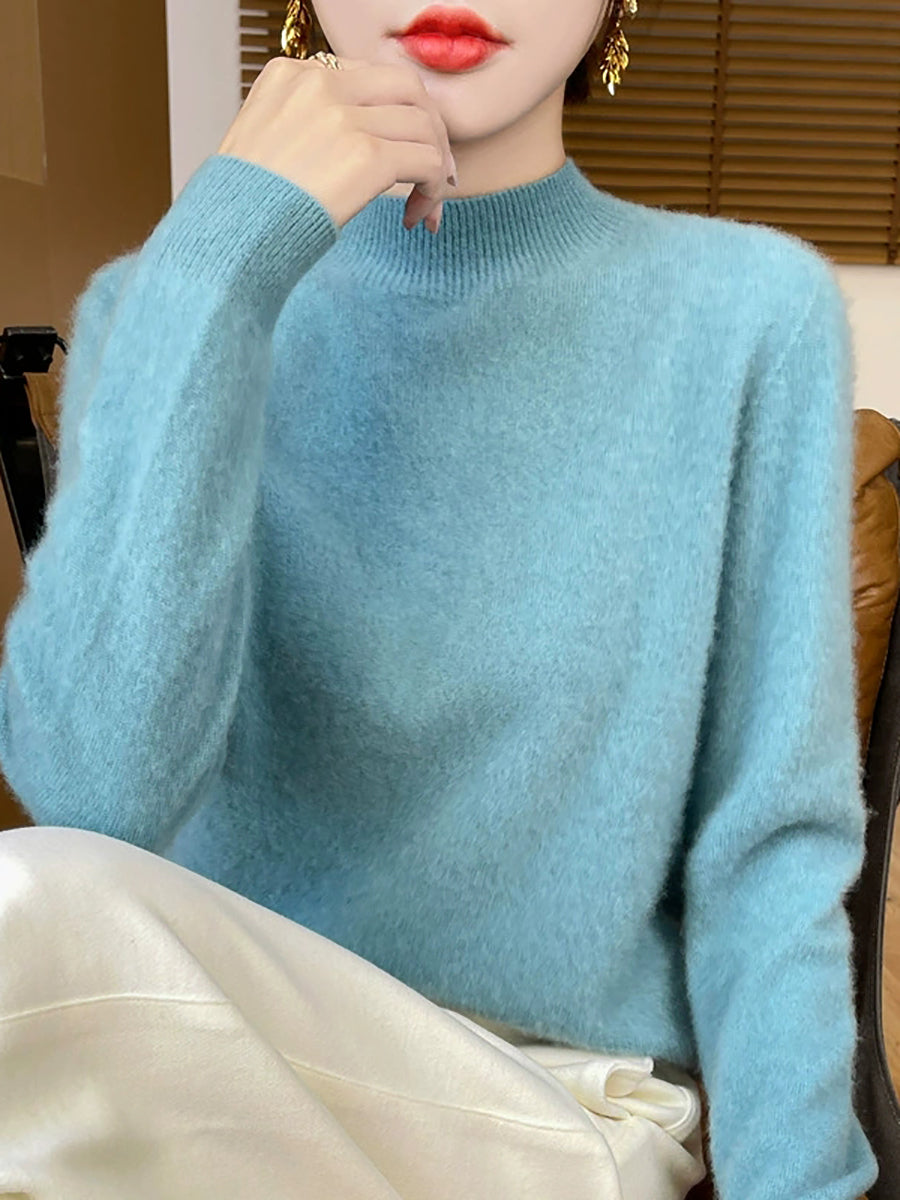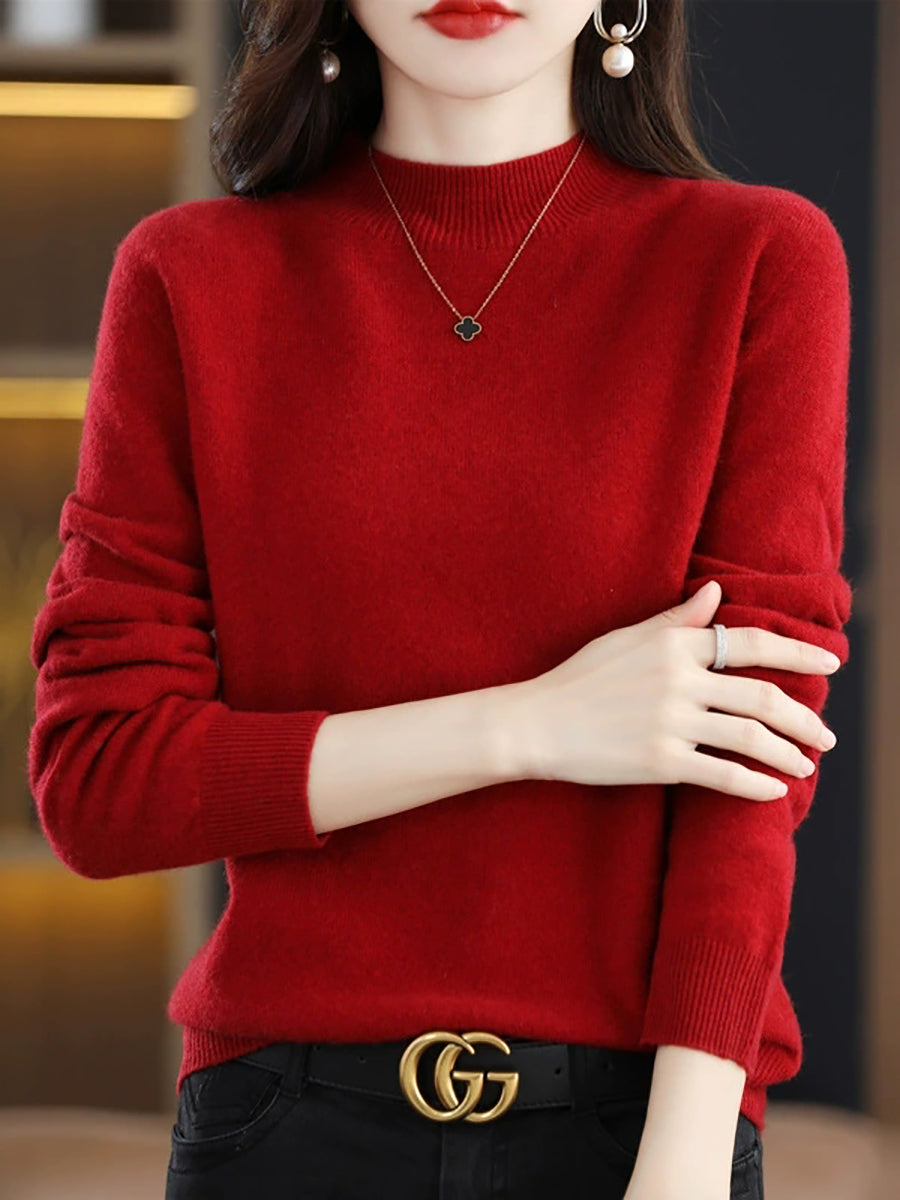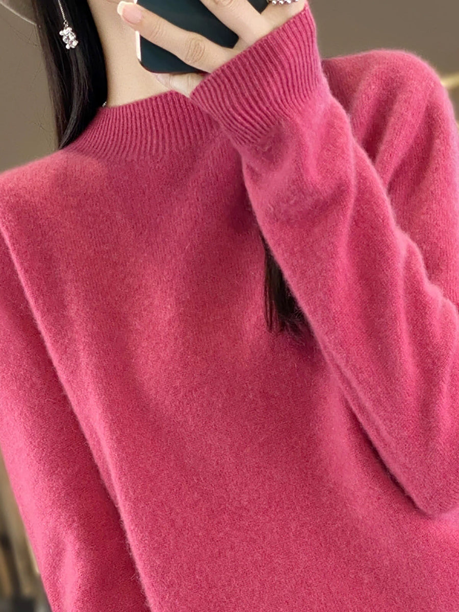 Suéter de cuello alto medio de lana de color puro y estilo artístico de invierno para mujer