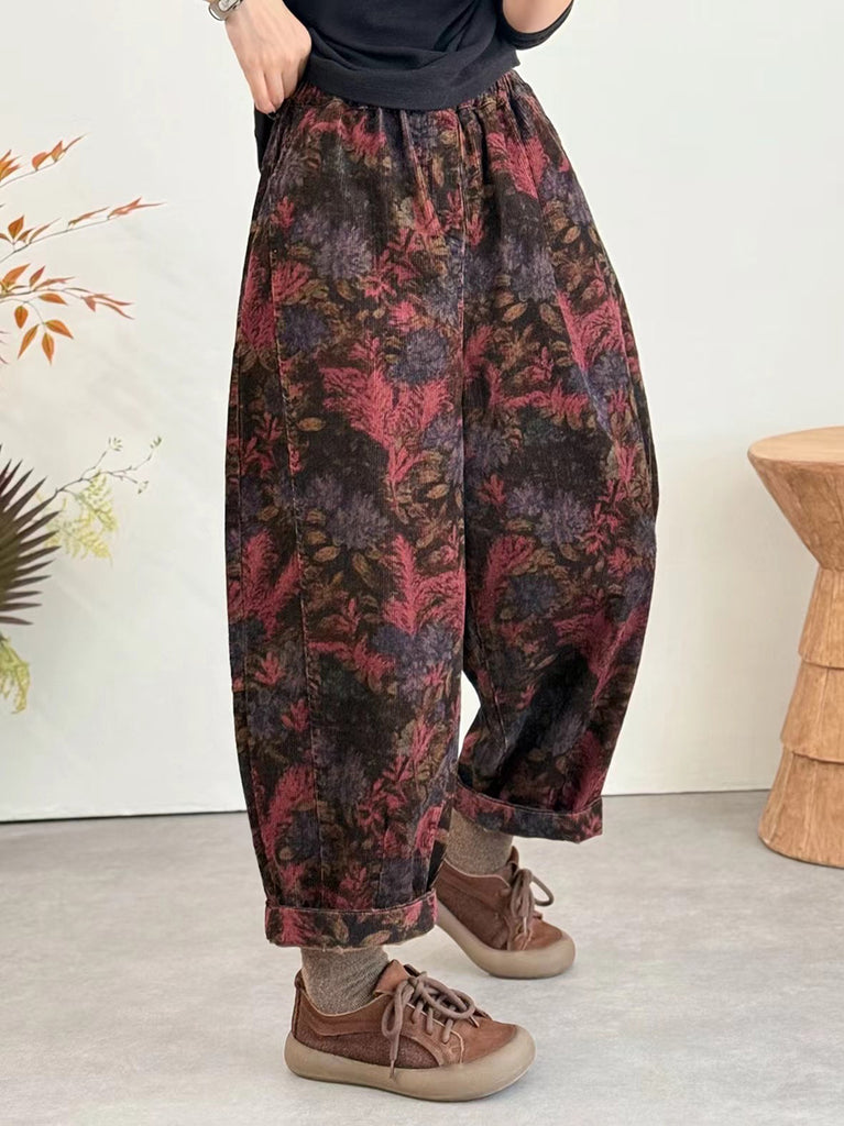 Pantalones harén de pana con flores étnicas de invierno para mujer