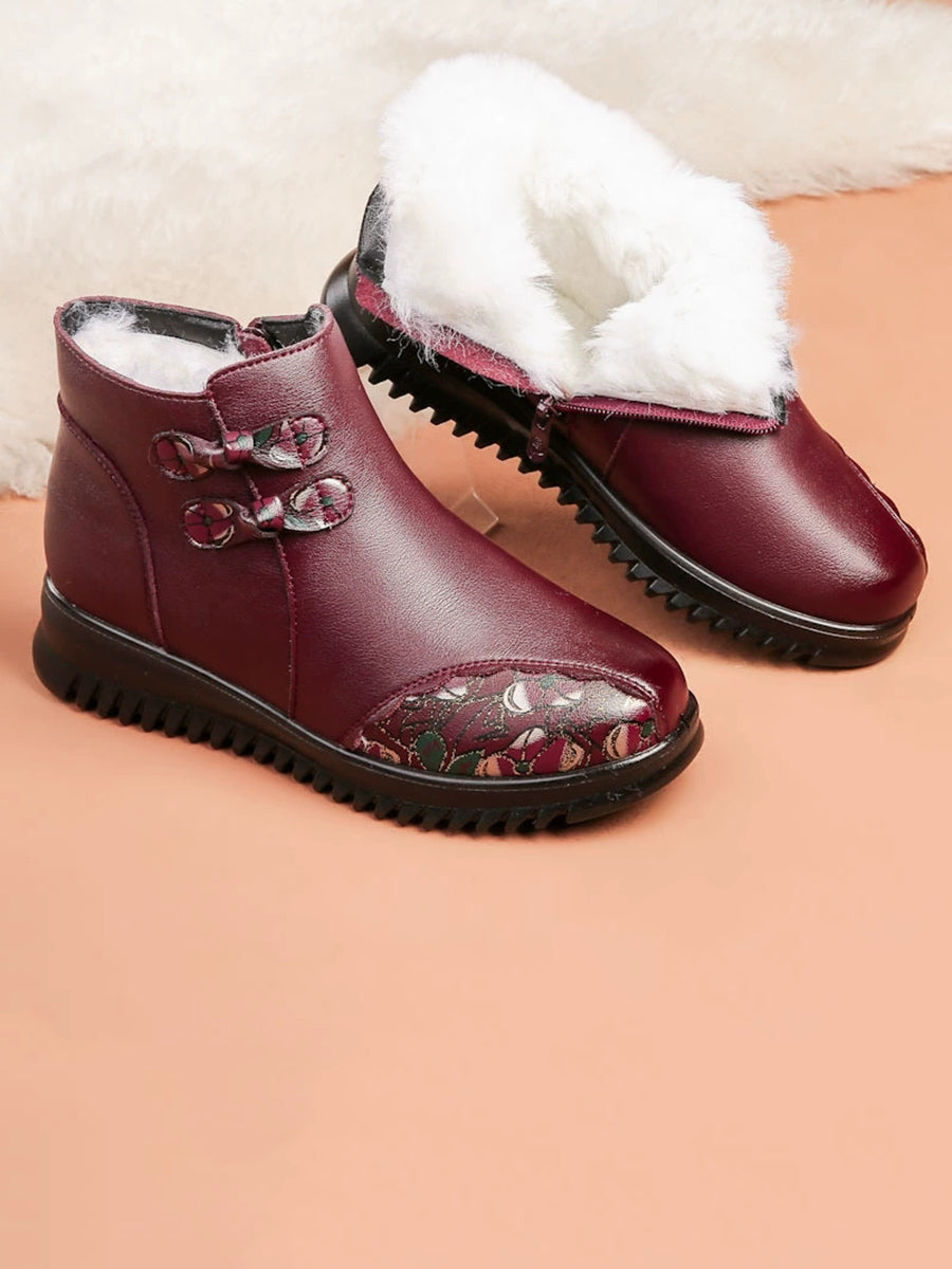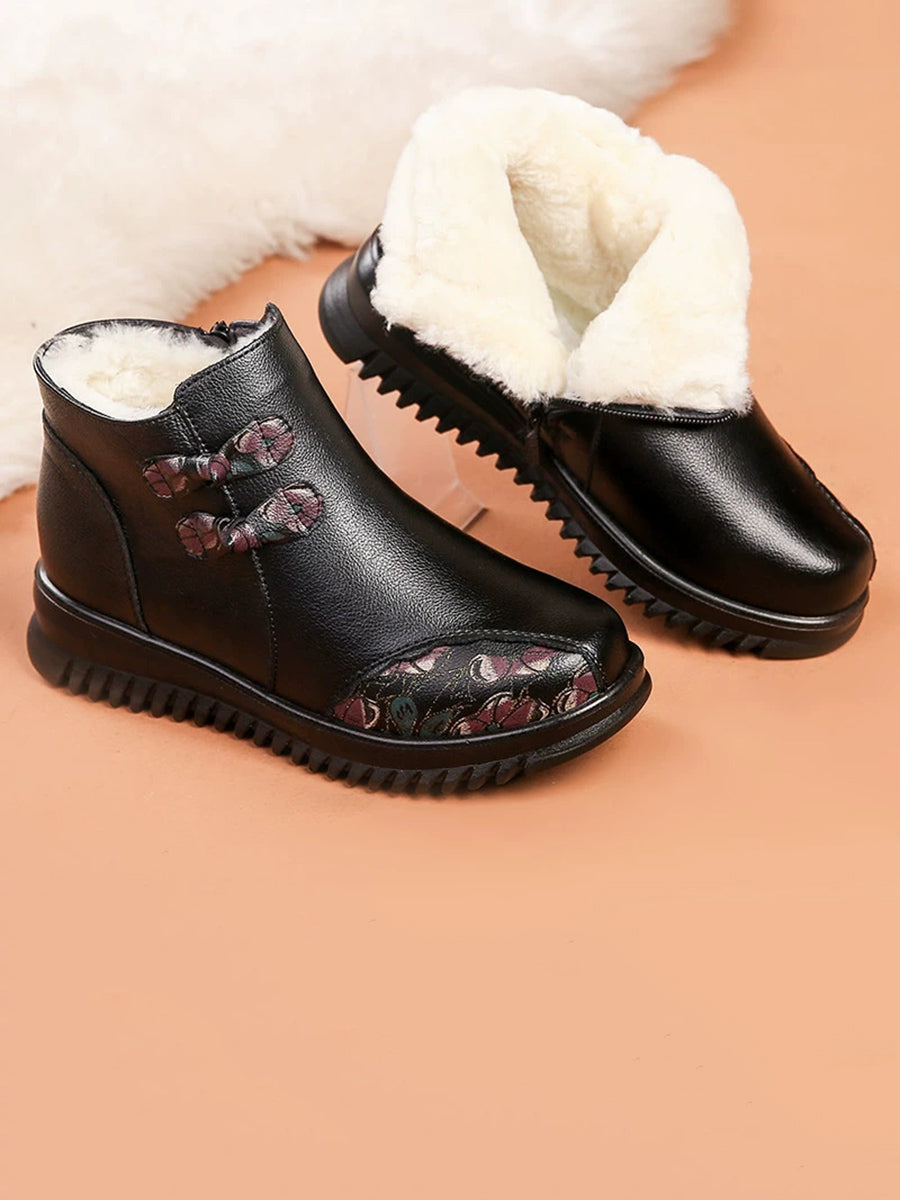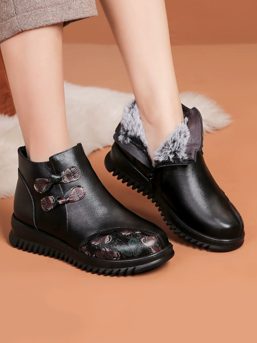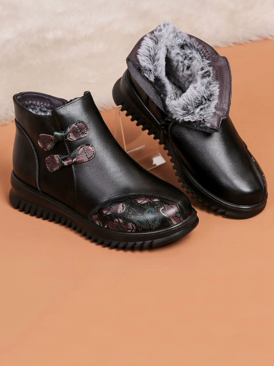 Botas étnicas de invierno de piel con forro polar y empalmes para mujer