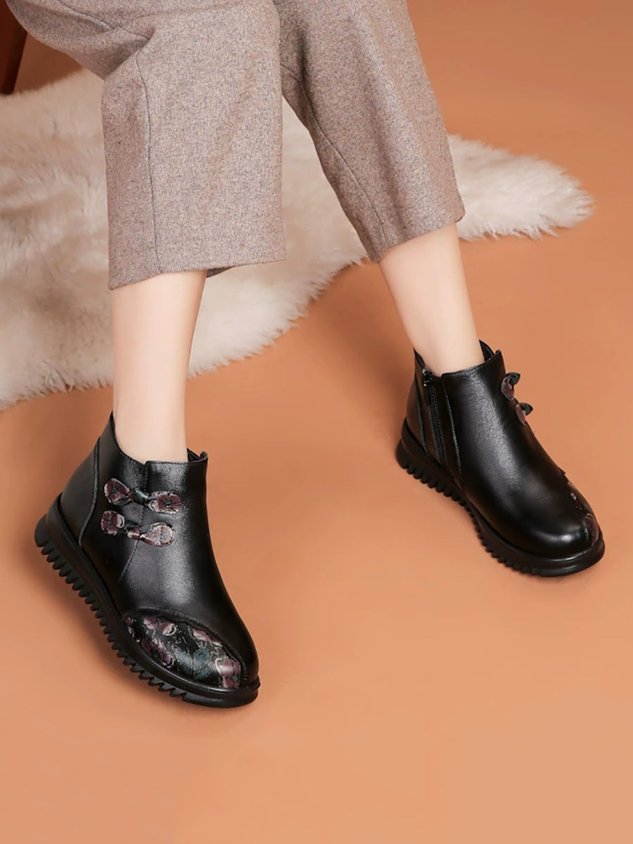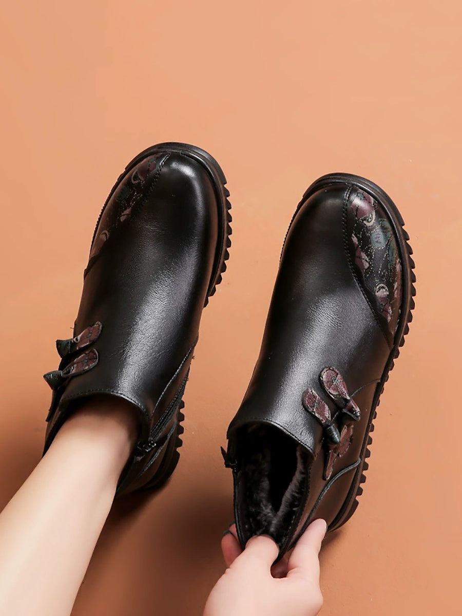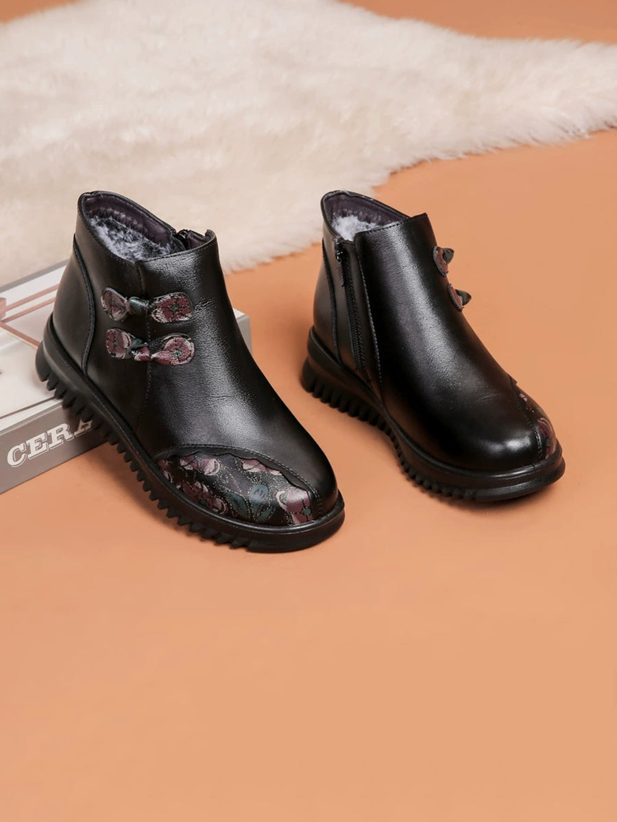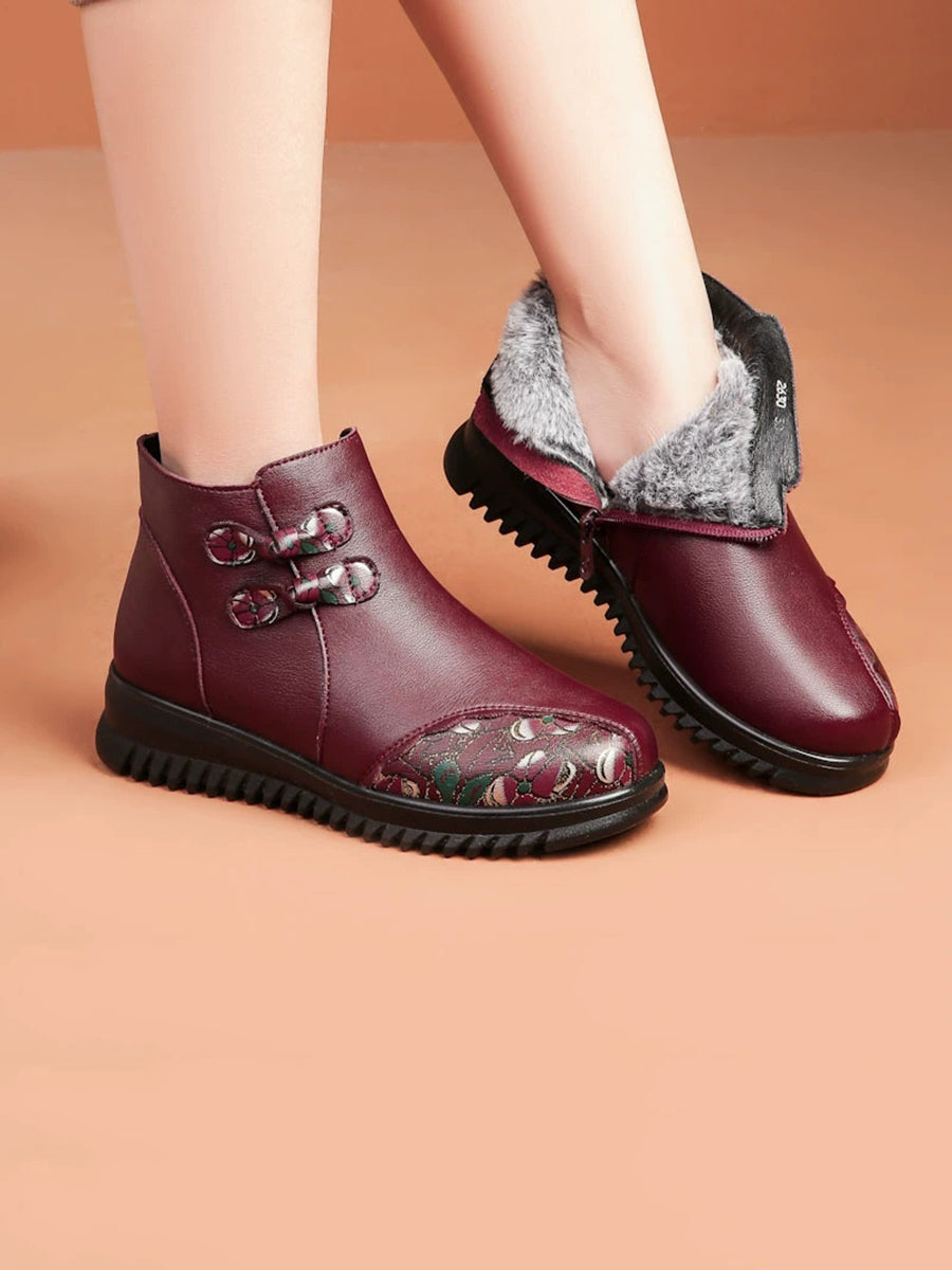 Botas étnicas de invierno de piel con forro polar y empalmes para mujer