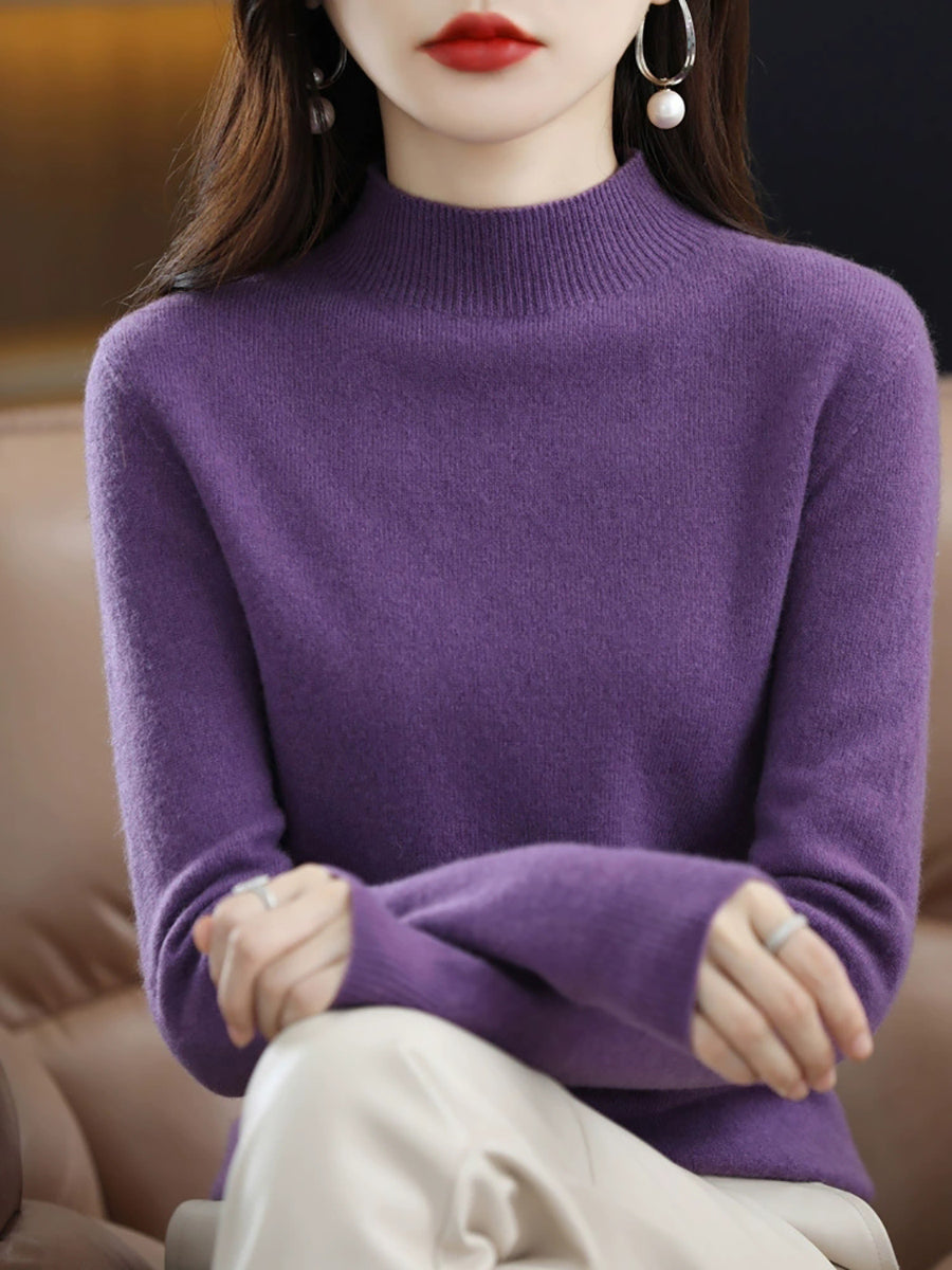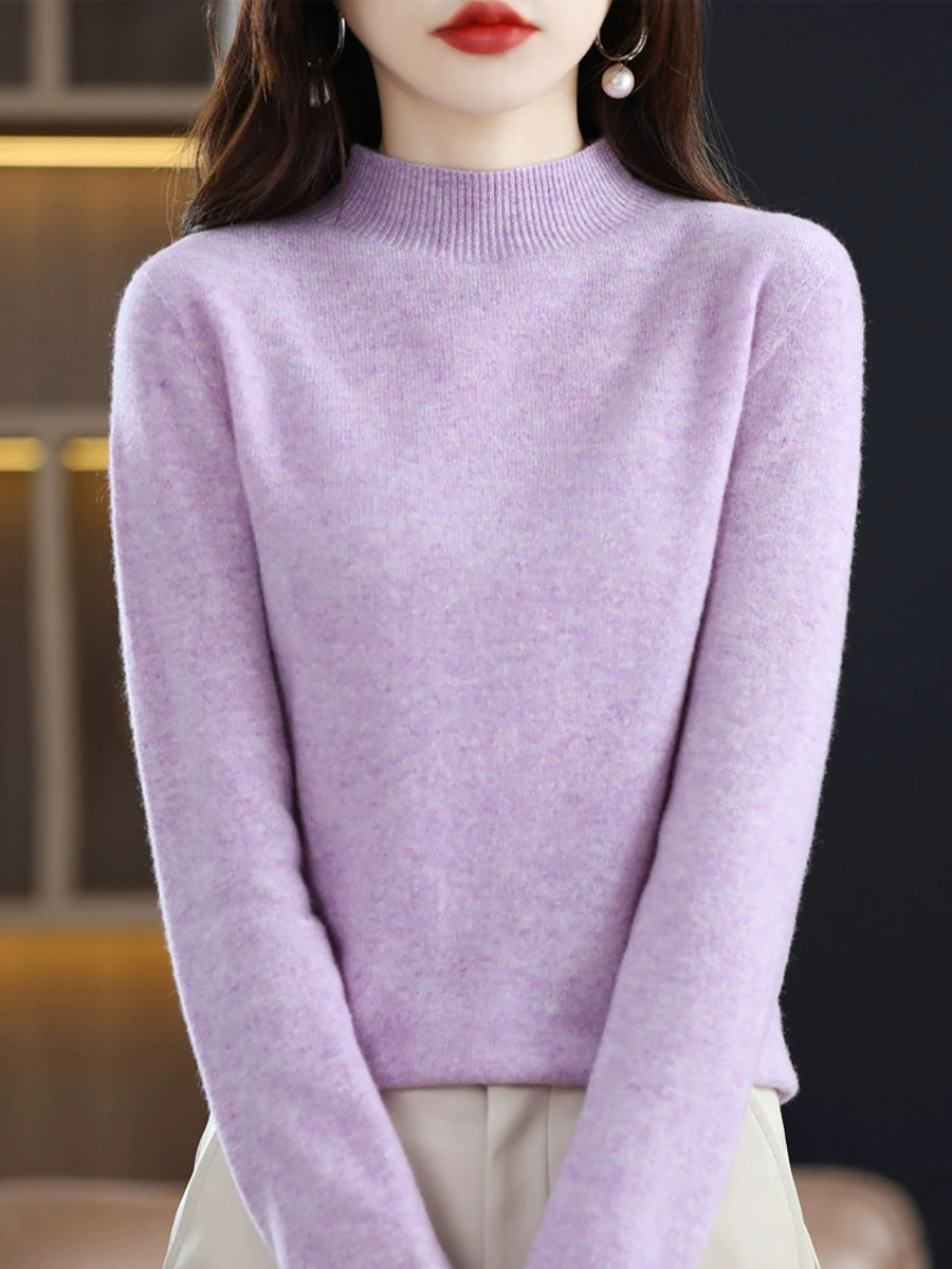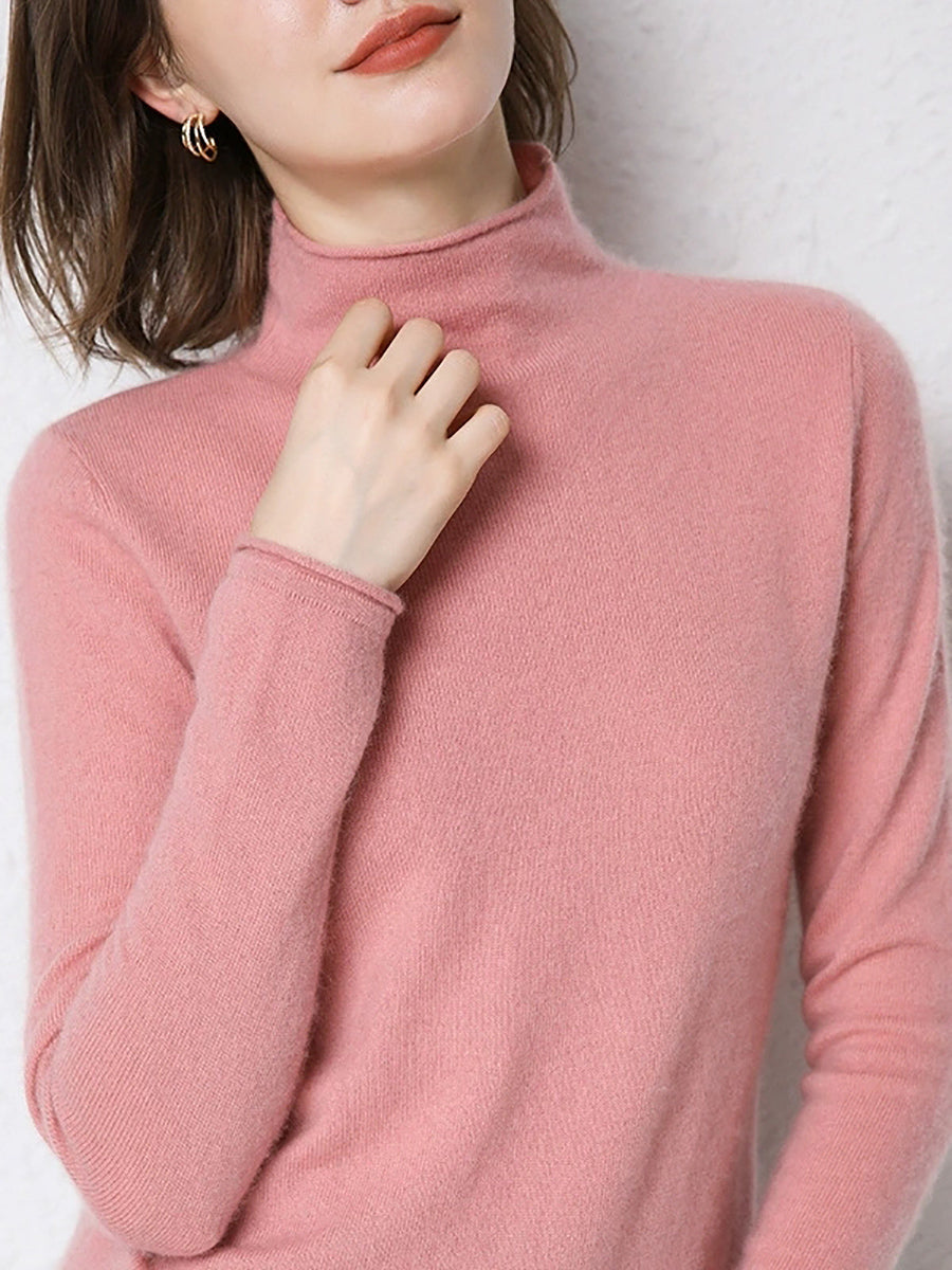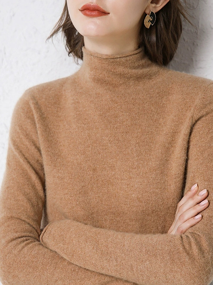 Suéter de cuello alto medio de lana de color puro de invierno para mujer