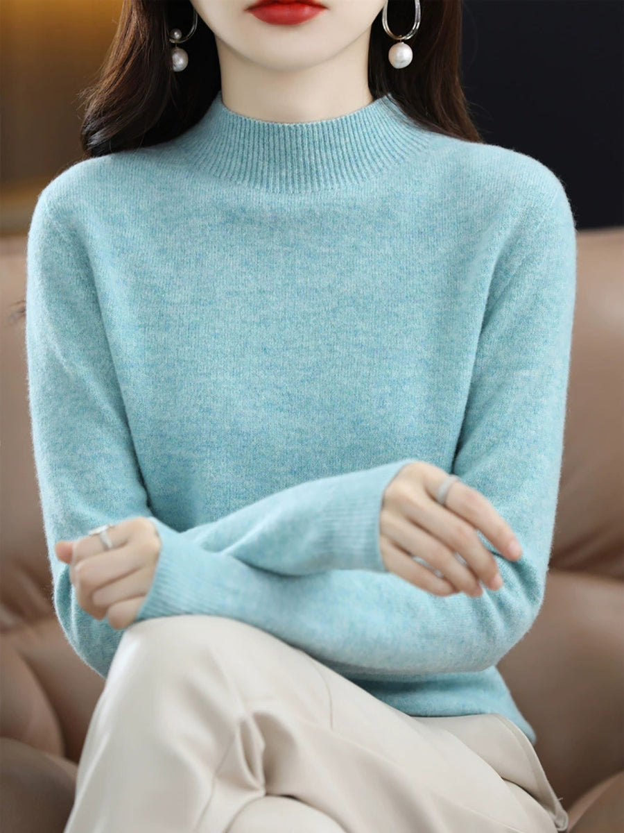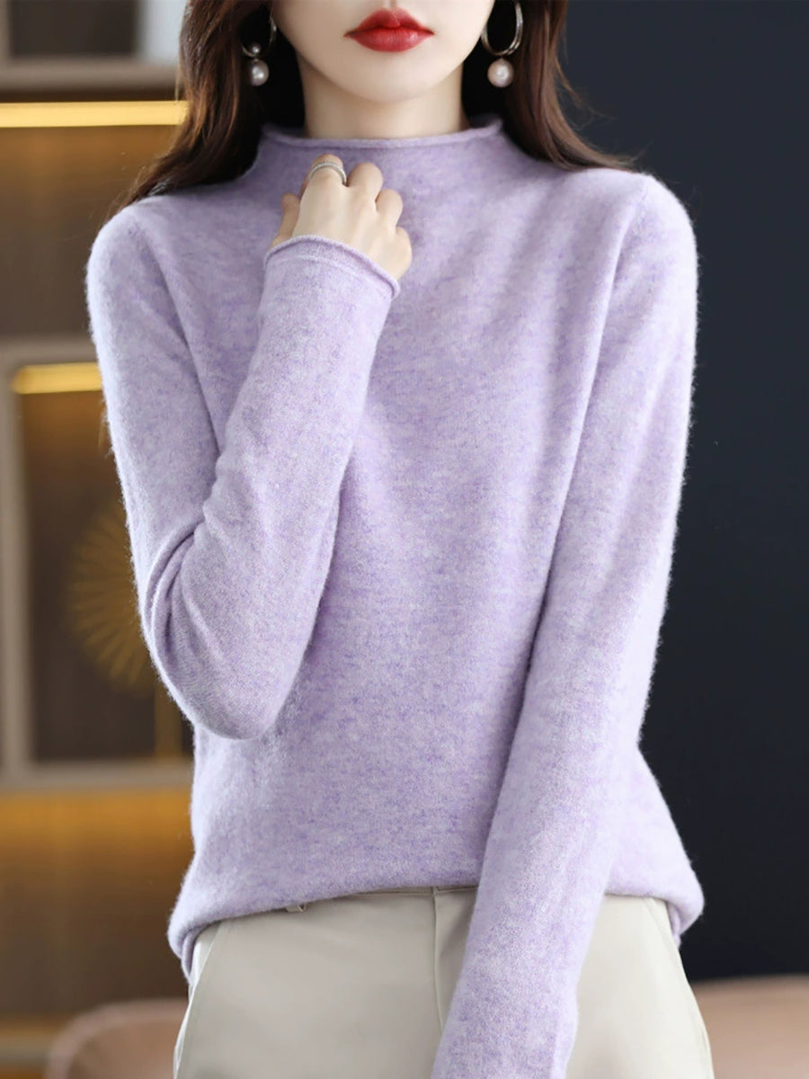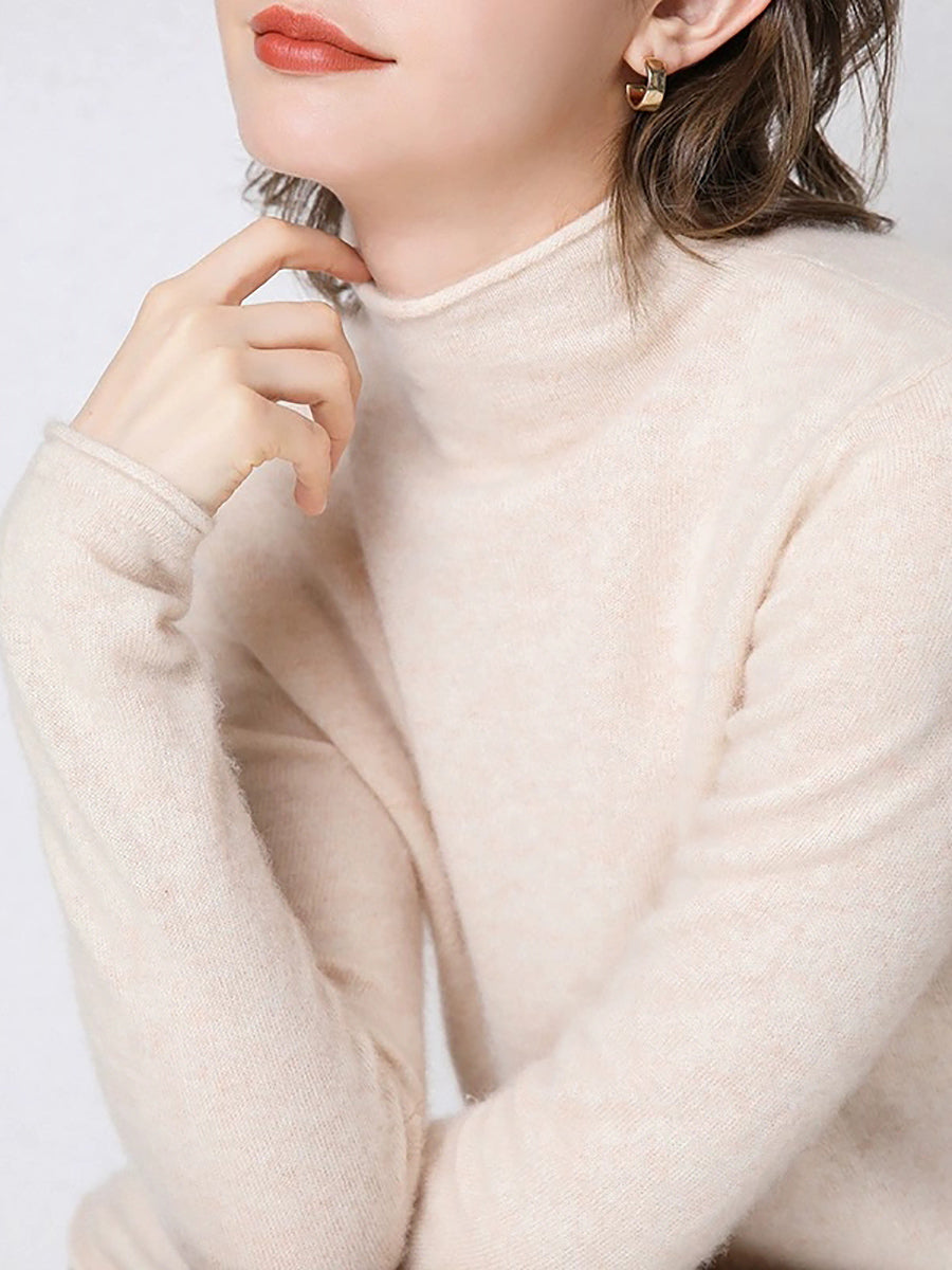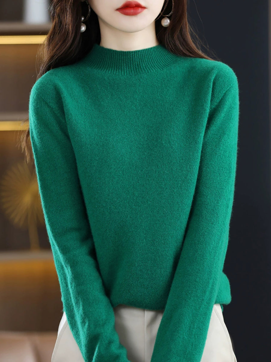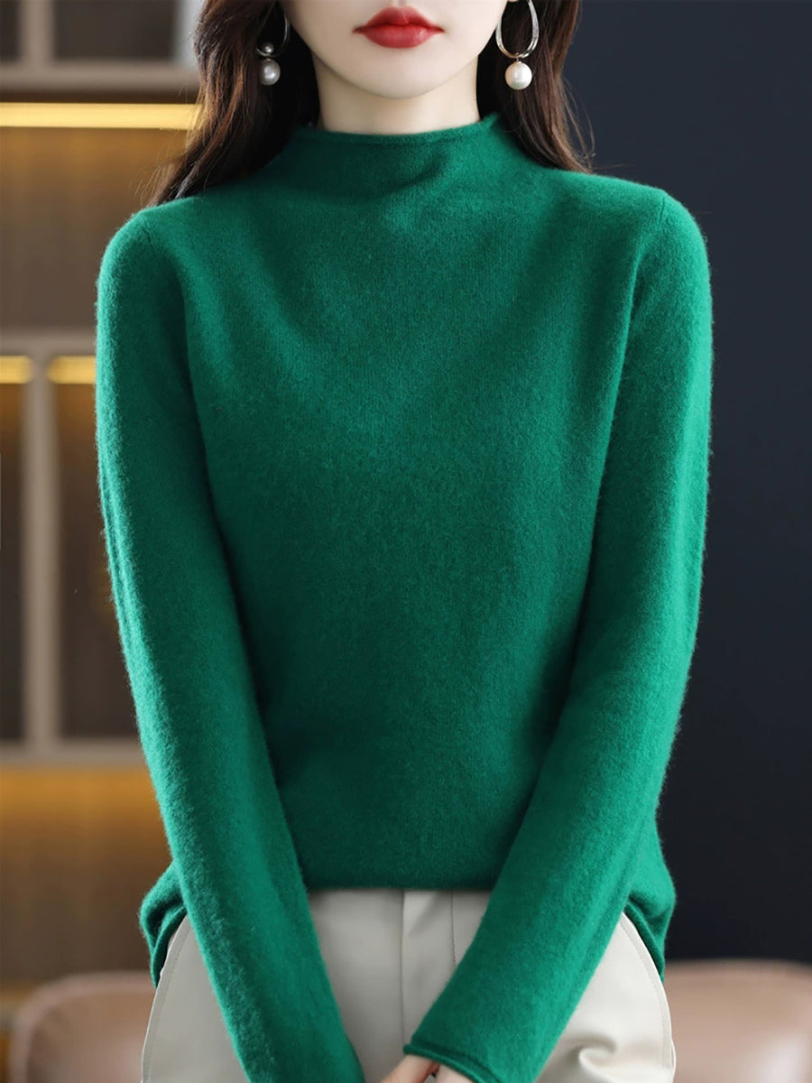 Suéter de cuello alto medio de lana de color puro de invierno para mujer