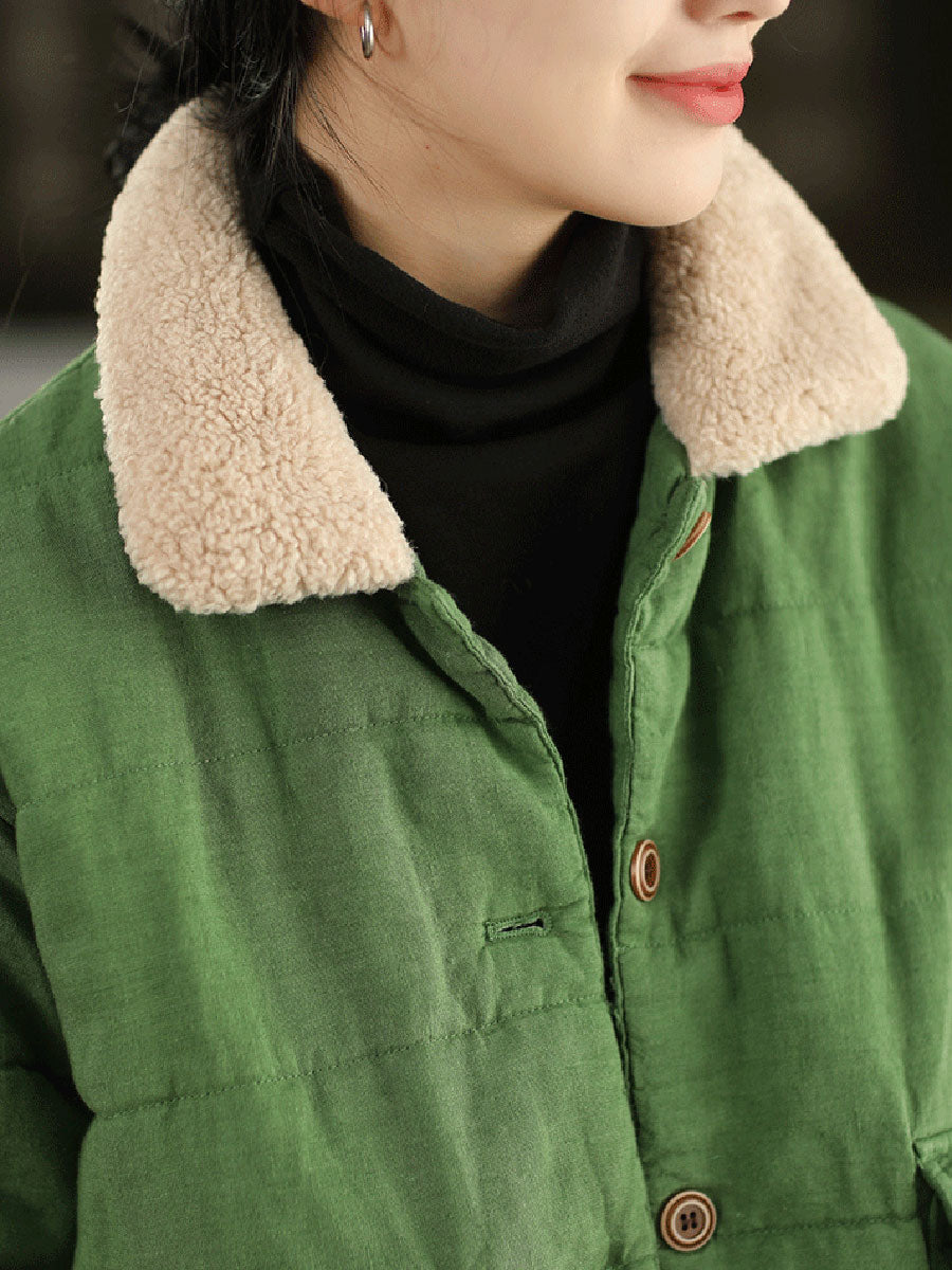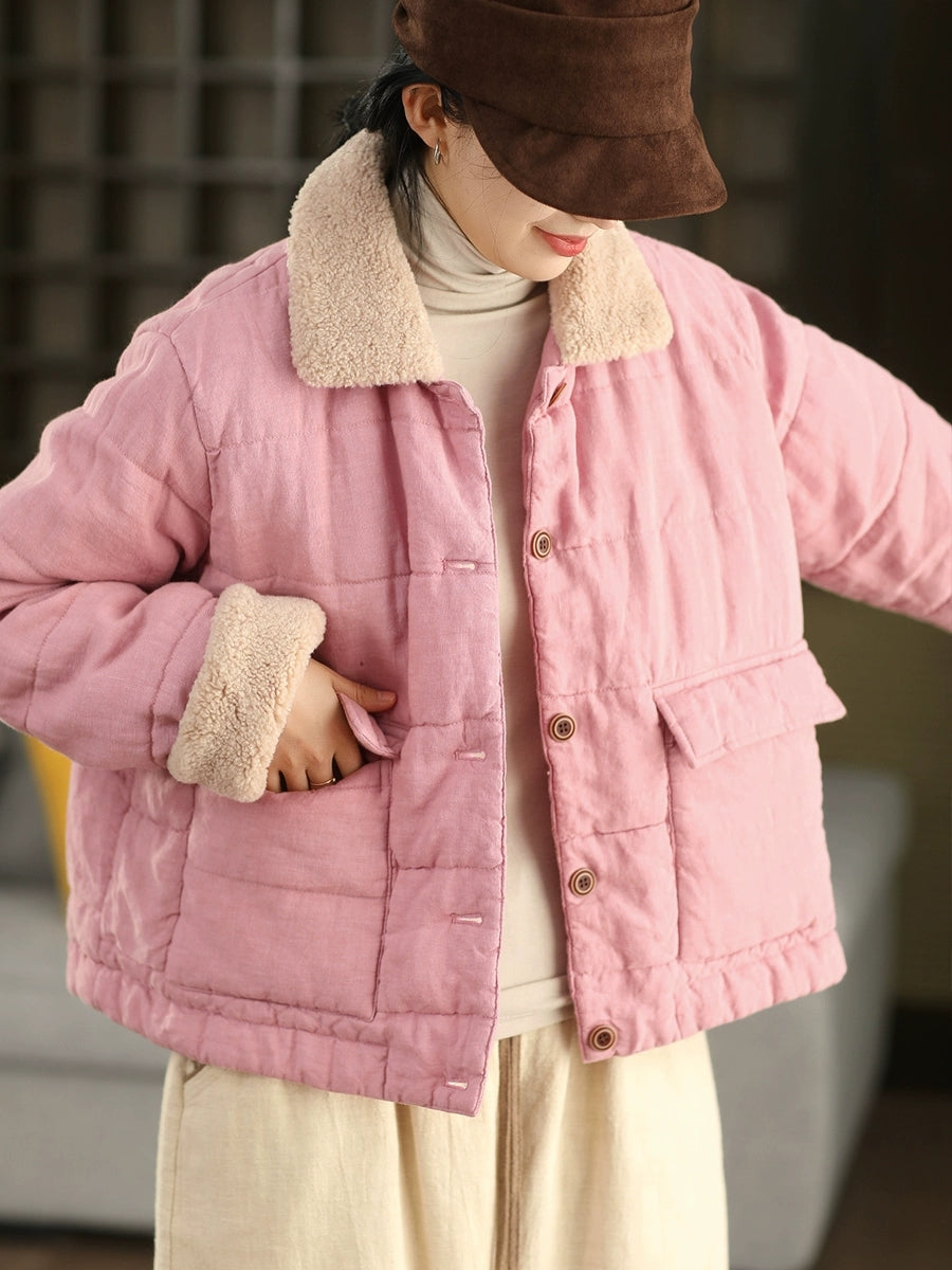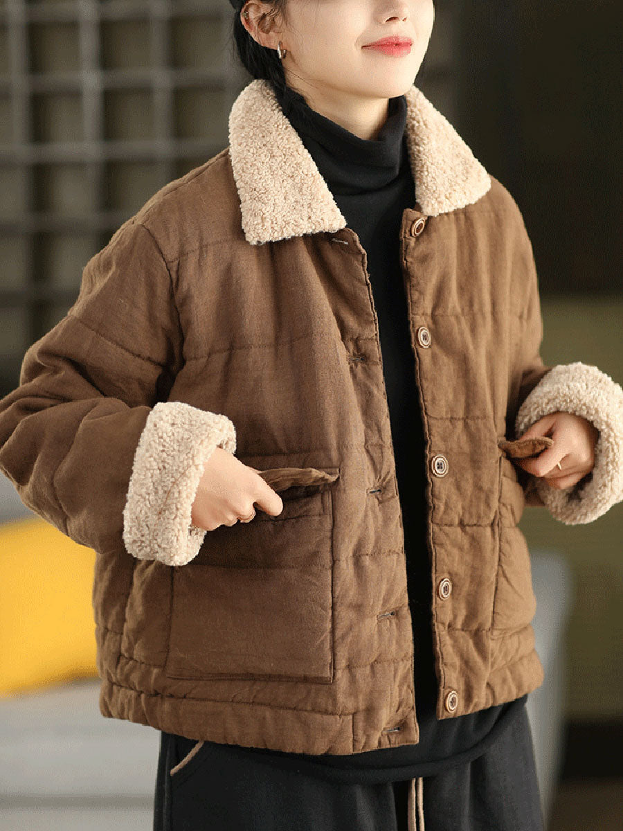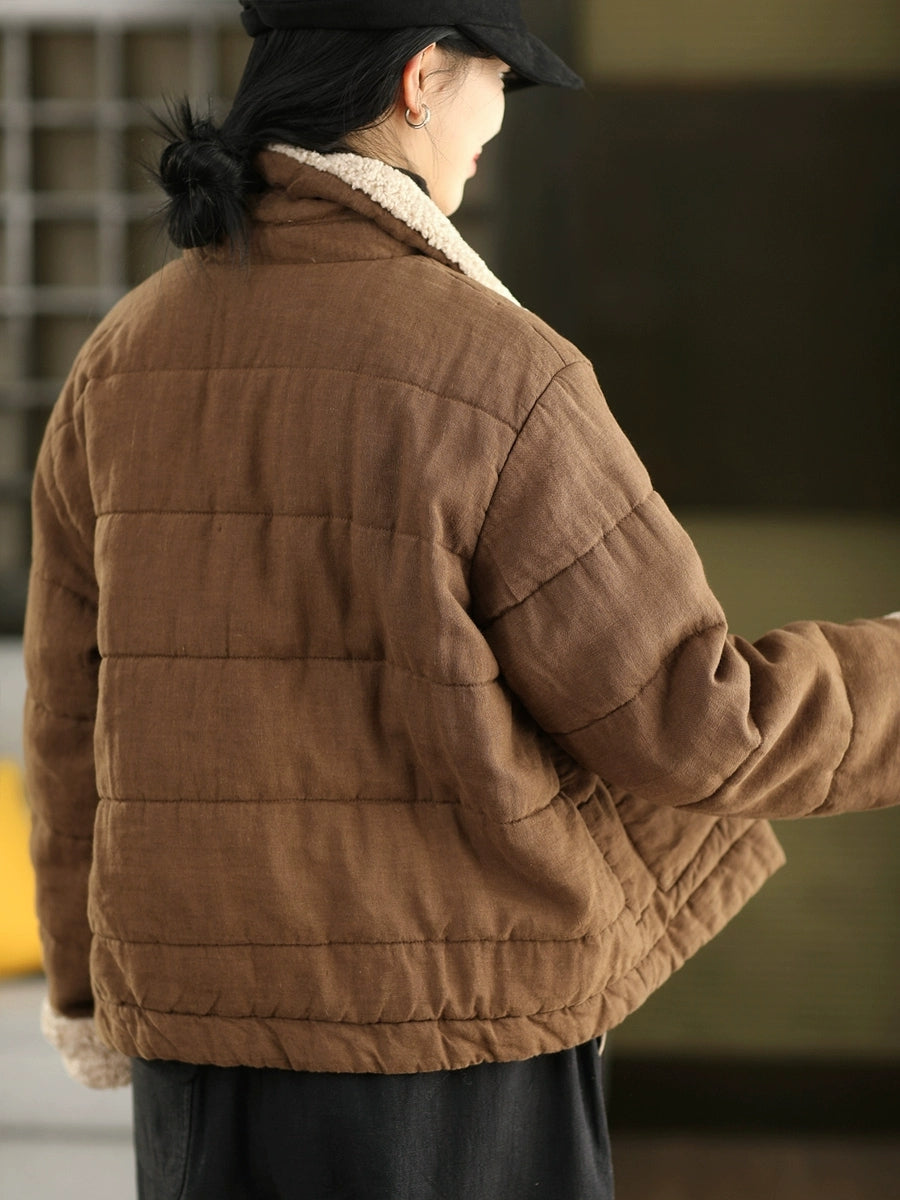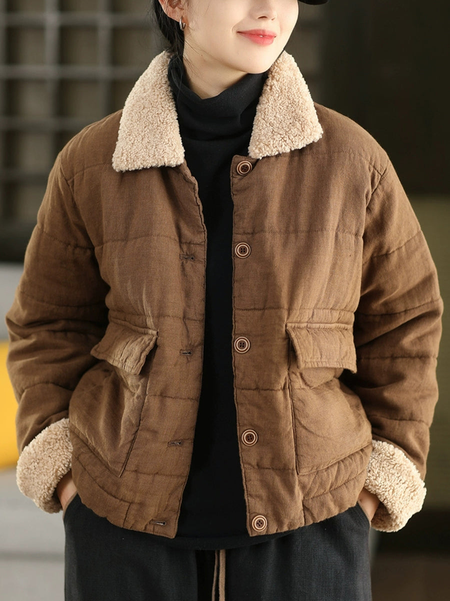Abrigo acolchado retro de invierno para mujer, 100 % lino, con empalmes de polar