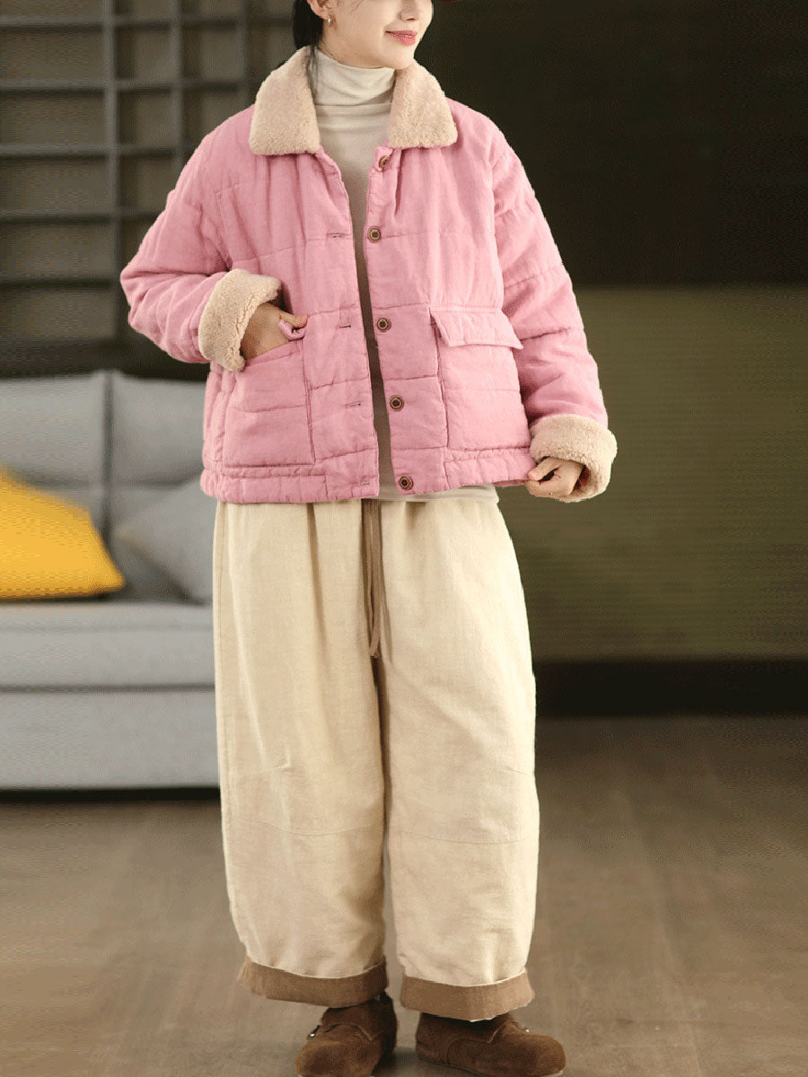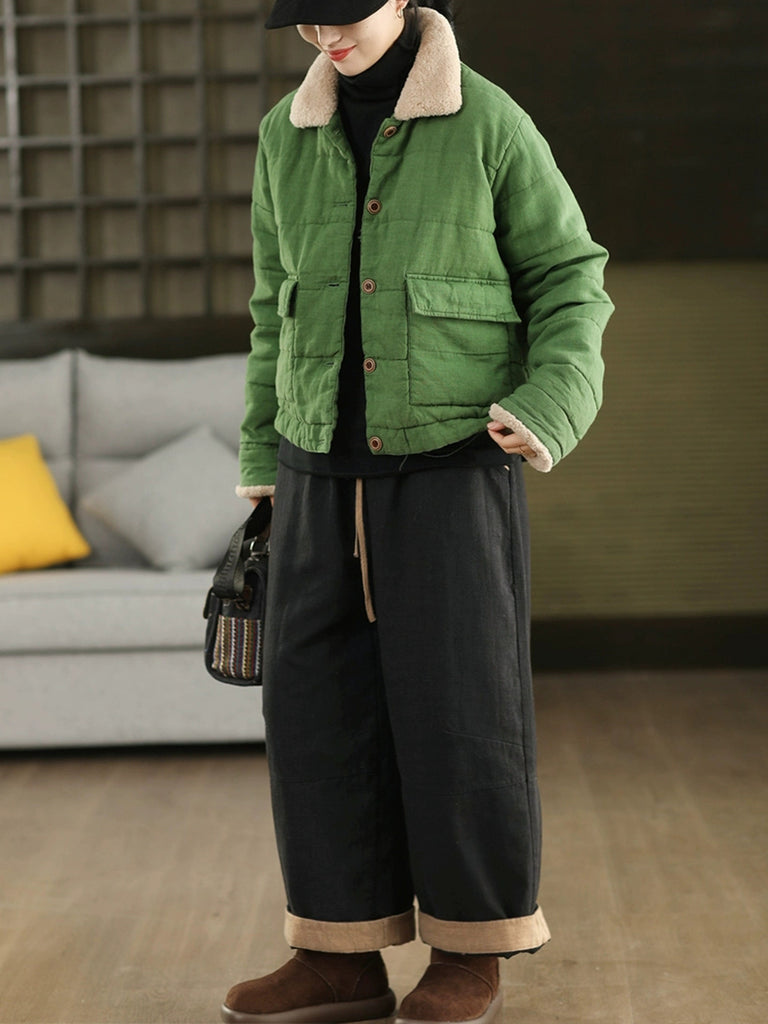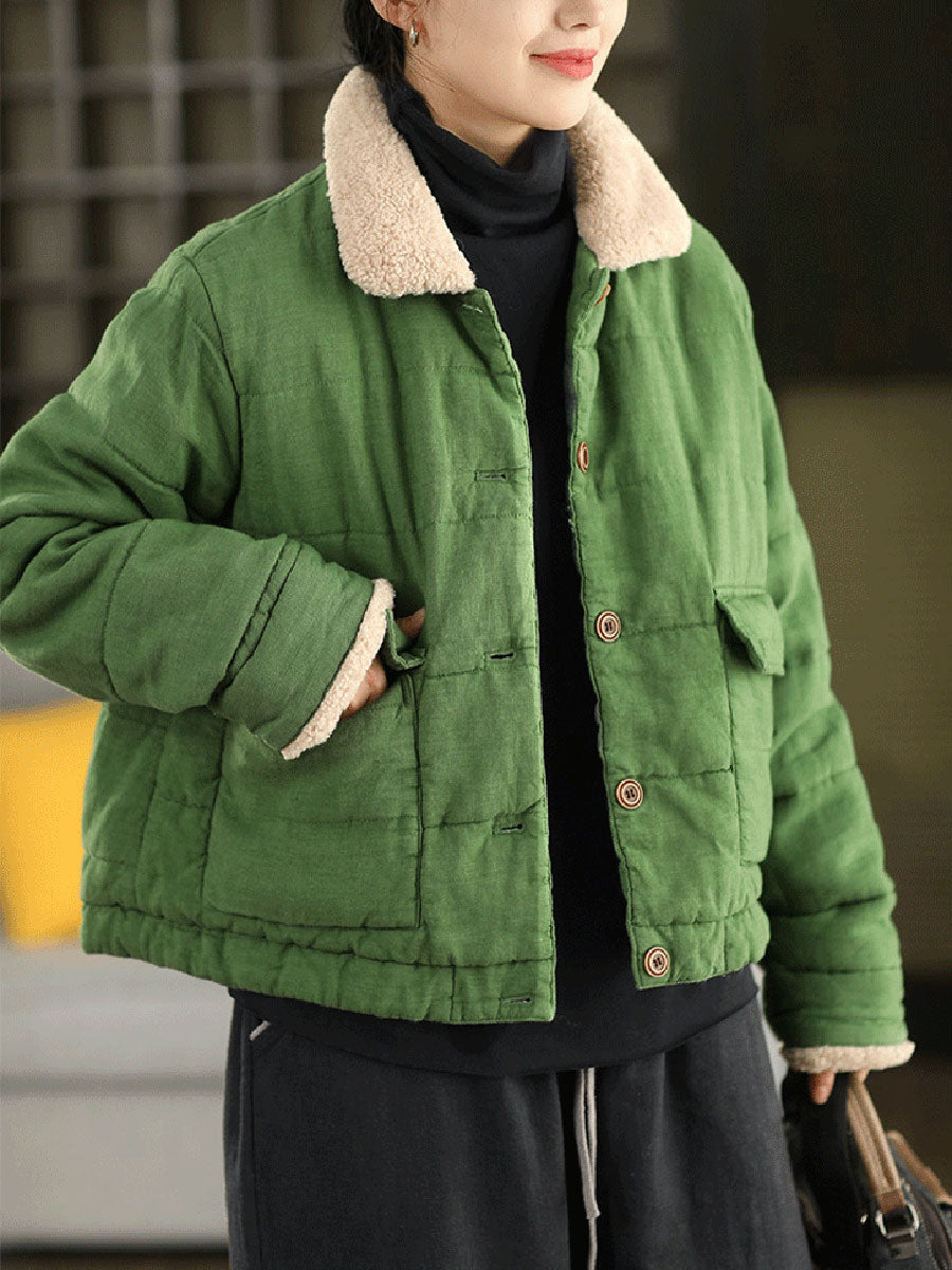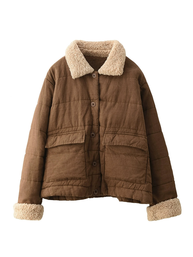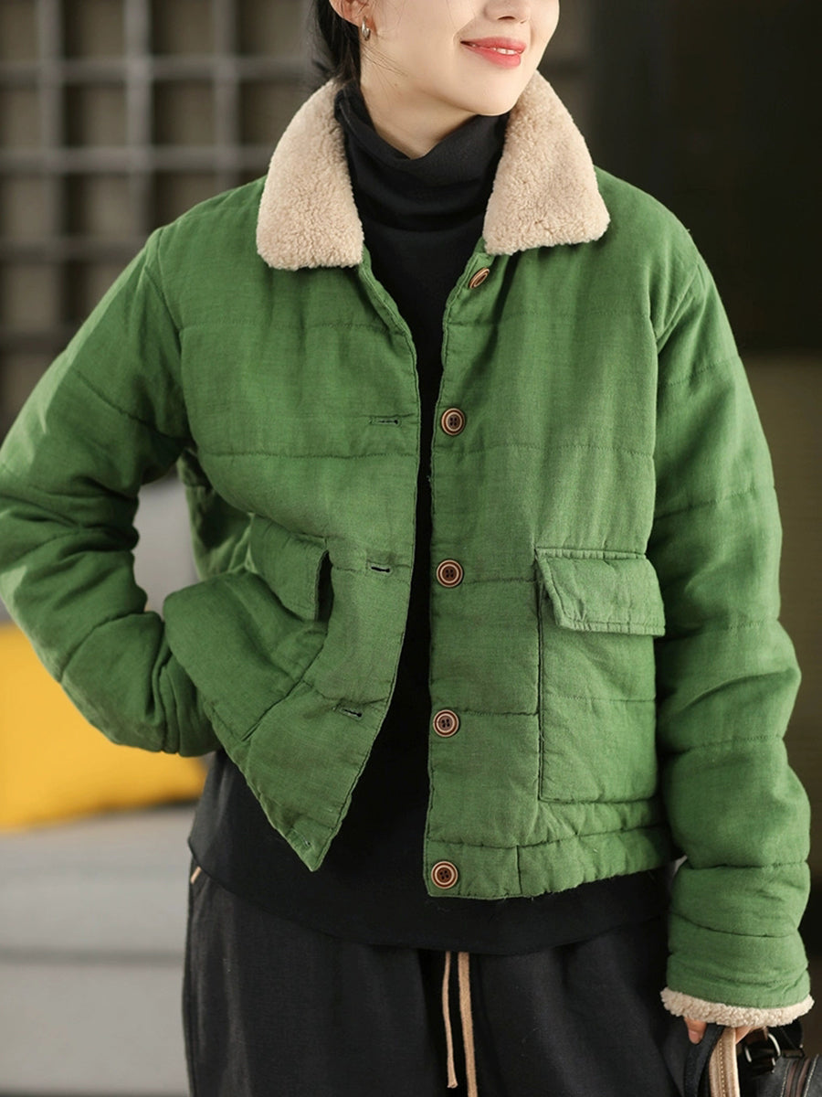 Abrigo acolchado retro de invierno para mujer, 100 % lino, con empalmes de polar