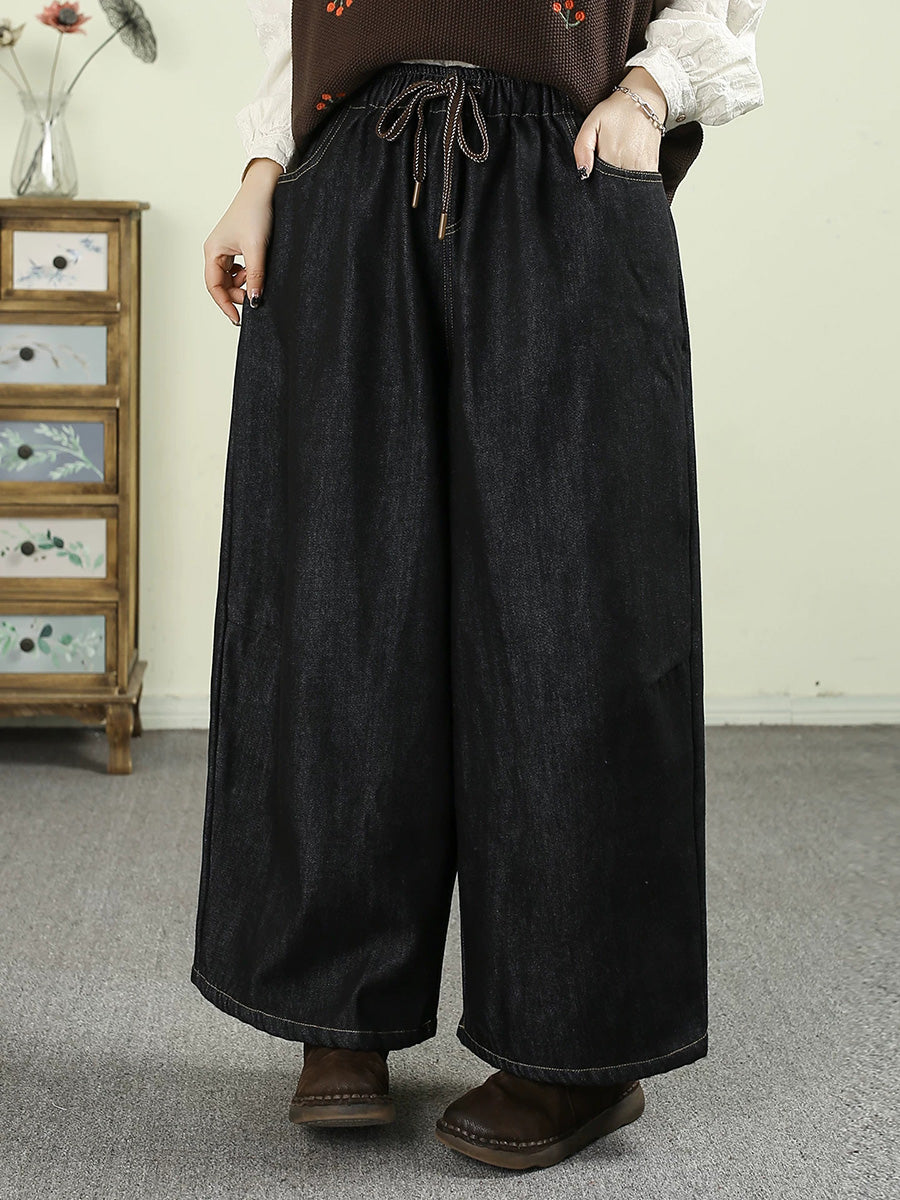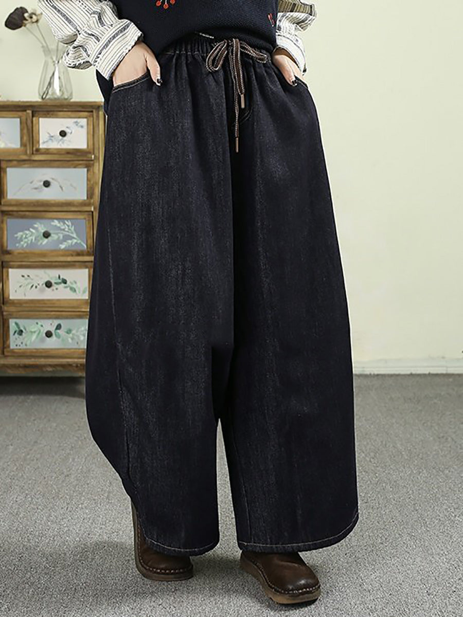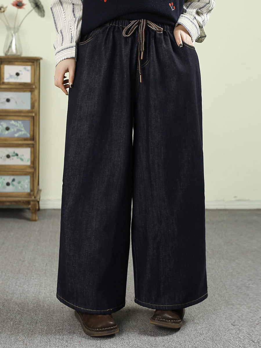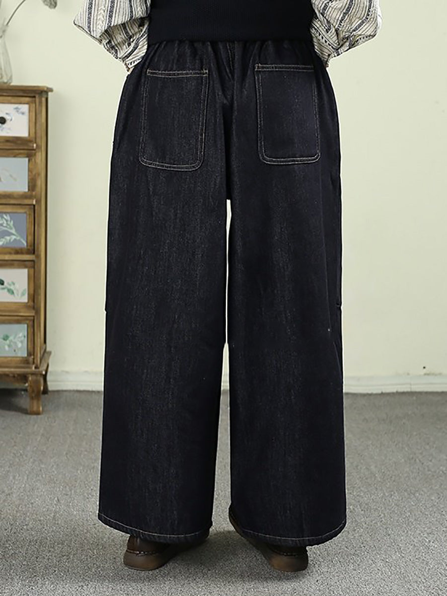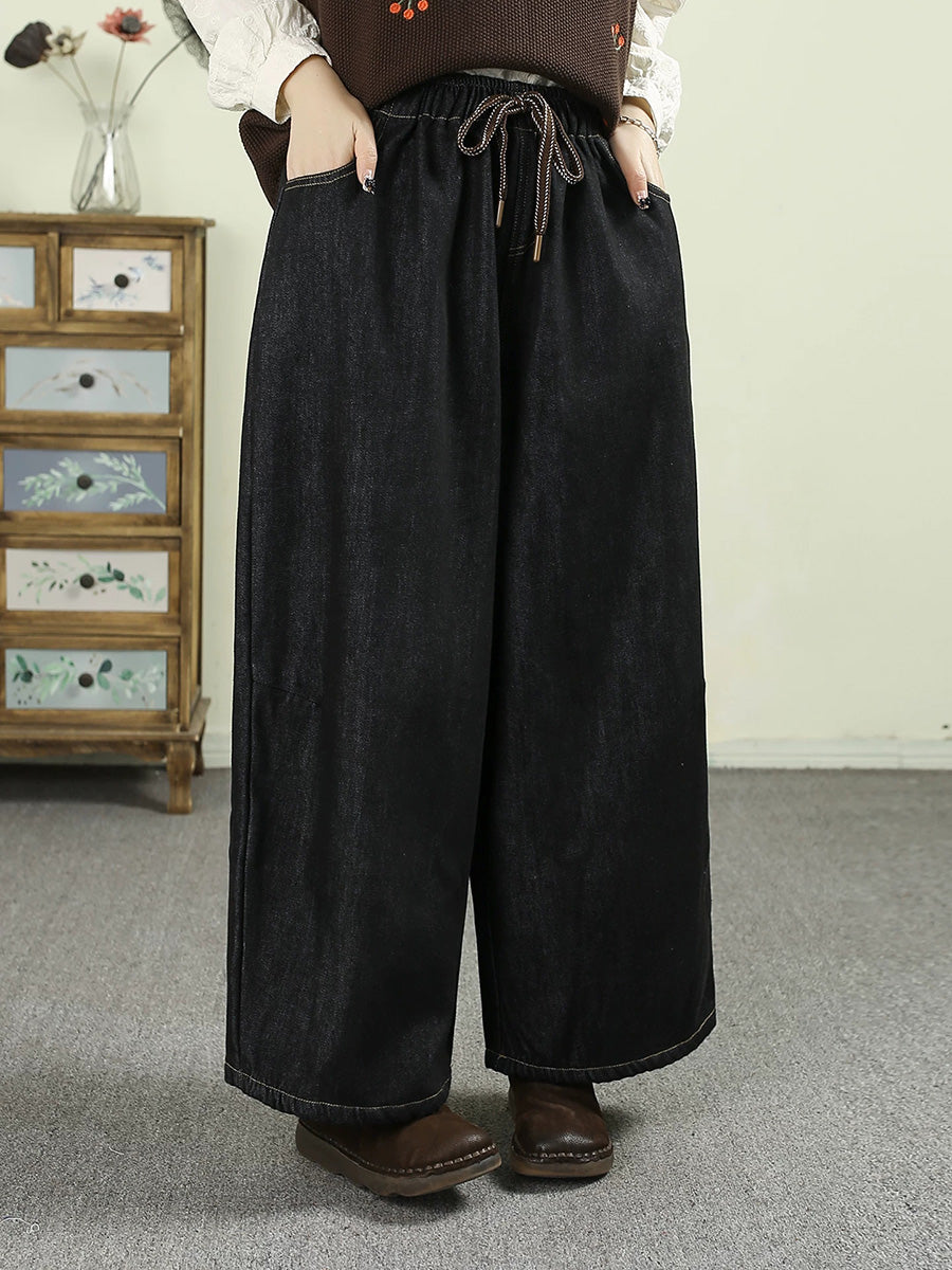 Pantalones anchos de mezclilla retro de invierno para mujer con forro polar