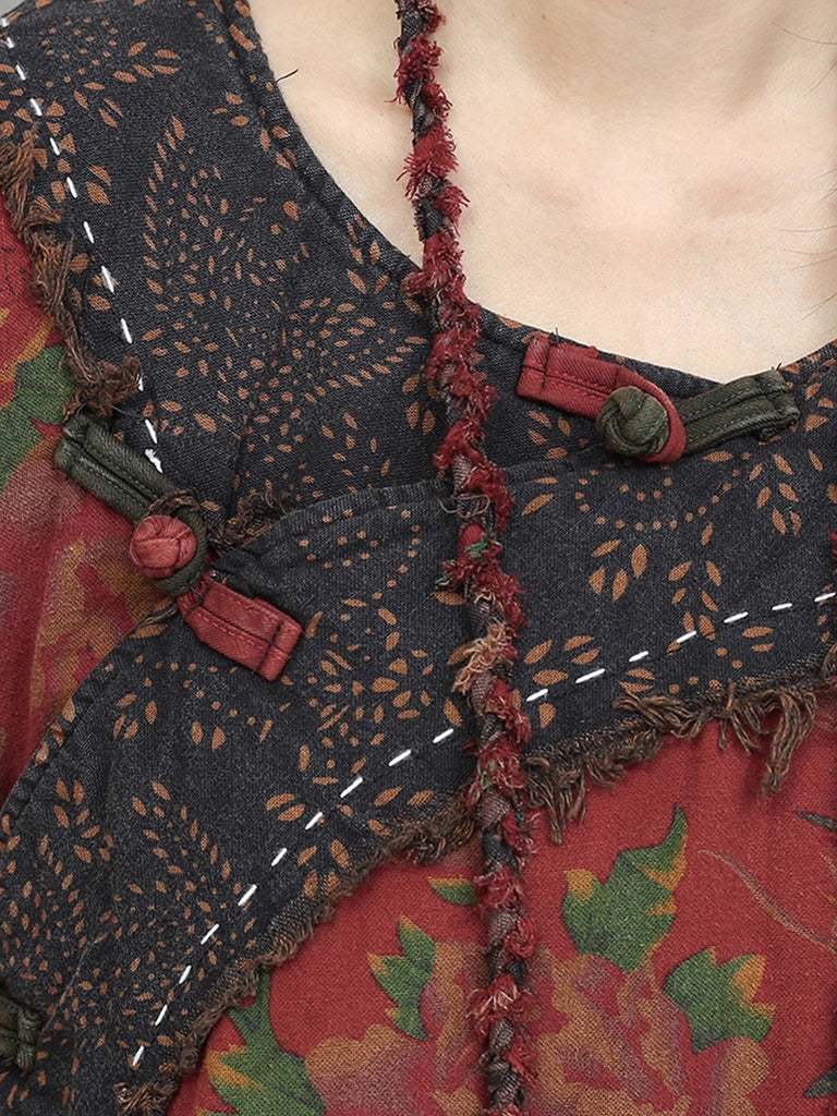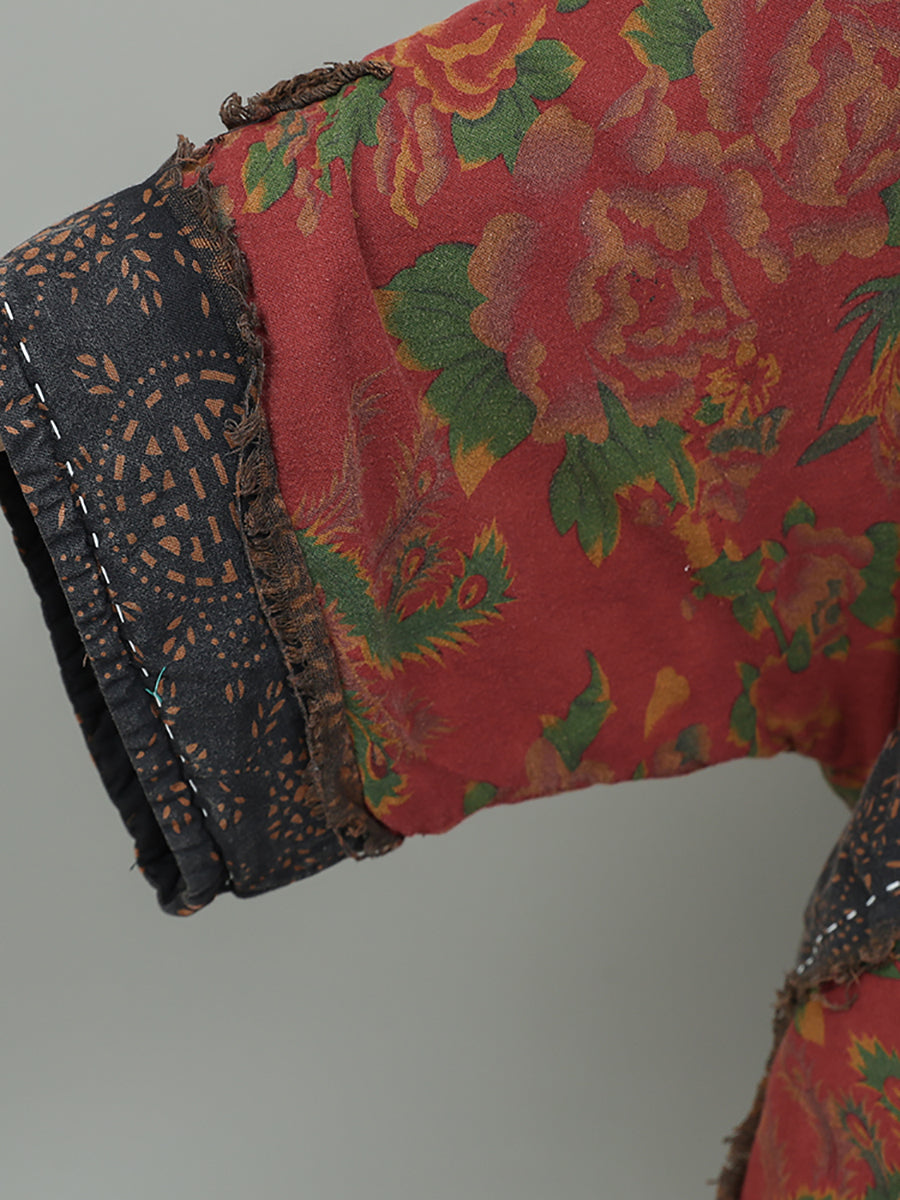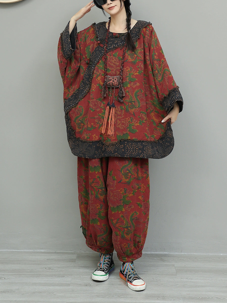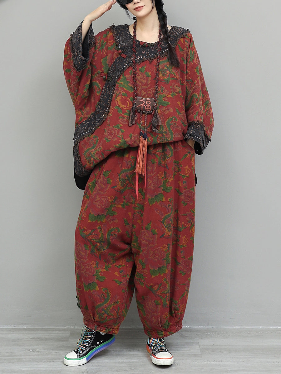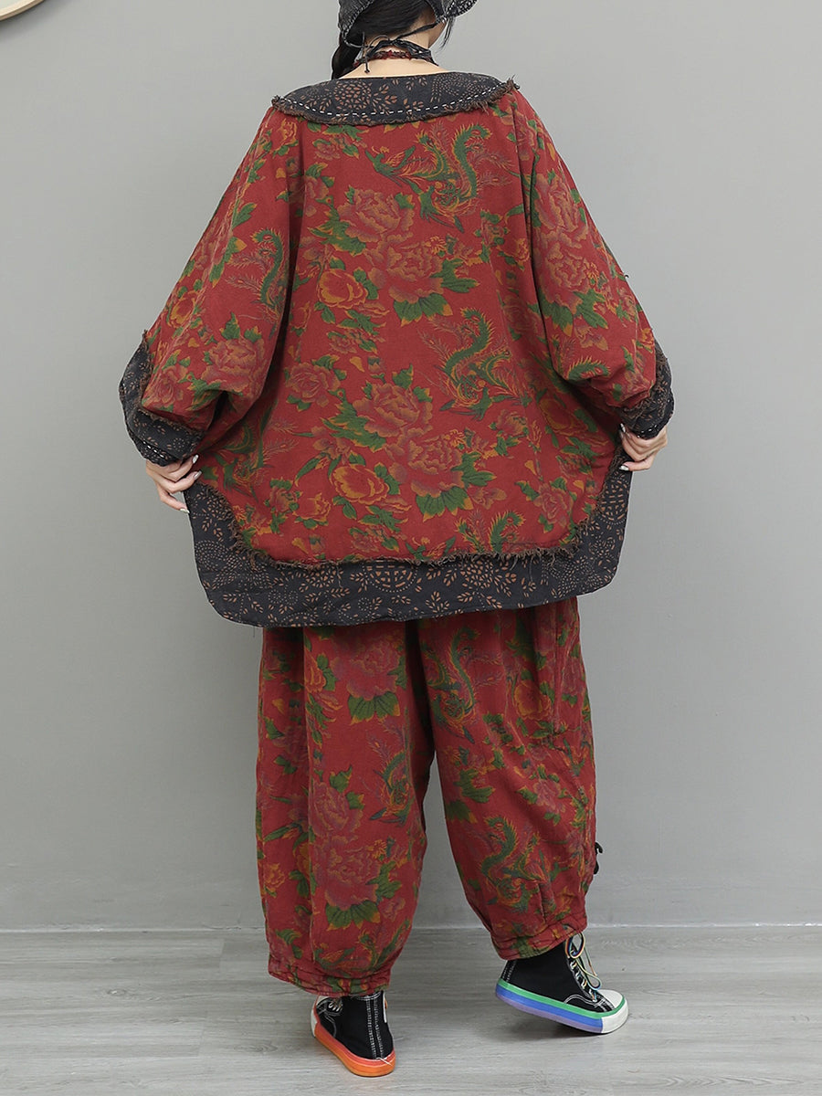 Trajes de invierno para mujer estilo retro con cuello redondo y estampado floral