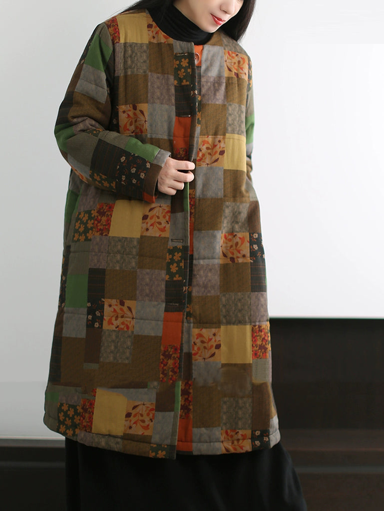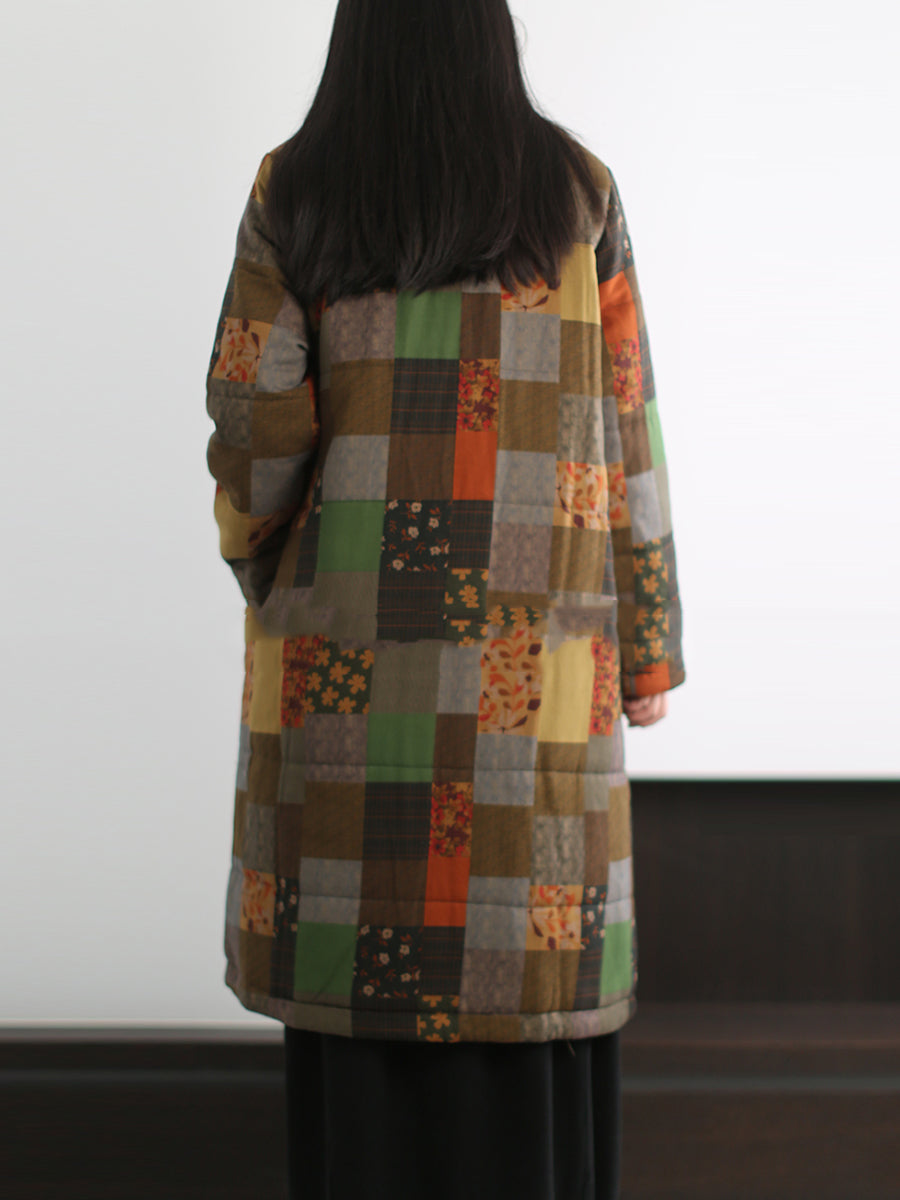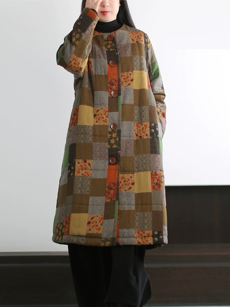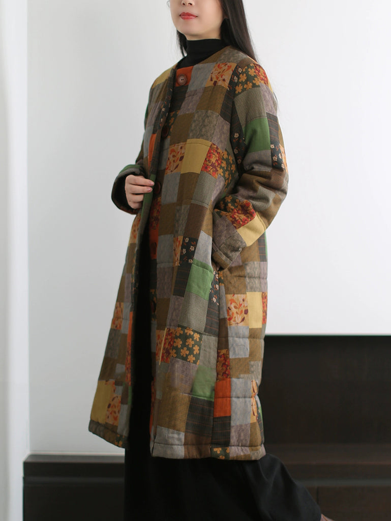 Abrigo largo de algodón con cuello redondo y estampado patchwork retro para mujer