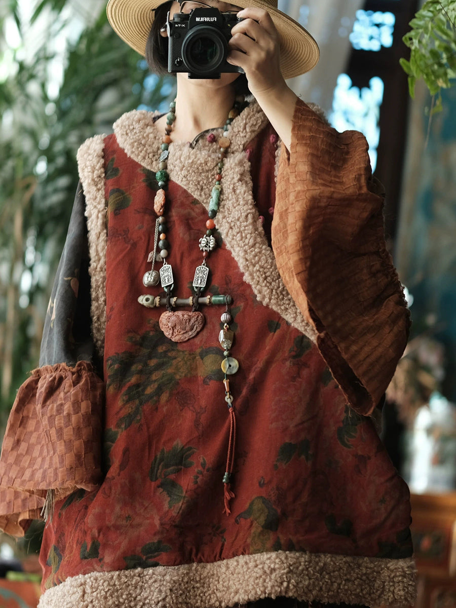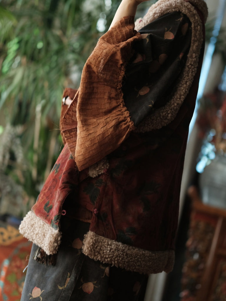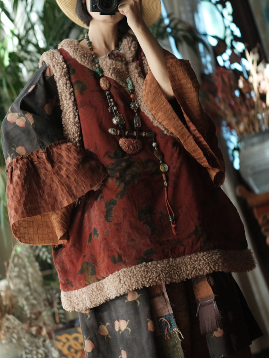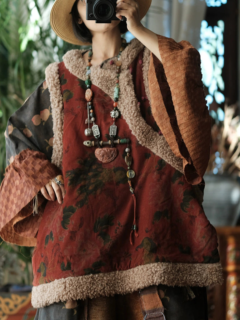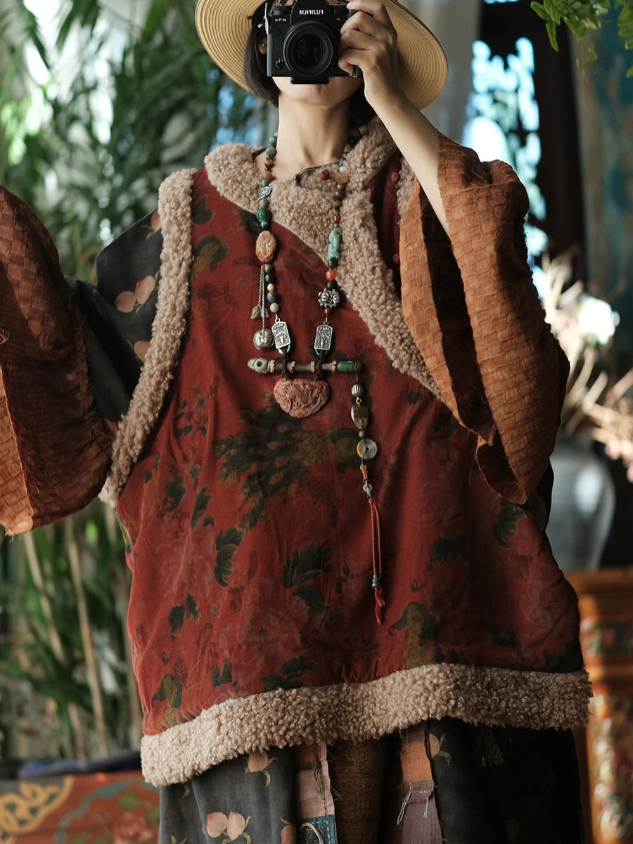 Chaleco acolchado de forro polar con flores vintage de invierno para mujer