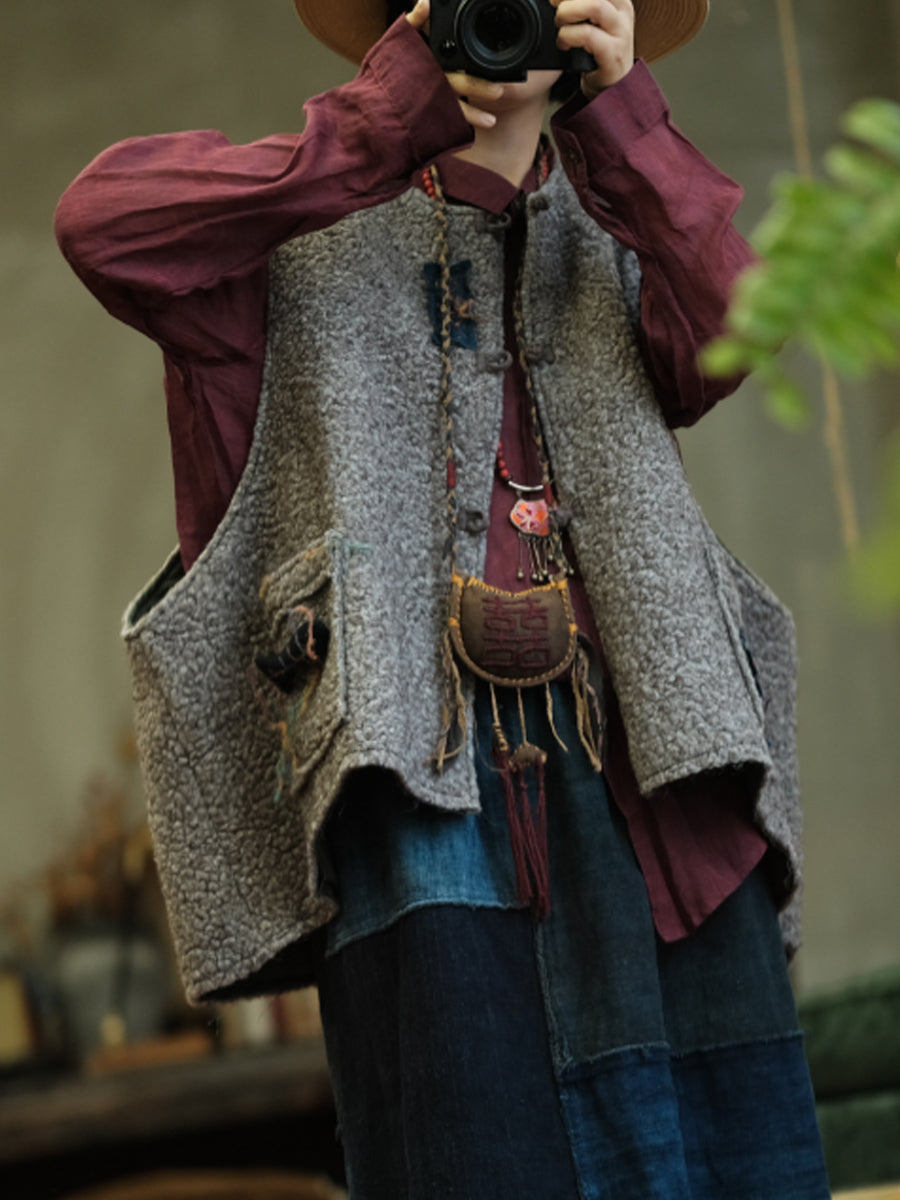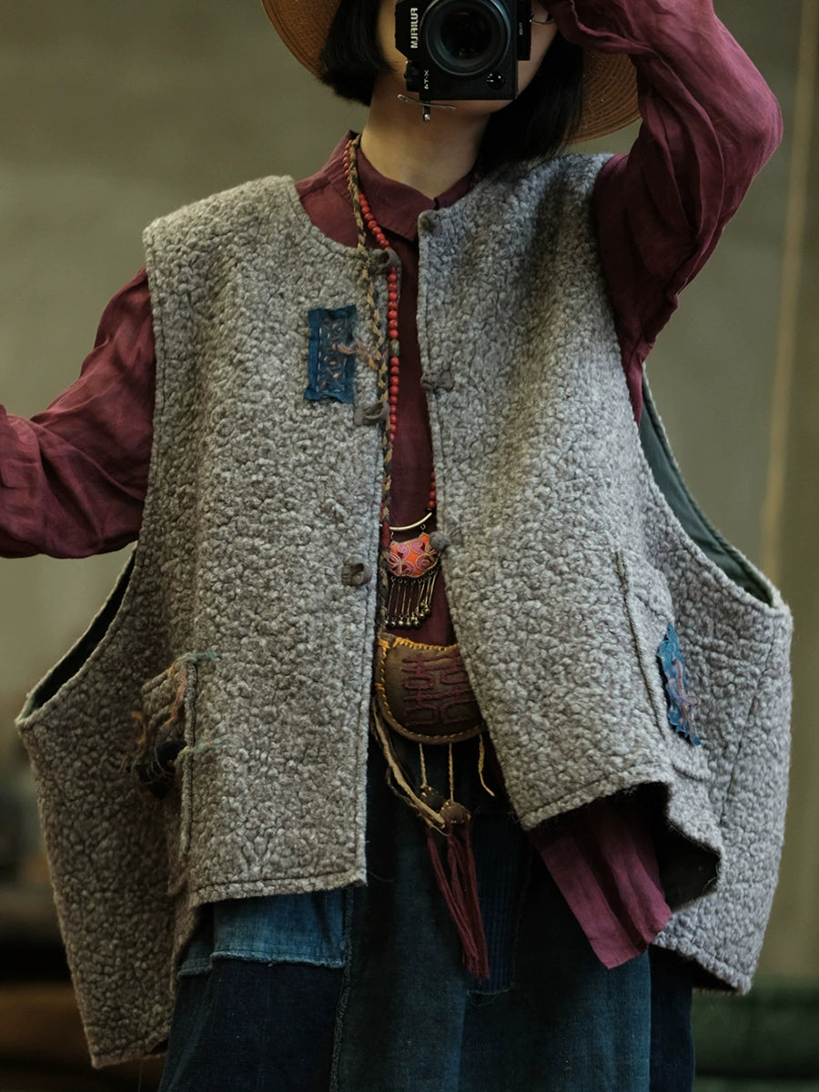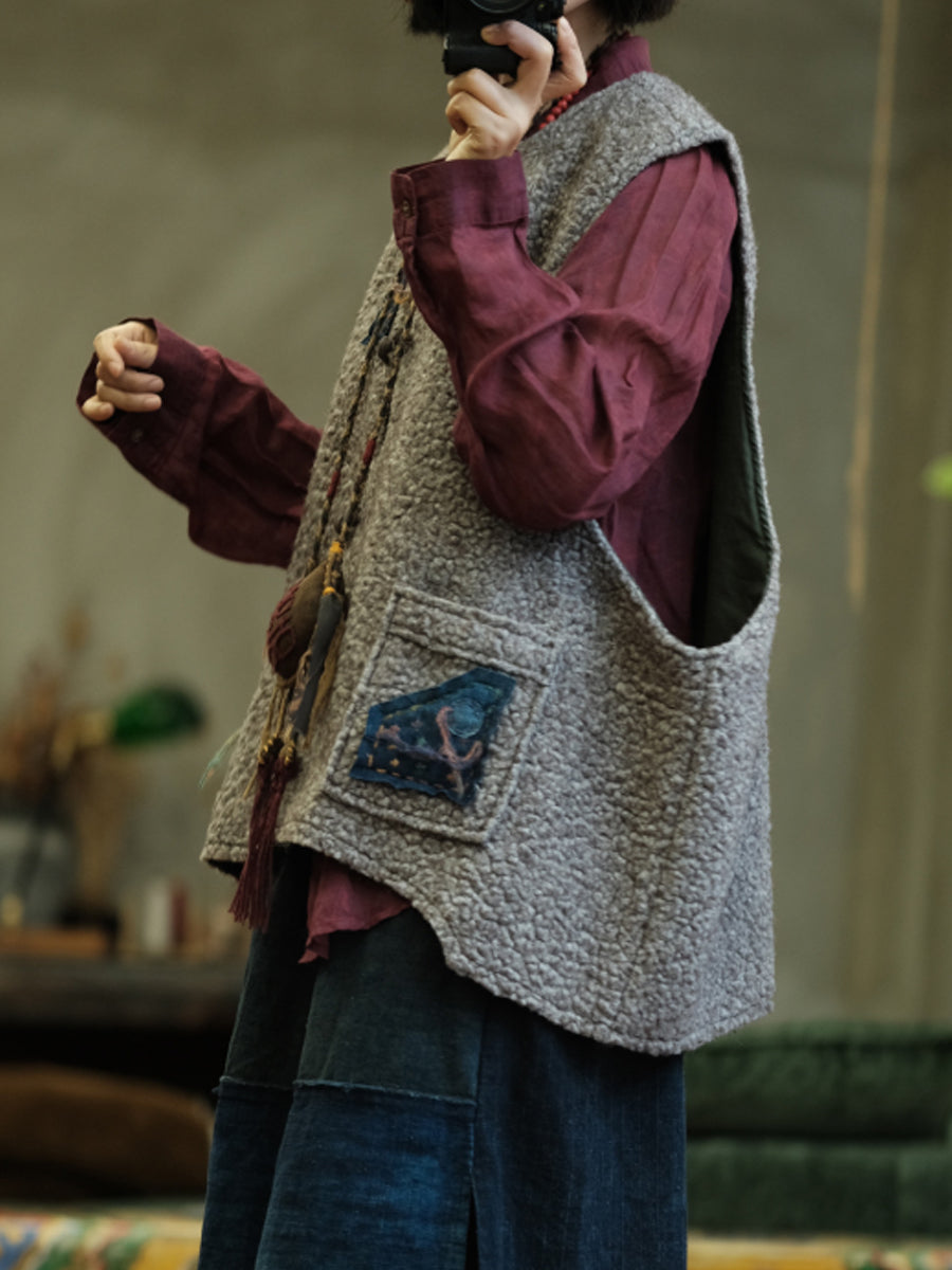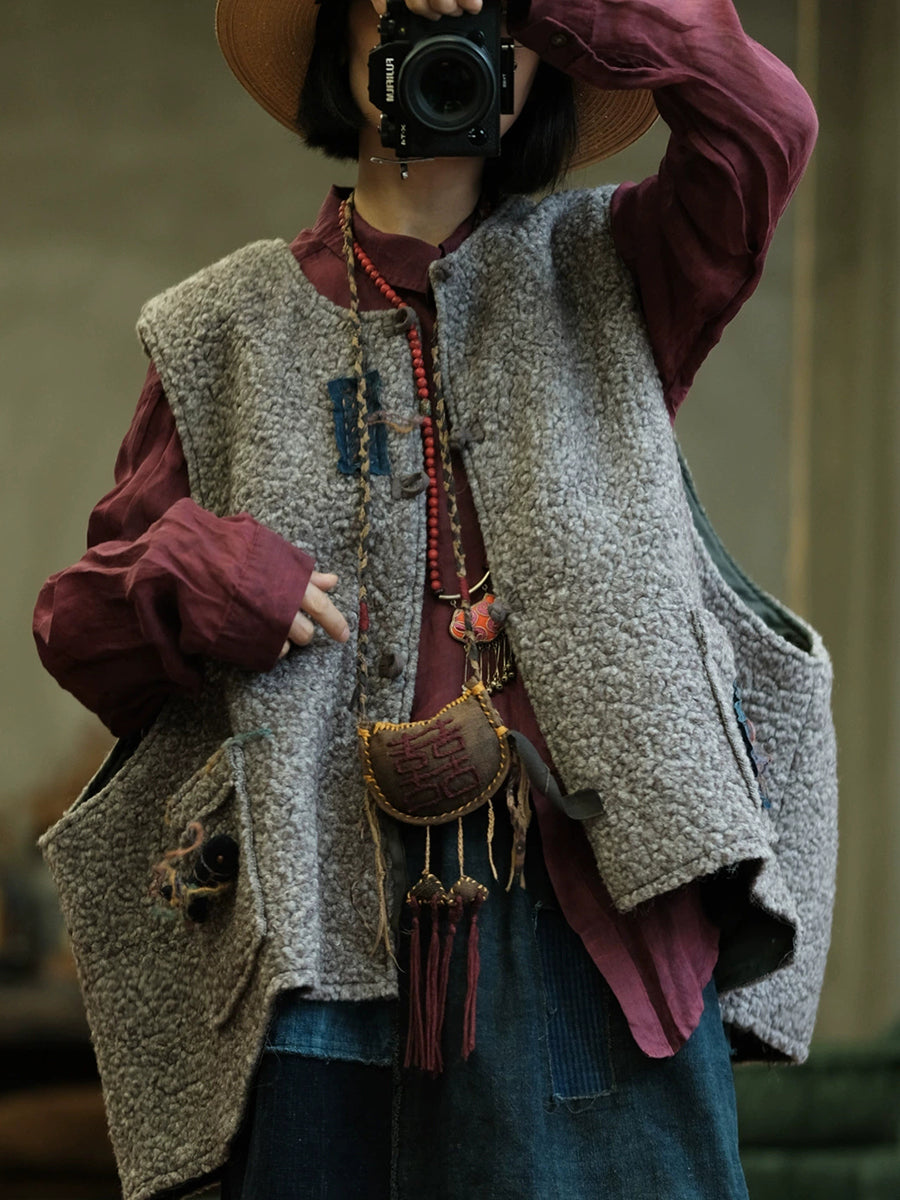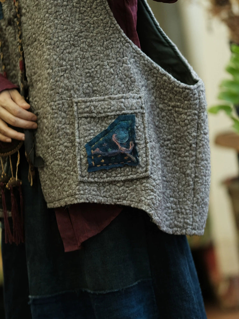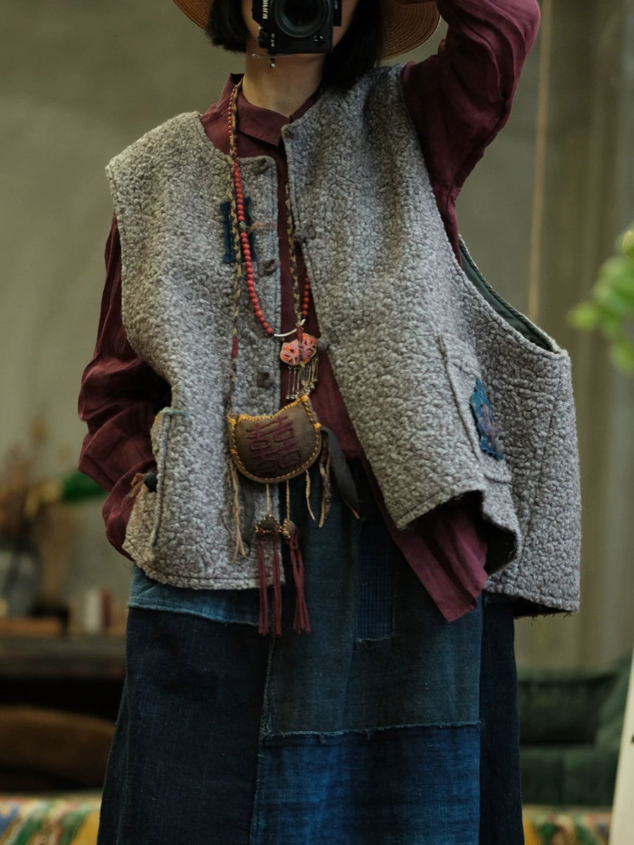 Chaleco de invierno vintage con cuello redondo de forro polar y parches para mujer