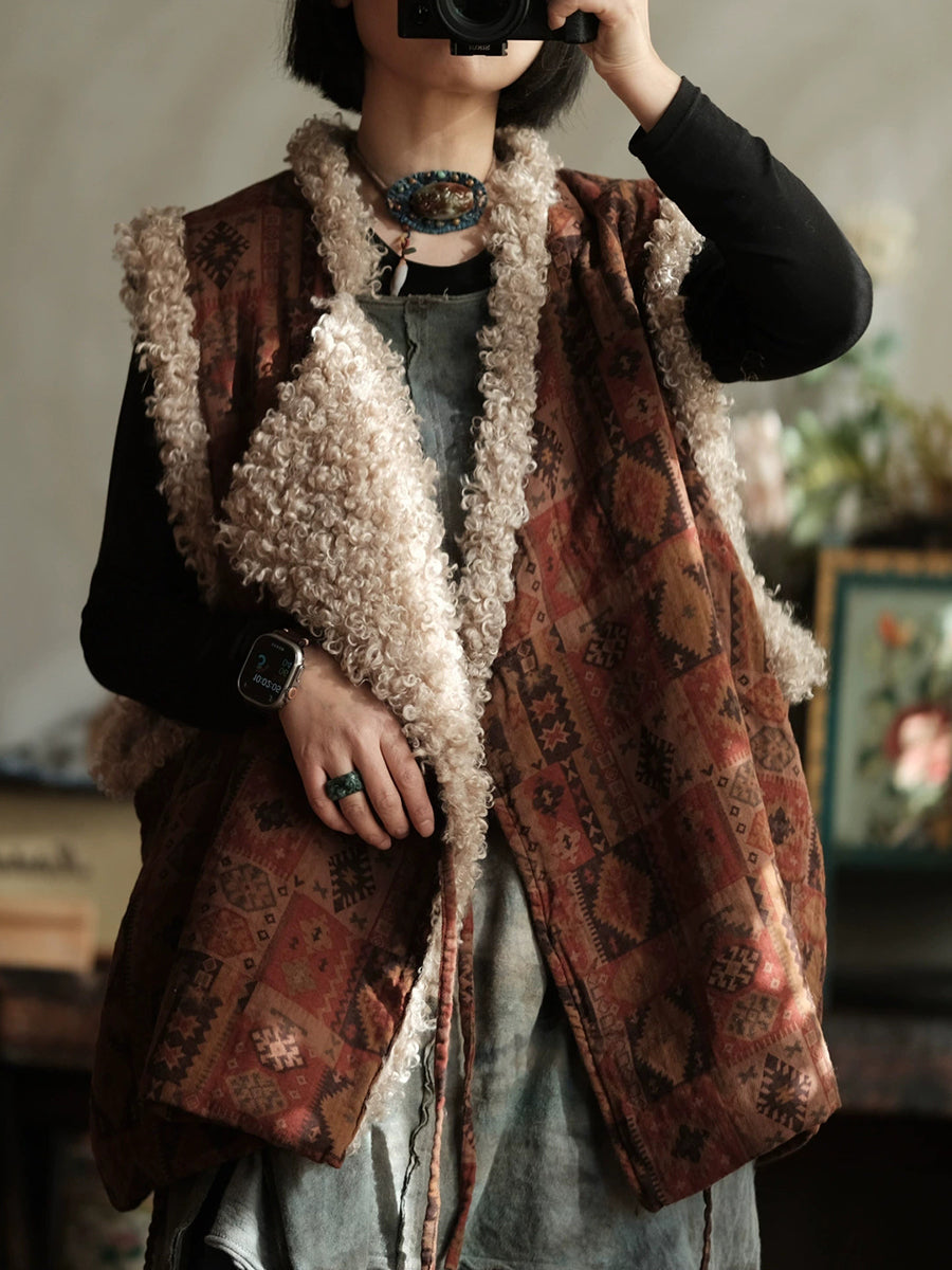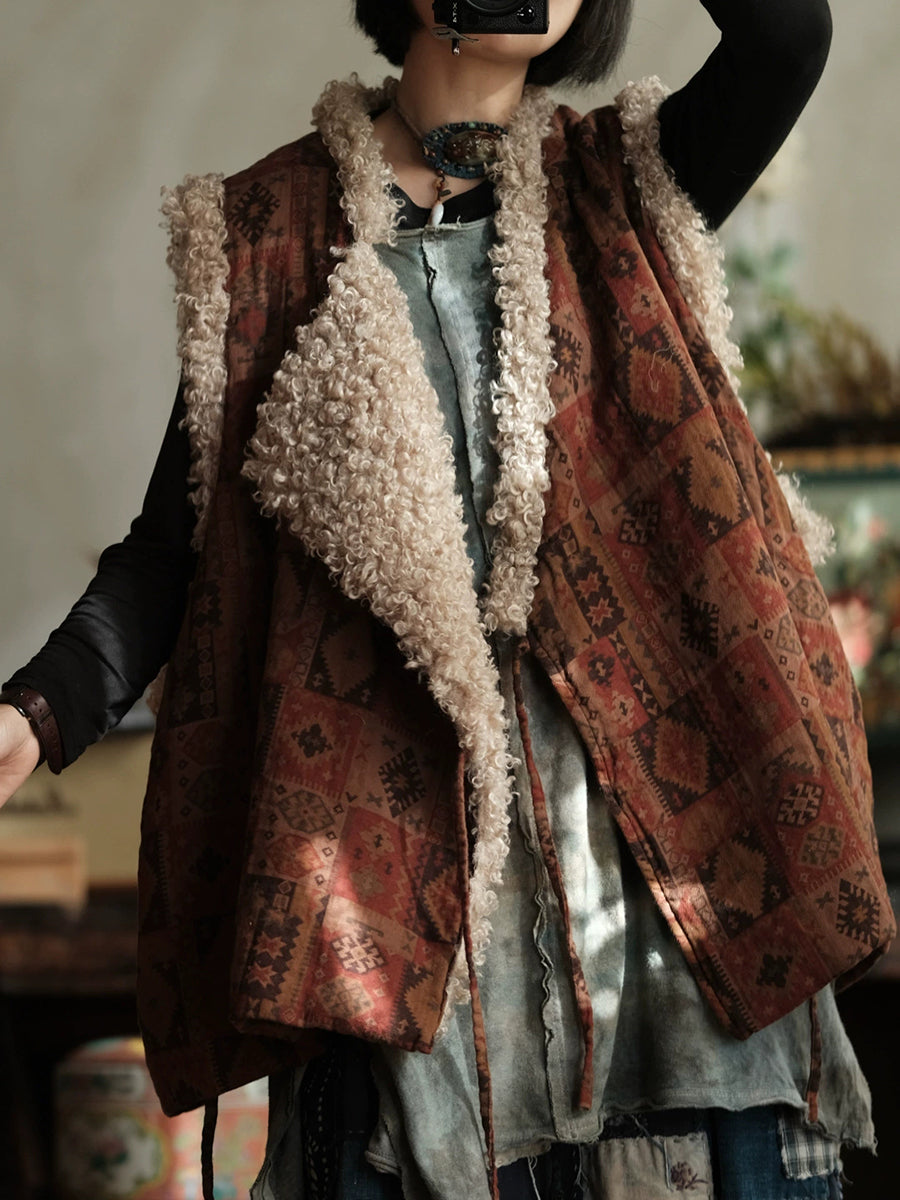 Chaleco polar con cuello en V y patchwork vintage de invierno para mujer