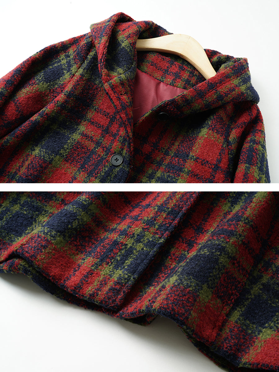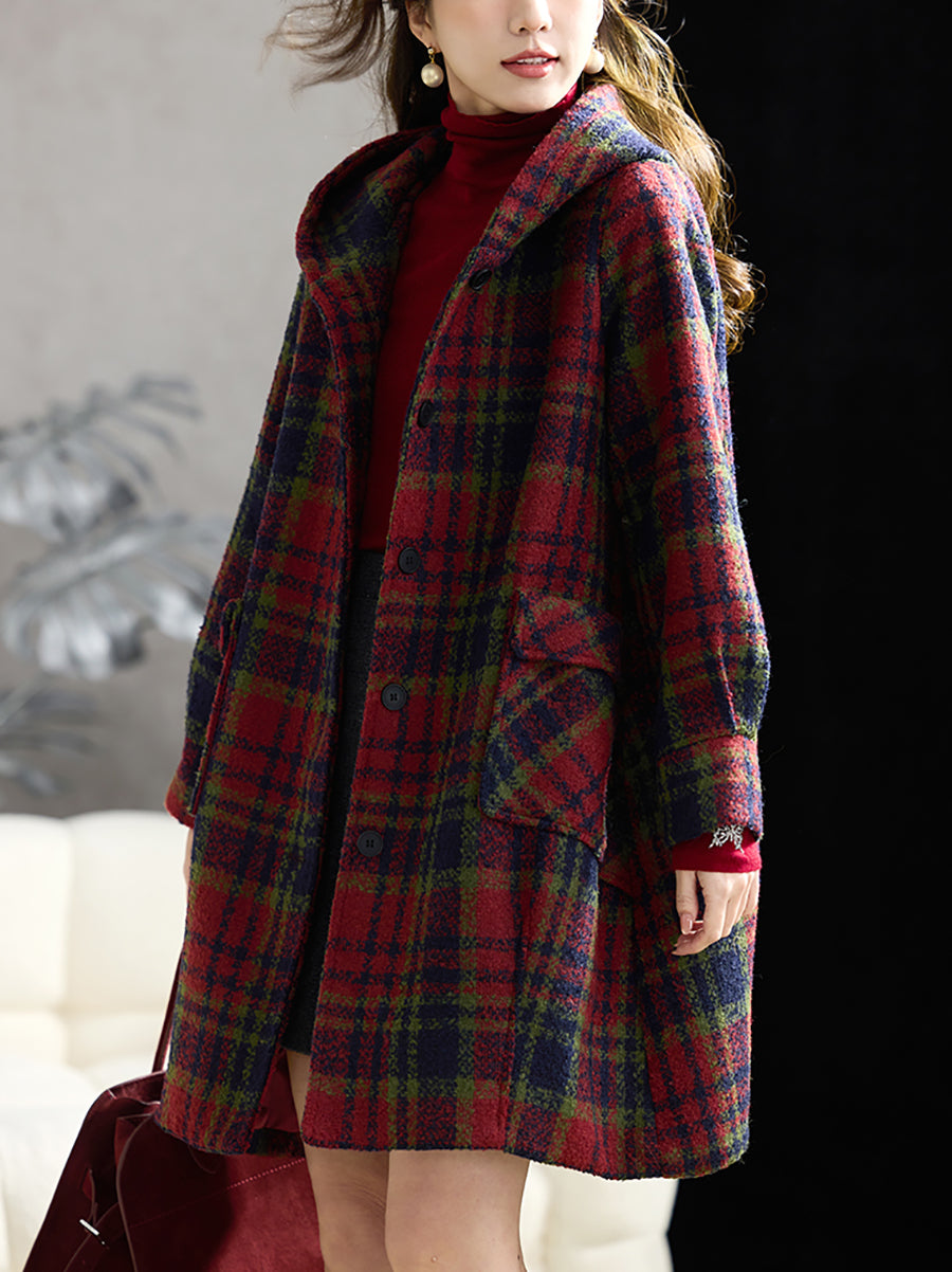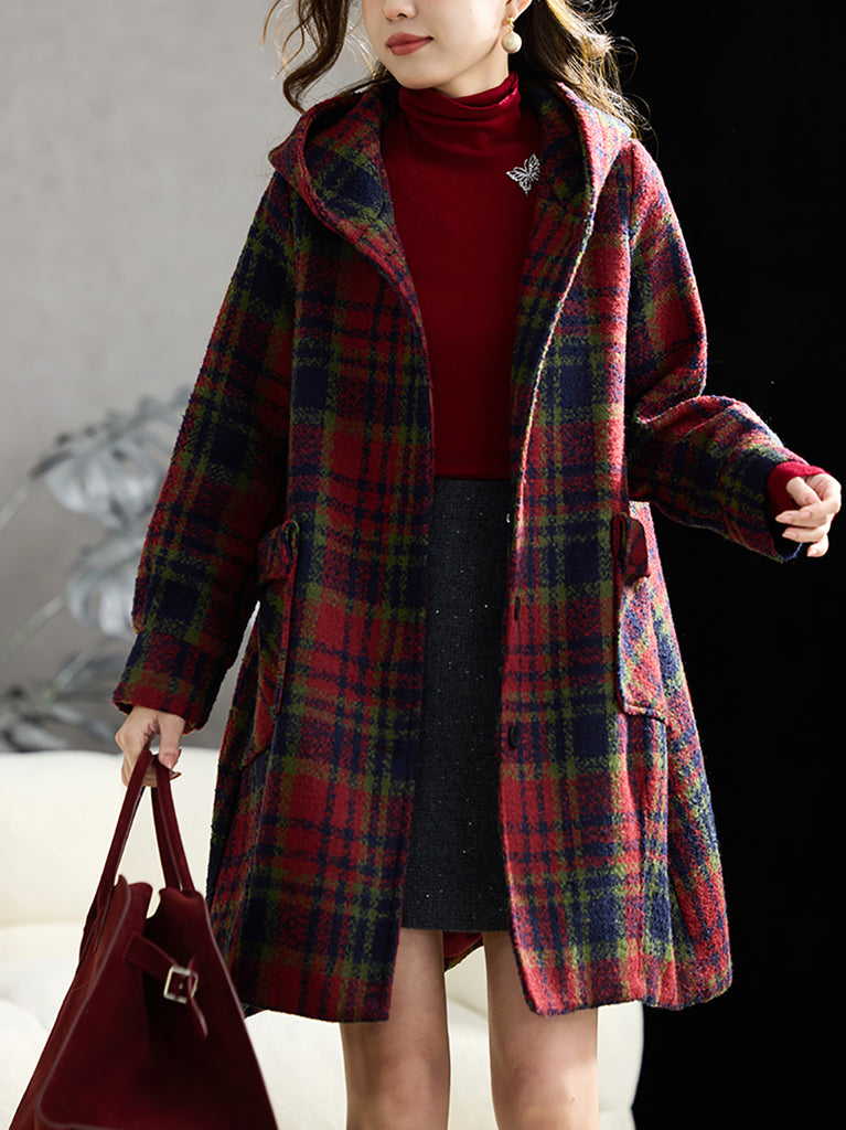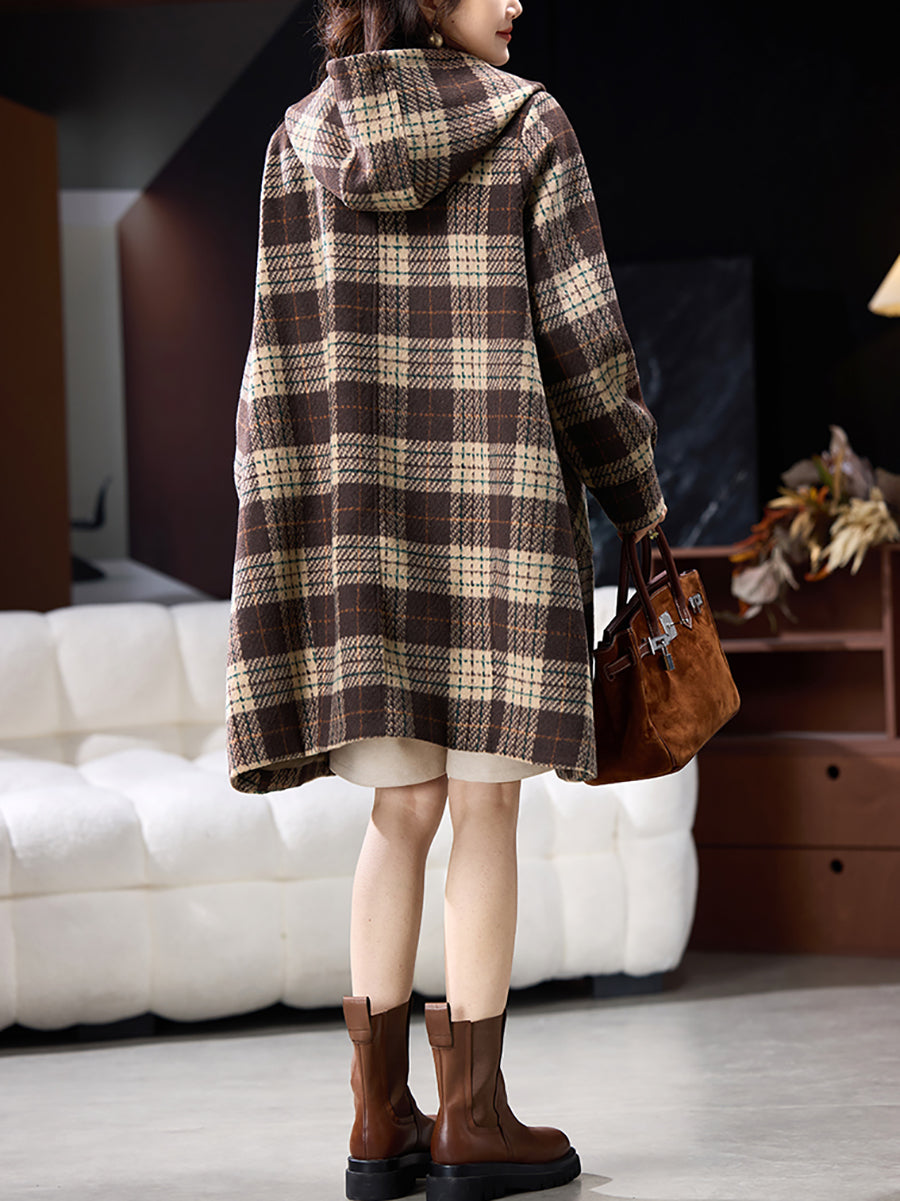 Abrigo de lana con capucha y estampado de cuadros vintage para mujer (invierno)