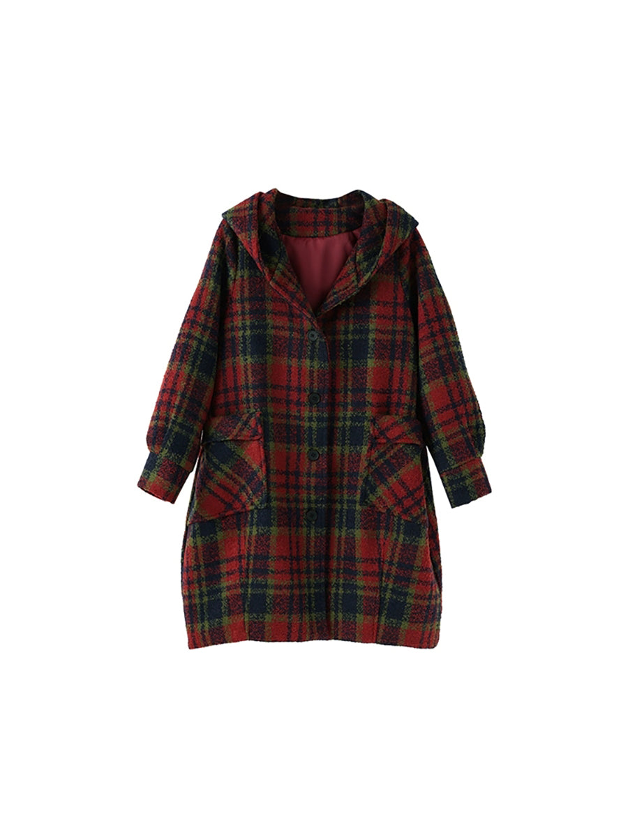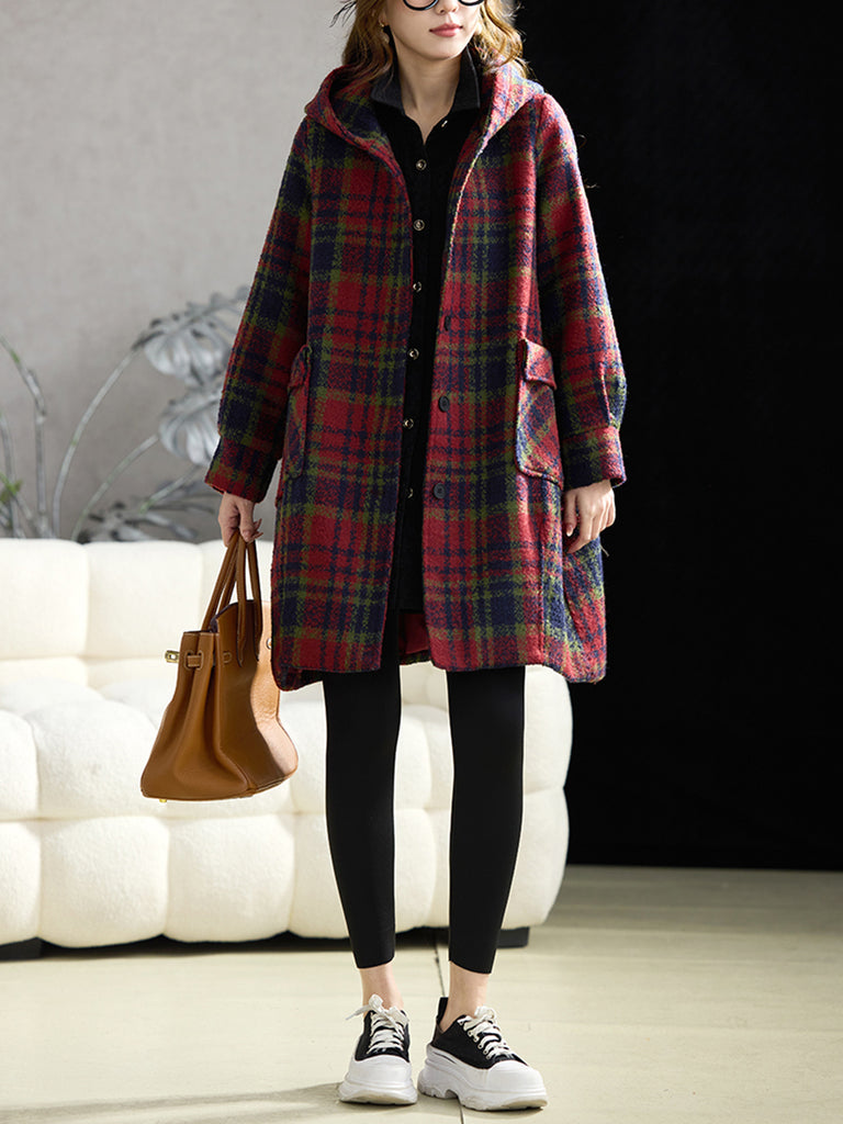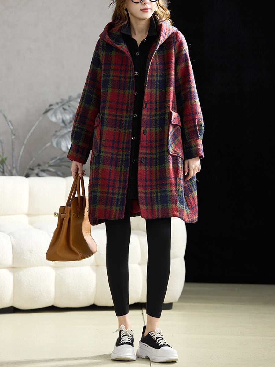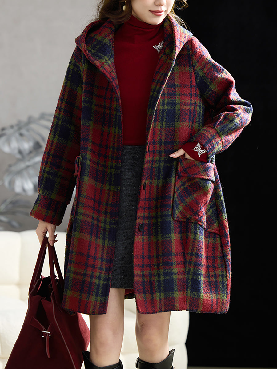 Abrigo de lana con capucha y estampado de cuadros vintage para mujer (invierno)