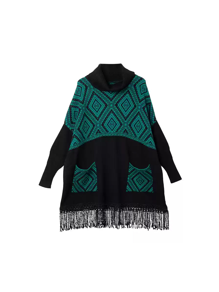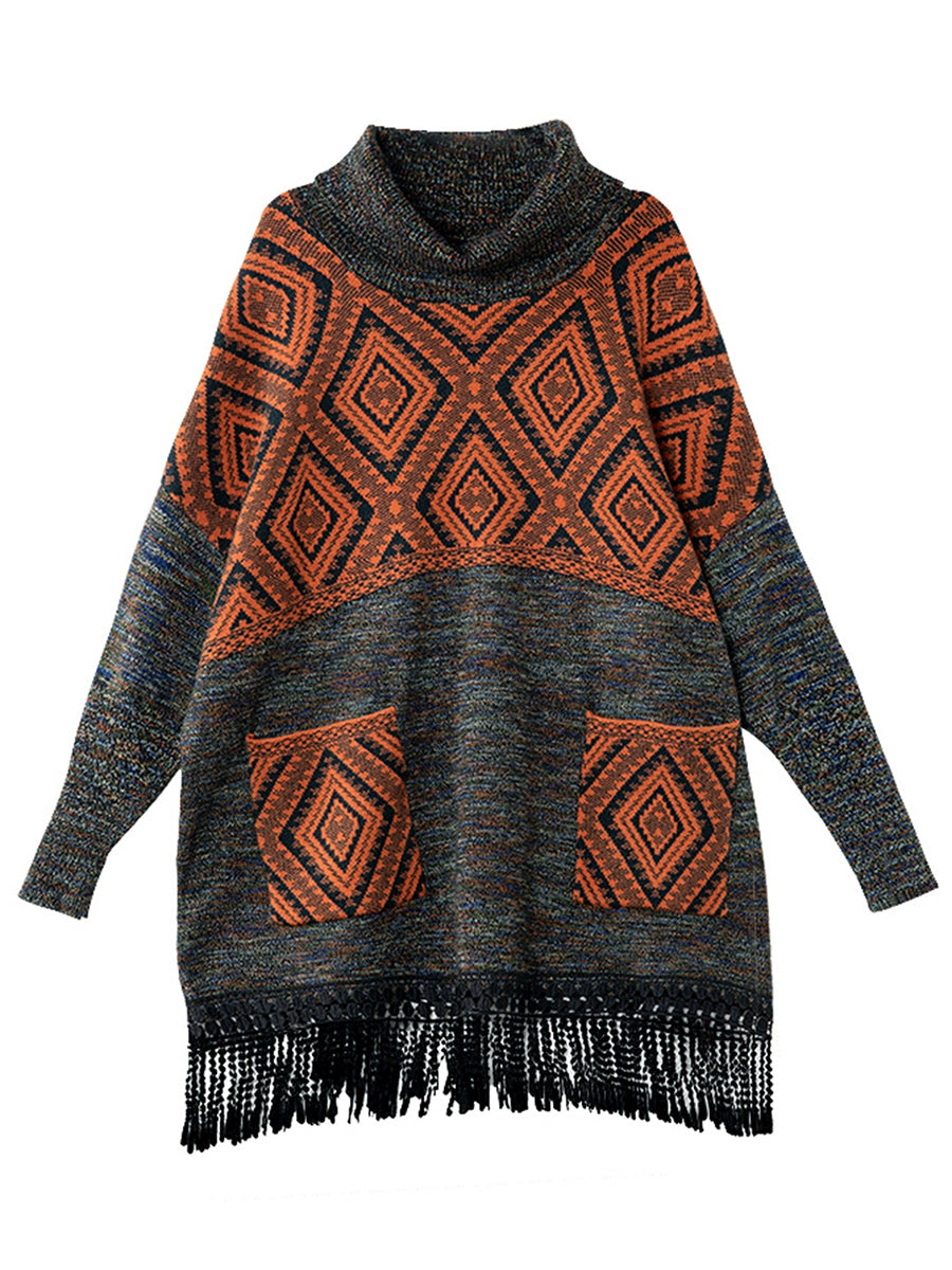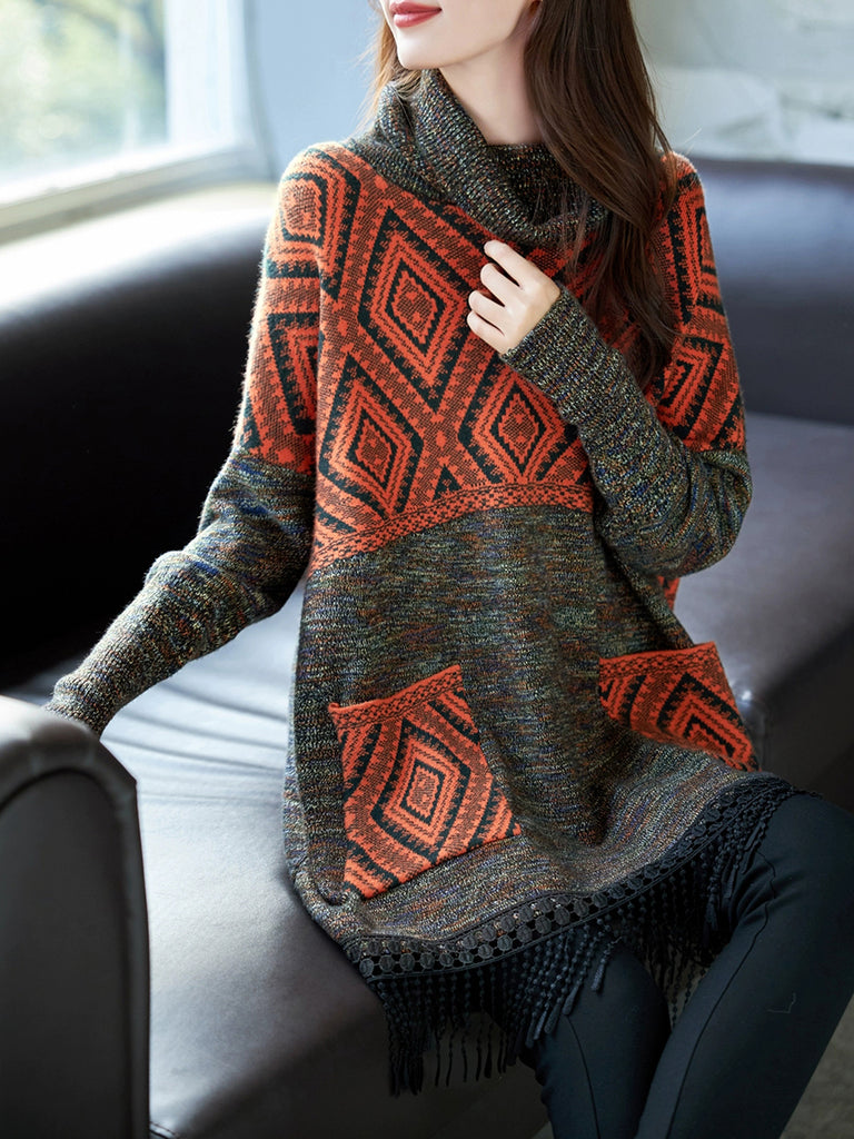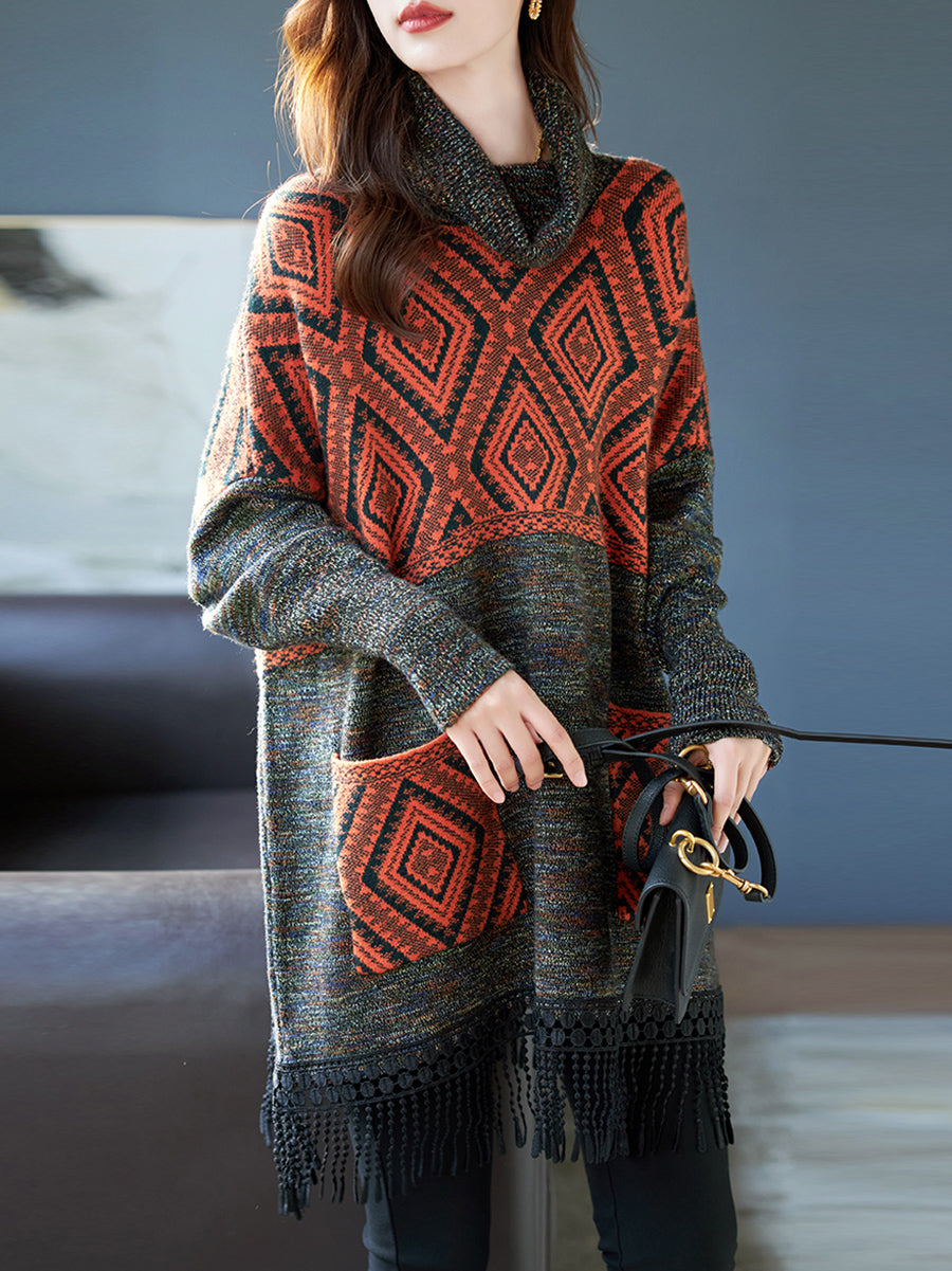 Suéter de cuello alto con borlas y diseño vintage de rombos para mujer (invierno)